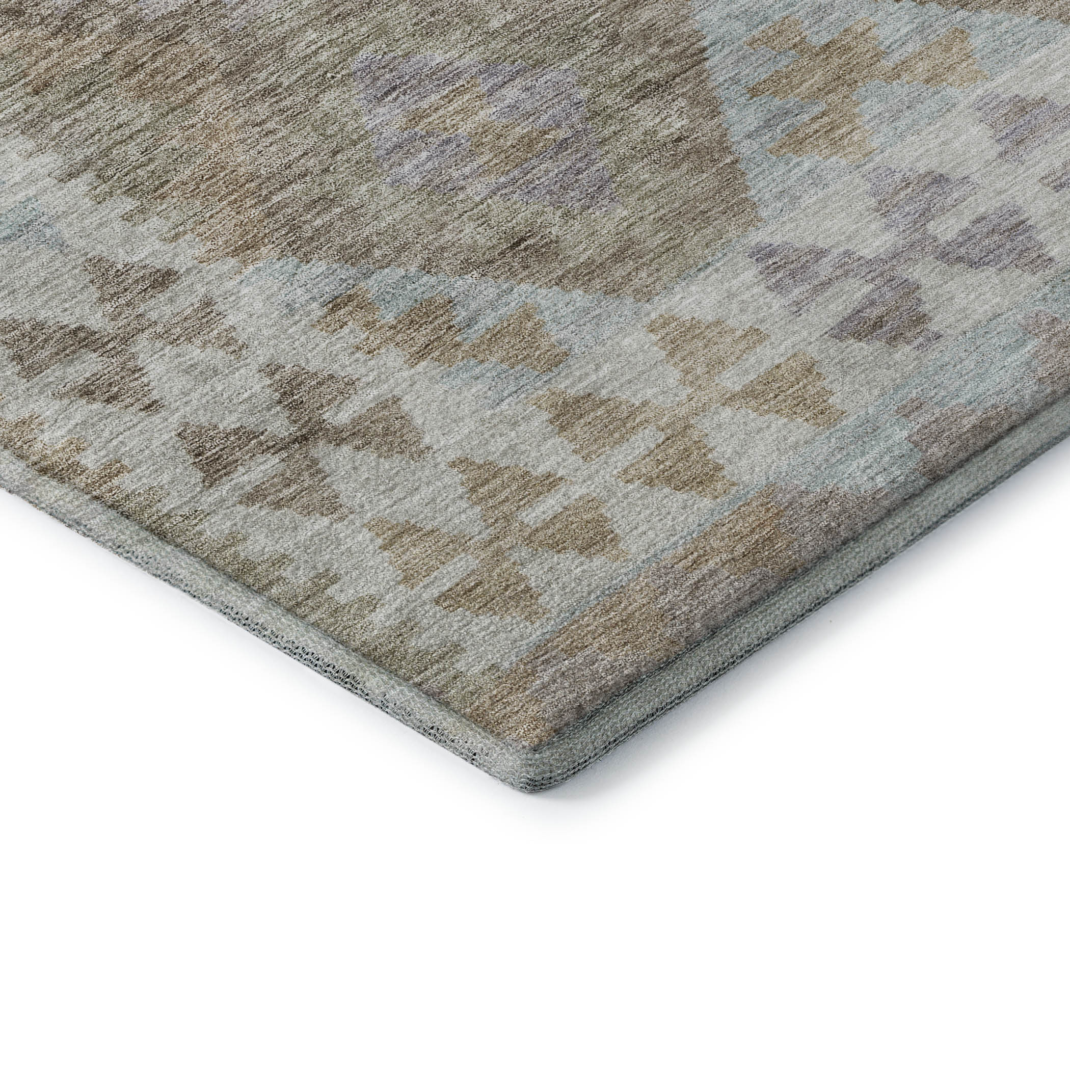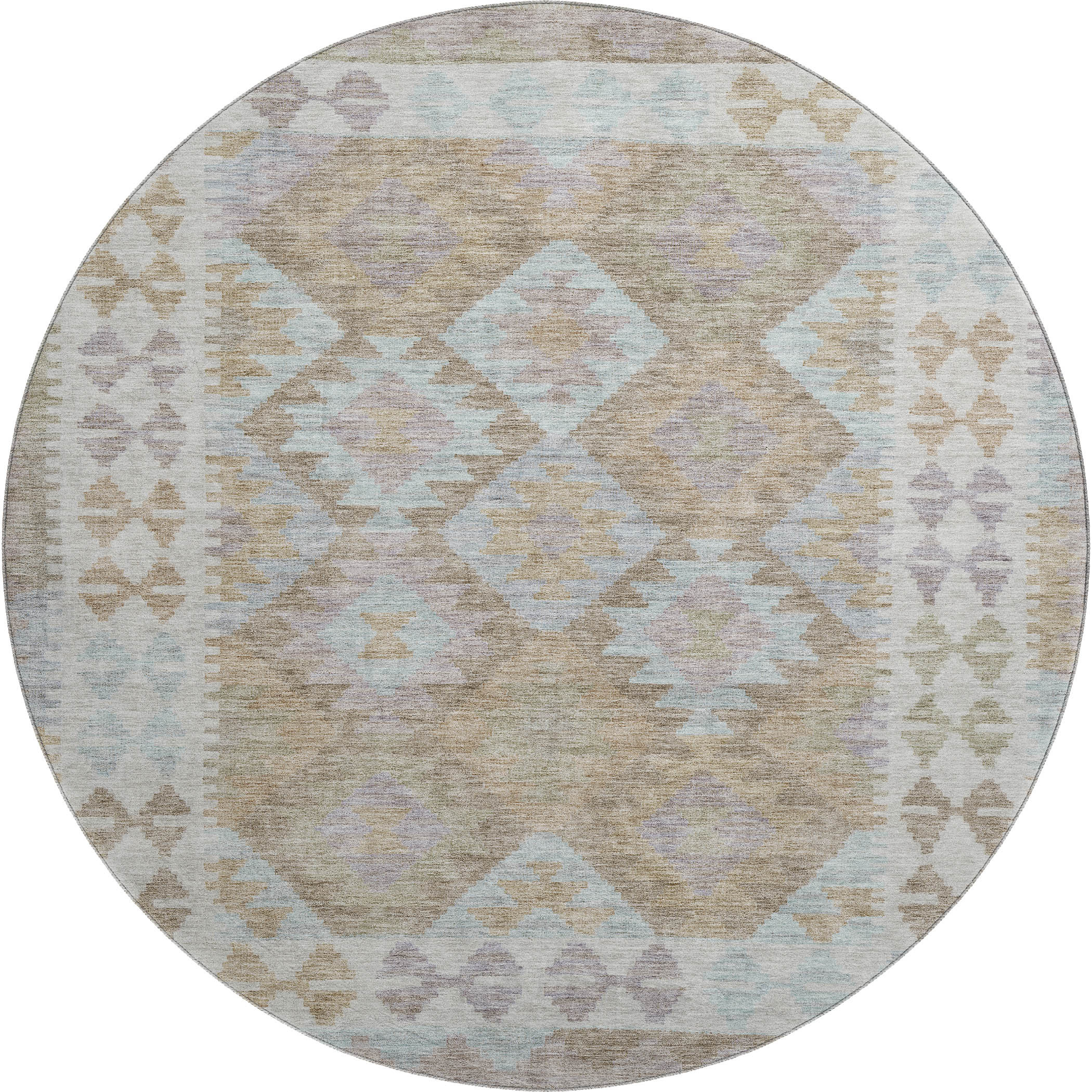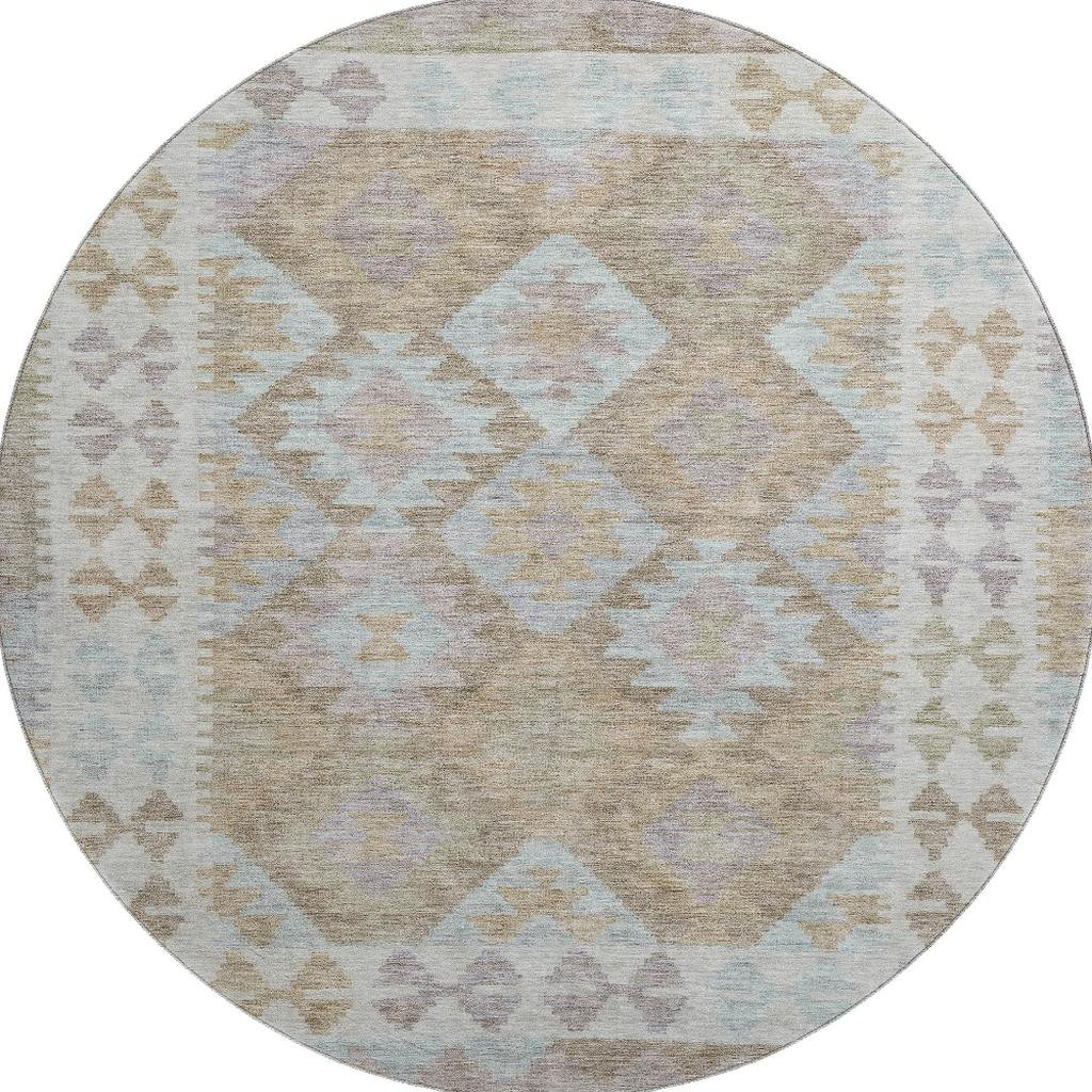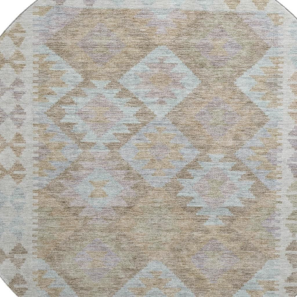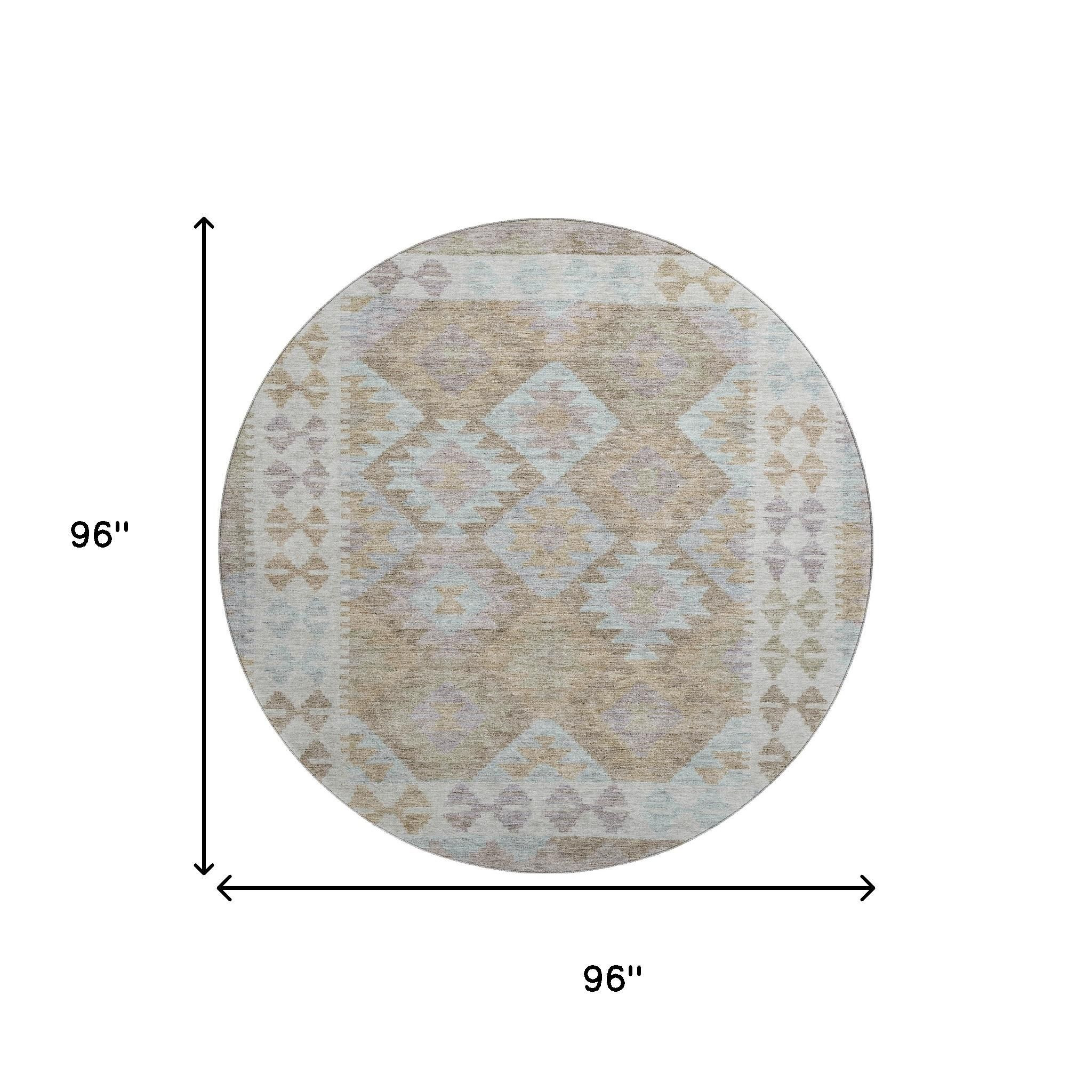 Set an inviting tone in your space with this 8-foot khaki and ivory tribal washable round rug with uv protection. Ideal for spaces with kids and pets, this rug is stain resistant to help repel dirt and spilled liquids. Built to last, this rug crafted from polyester fibers is known for its durability and long lasting appeal. Rugs are a great way to showcase your style, hide imperfections, warm your home and reduce noise. This larger sized, transitional styled rug is ready to create a focal point or statement piece in your room. 96.00-inch h x 96.00-inch w x 0.39-inch d.
