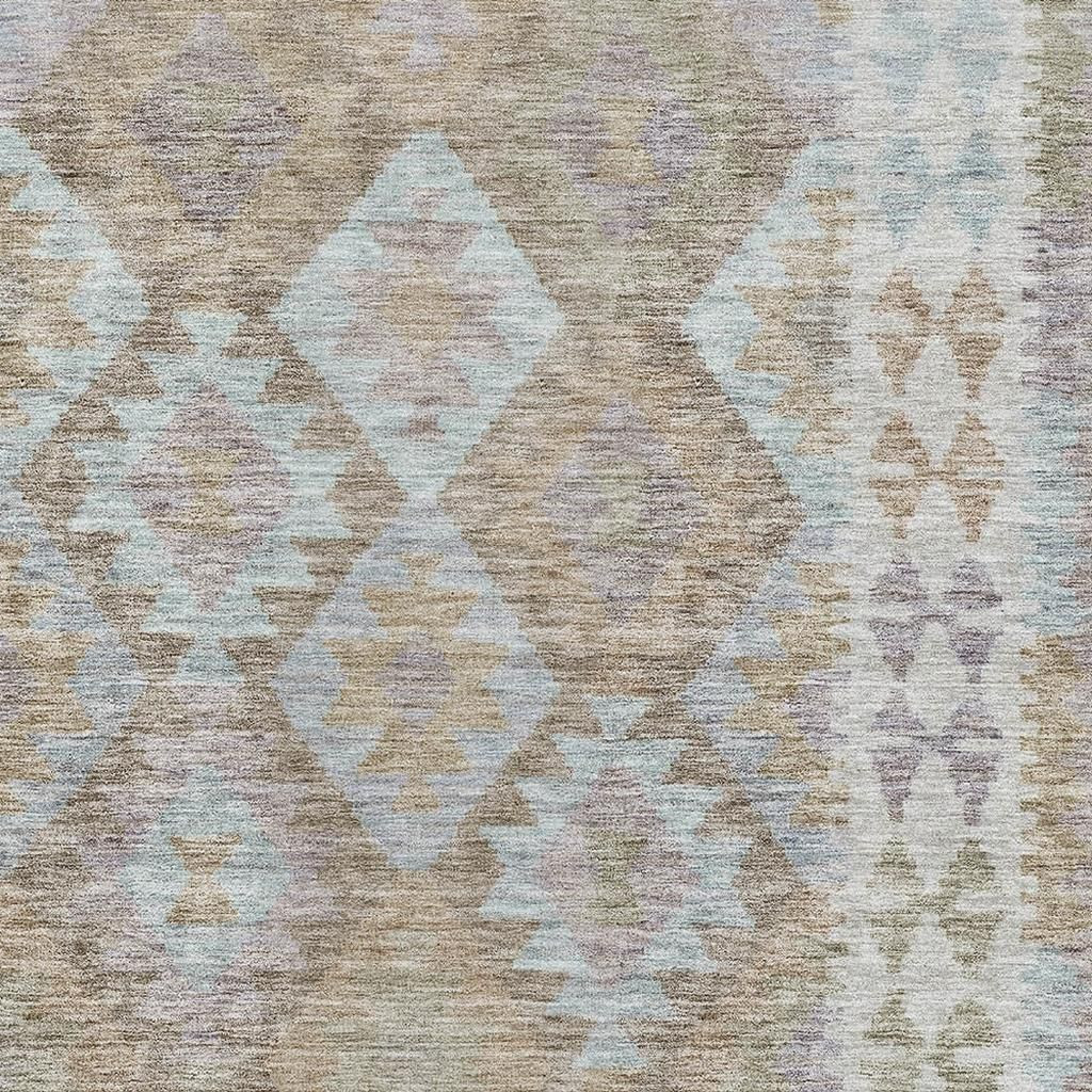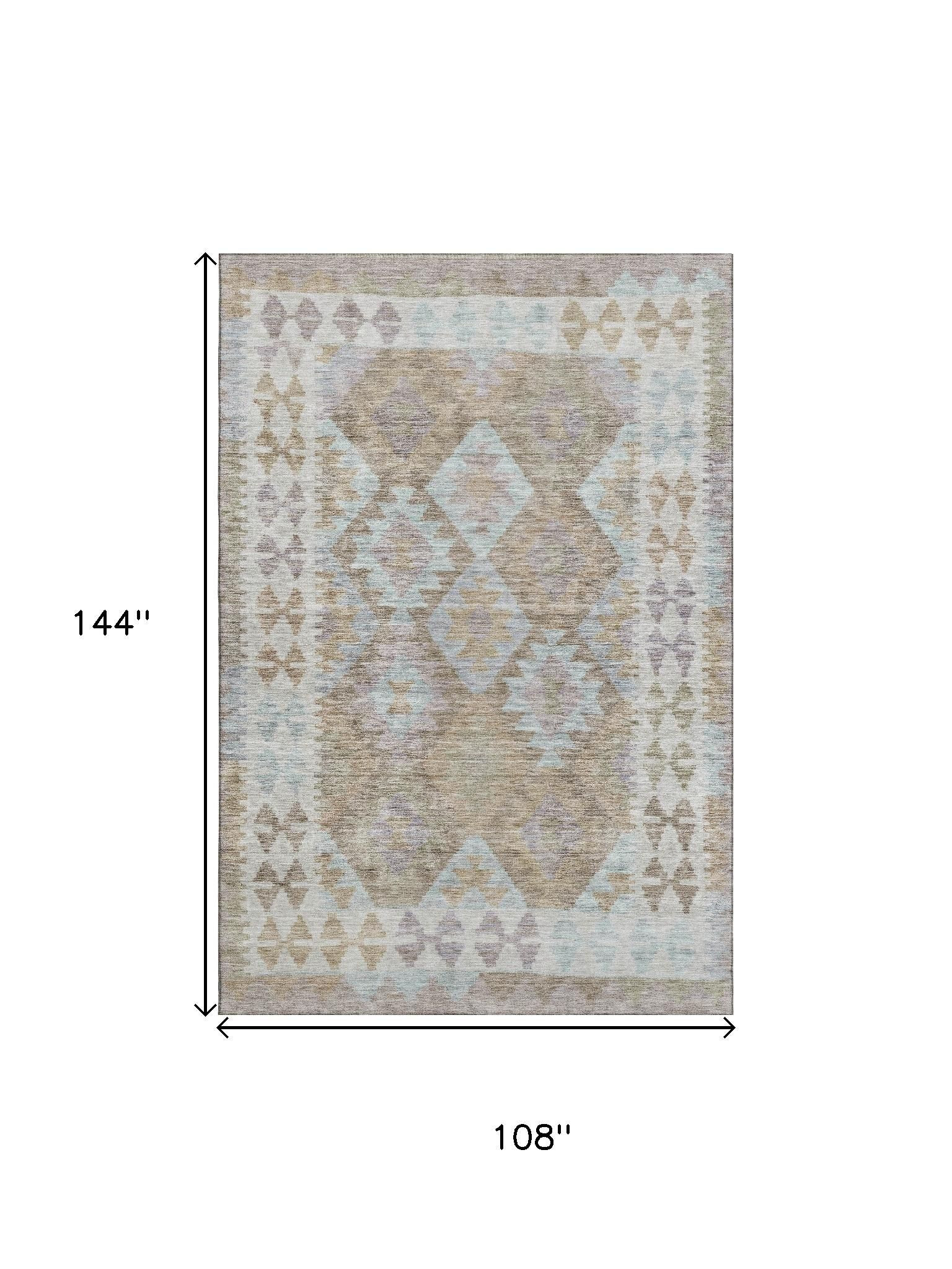 This 9-foot x 12-foot khaki and ivory tribal washable area rug with uv protection, is a great way to add warmth to a room. Ideal for spaces with kids and pets, this rug is stain resistant to help repel dirt and spilled liquids. Built to last, this rug crafted from polyester fibers is known for its durability and long lasting appeal. Rugs are a great way to showcase your style, hide imperfections, warm your home and reduce noise. This larger sized, transitional styled rug is ready to create a focal point or statement piece in your room. 108.00-inch h x 144.00-inch w x 0.39-inch d.