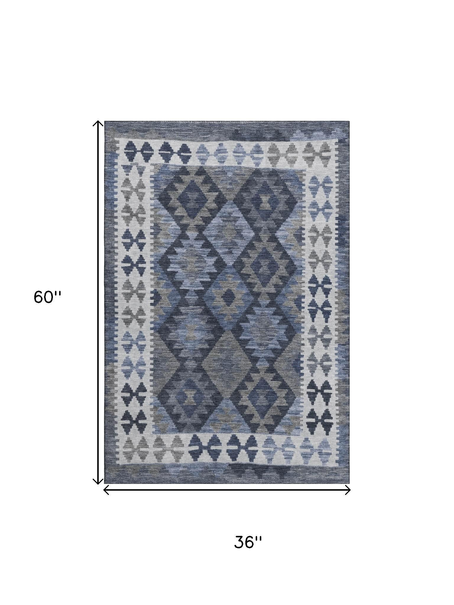 Add great coloration and comfortable texture to your space with this 3-foot x 5-foot navy blue and ivory tribal washable area rug with uv protection. Ideal for spaces with kids and pets, this rug is stain resistant to help repel dirt and spilled liquids. Built to last, this rug crafted from polyester fibers is known for its durability and long lasting appeal. Rugs are a great way to showcase your style, hide imperfections, warm your home and reduce noise. This smaller sized, transitional styled rug is just what you need for your walkway, bedside, in front of door, cabinet, refrigerator, or chair. 36.00-inch h x 60.00-inch w x 0.39-inch d.
