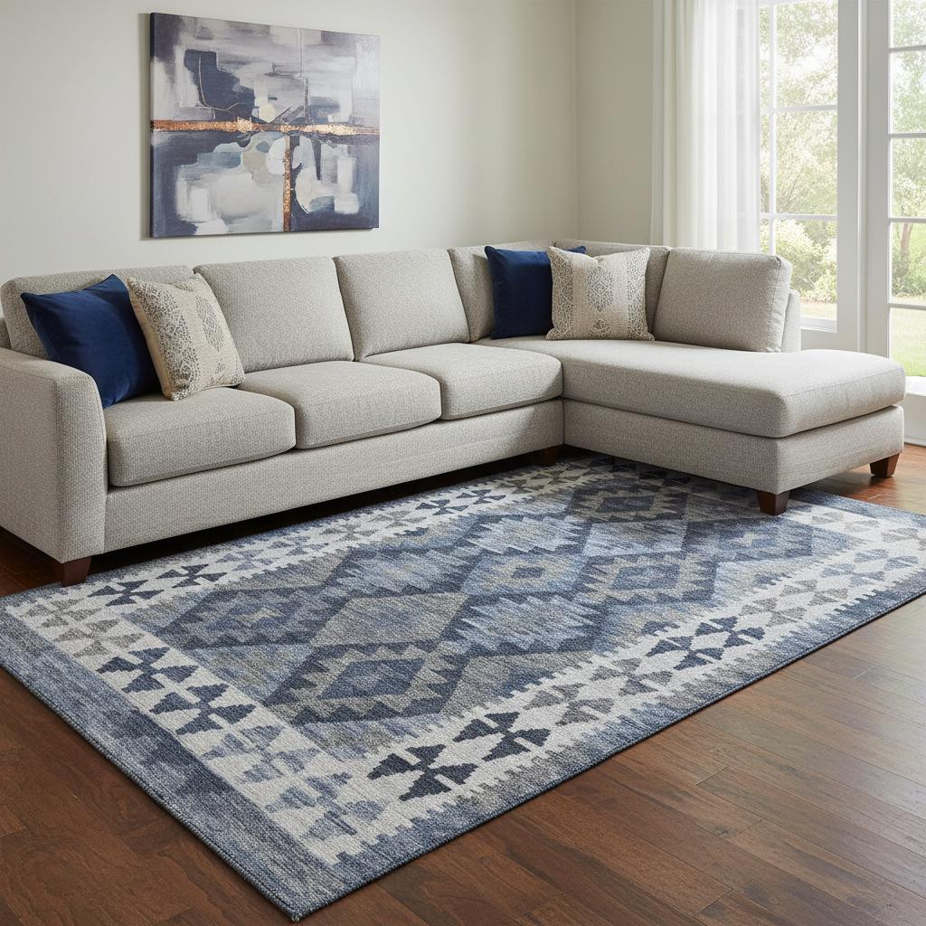 Add great coloration and comfortable texture to your space with this 8-foot x 10-foot navy blue and ivory tribal washable area rug with uv protection. Ideal for spaces with kids and pets, this rug is stain resistant to help repel dirt and spilled liquids. Built to last, this rug crafted from polyester fibers is known for its durability and long lasting appeal. Rugs are a great way to showcase your style, hide imperfections, warm your home and reduce noise. This larger sized, transitional styled rug is ready to create a focal point or statement piece in your room. 96.00-inch h x 120.00-inch w x 0.39-inch d.