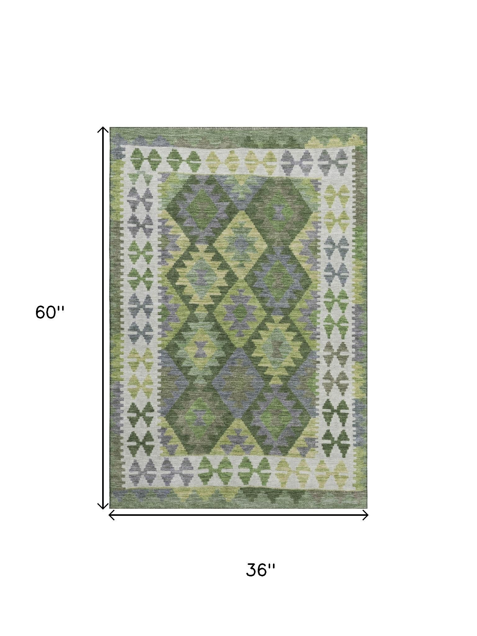 Add great coloration and comfortable texture to your space with this 3-foot x 5-foot olive green and ivory tribal washable area rug with uv protection. Ideal for spaces with kids and pets, this rug is stain resistant to help repel dirt and spilled liquids. Built to last, this rug crafted from polyester fibers is known for its durability and long lasting appeal. Rugs are a great way to showcase your style, hide imperfections, warm your home and reduce noise. This smaller sized, transitional styled rug is just what you need for your walkway, bedside, in front of door, cabinet, refrigerator, or chair. 36.00-inch h x 60.00-inch w x 0.39-inch d.