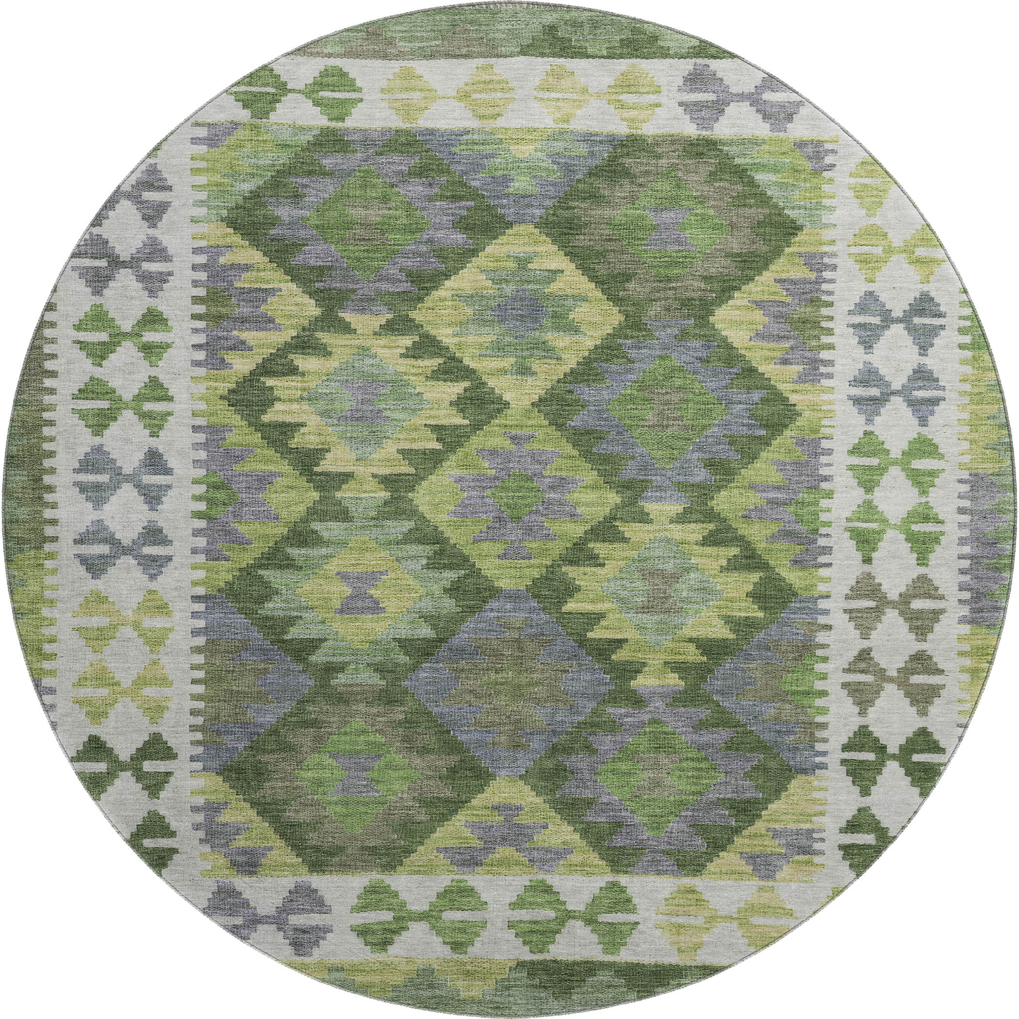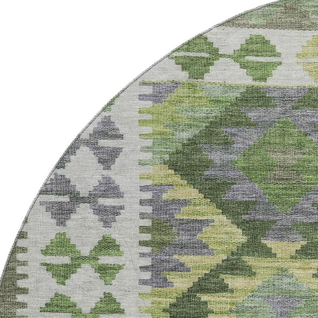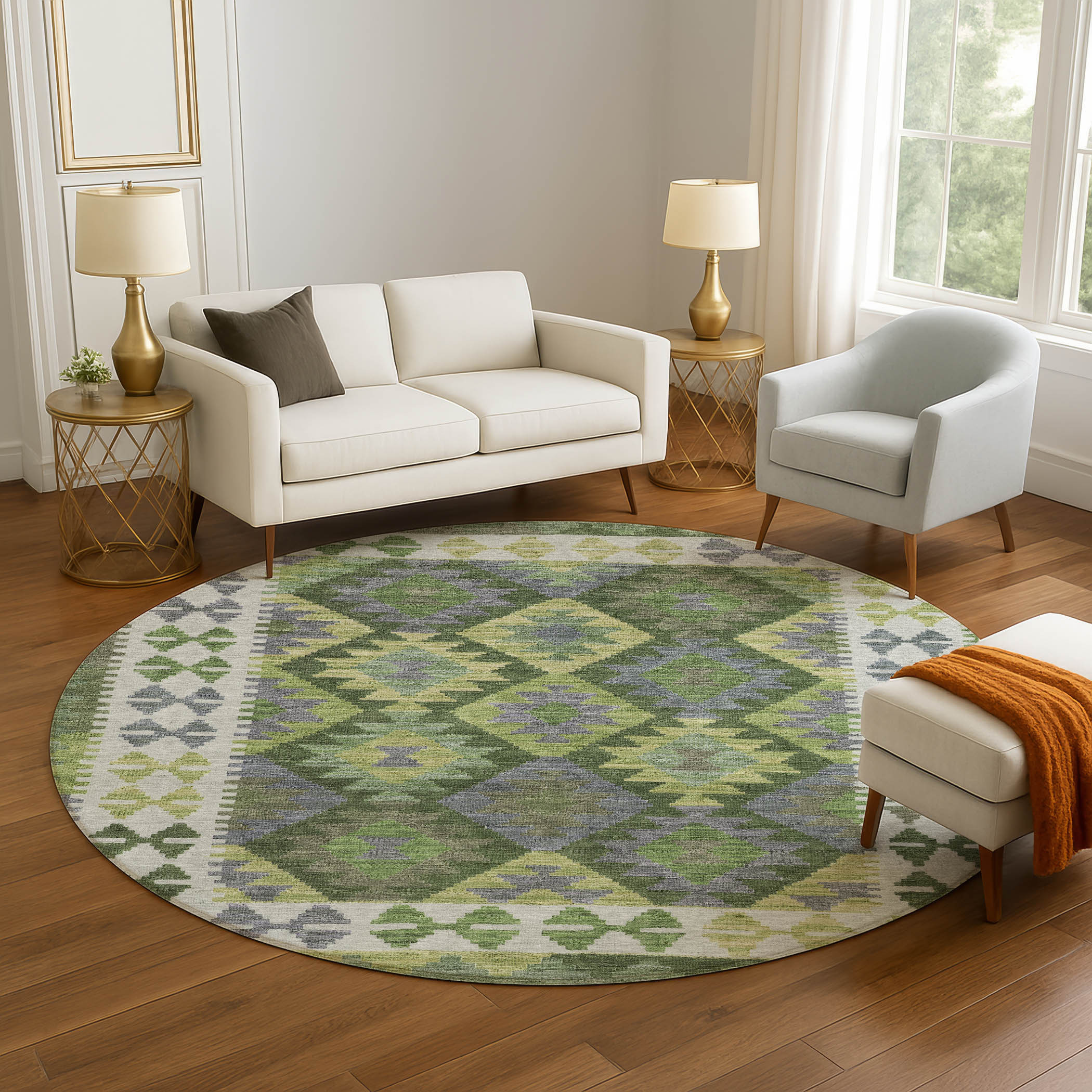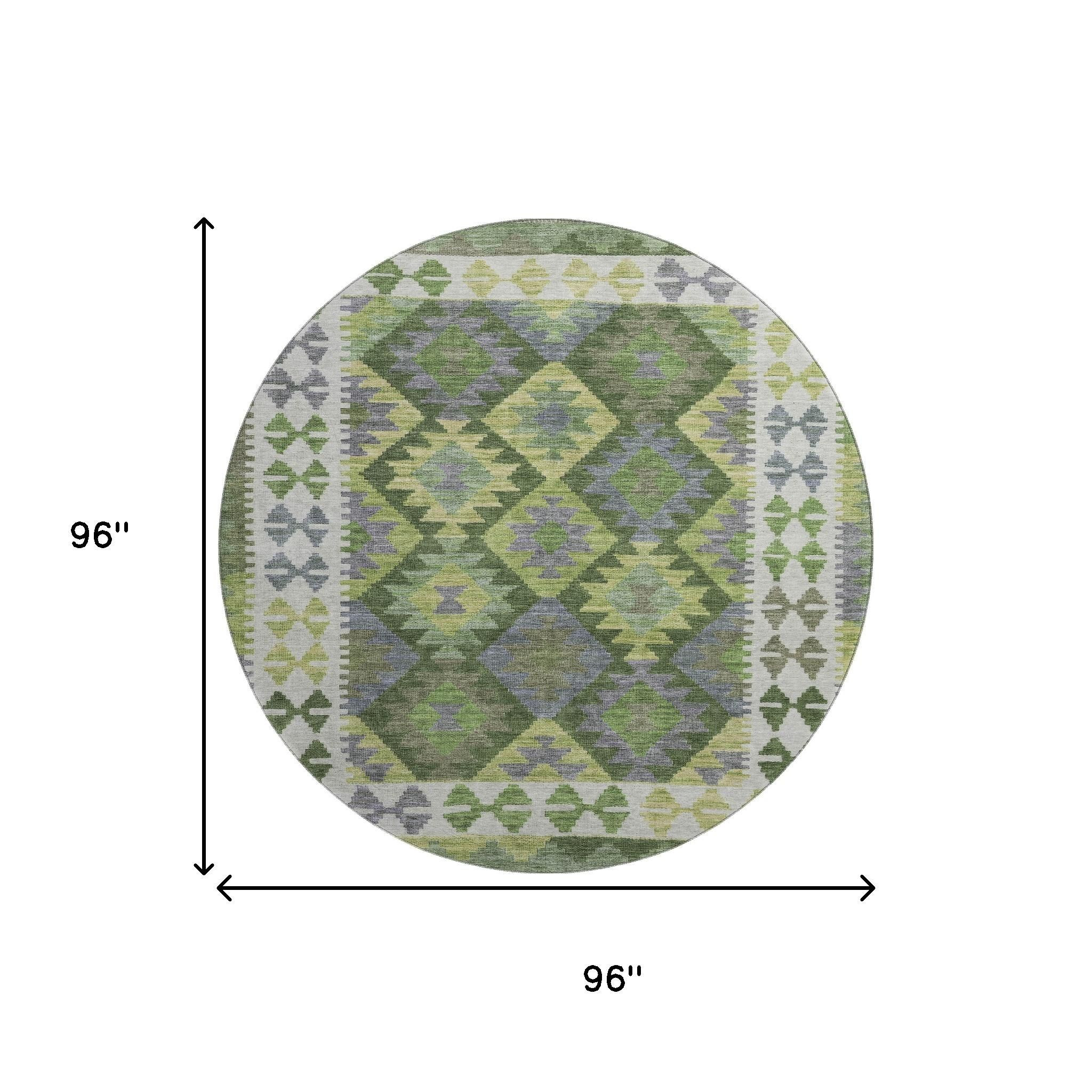 Set an inviting tone in your space with this 8-foot olive green and ivory tribal washable round rug with uv protection. Ideal for spaces with kids and pets, this rug is stain resistant to help repel dirt and spilled liquids. Built to last, this rug crafted from polyester fibers is known for its durability and long lasting appeal. Rugs are a great way to showcase your style, hide imperfections, warm your home and reduce noise. This larger sized, transitional styled rug is ready to create a focal point or statement piece in your room. 96.00-inch h x 96.00-inch w x 0.39-inch d.