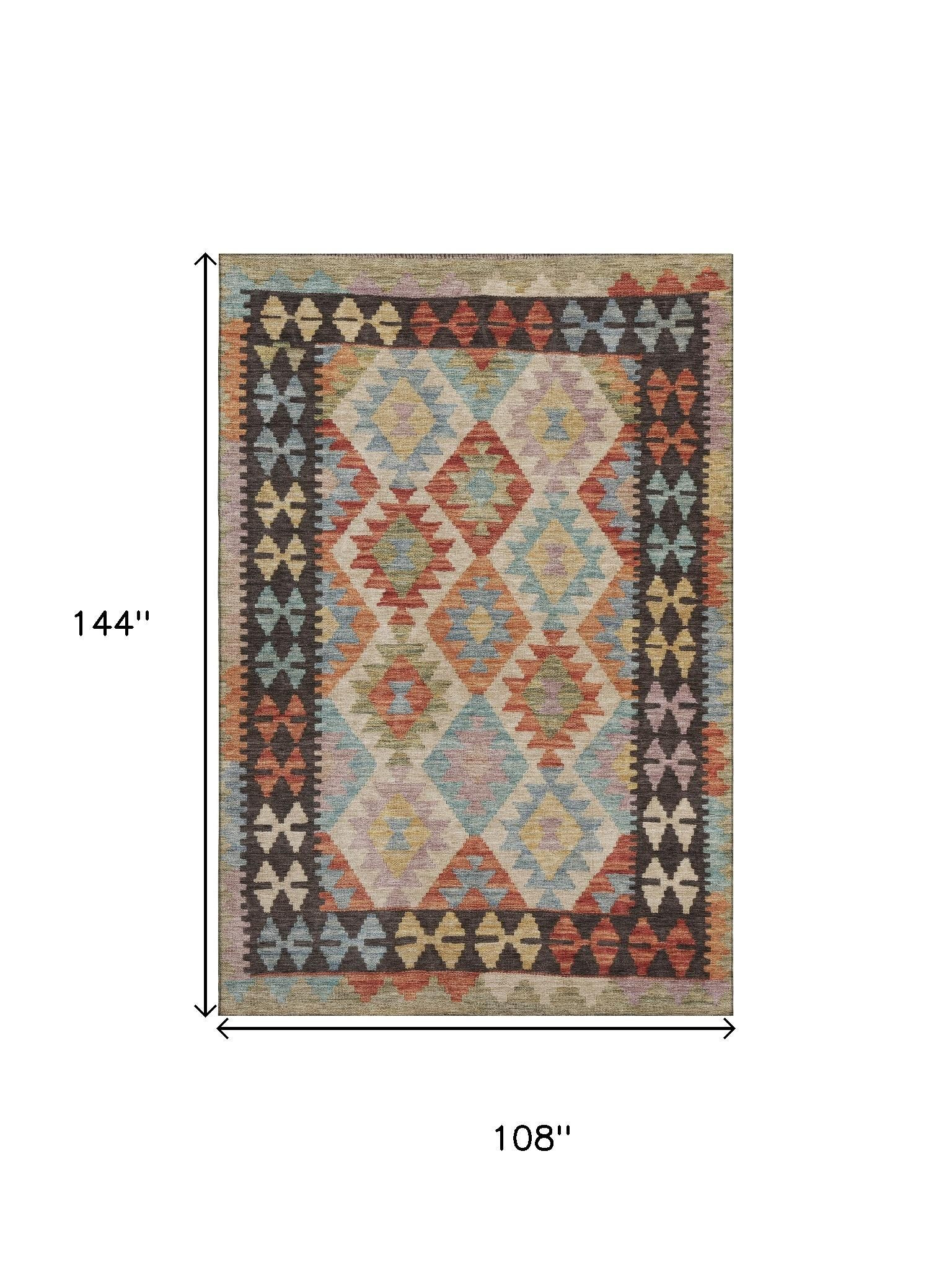 This 9-foot x 12-foot rust blue and beige tribal washable area rug with uv protection, is a great way to add warmth to a room. Ideal for spaces with kids and pets, this rug is stain resistant to help repel dirt and spilled liquids. Built to last, this rug crafted from polyester fibers is known for its durability and long lasting appeal. Rugs are a great way to showcase your style, hide imperfections, warm your home and reduce noise. This larger sized, transitional styled rug is ready to create a focal point or statement piece in your room. 108.00-inch h x 144.00-inch w x 0.39-inch d.