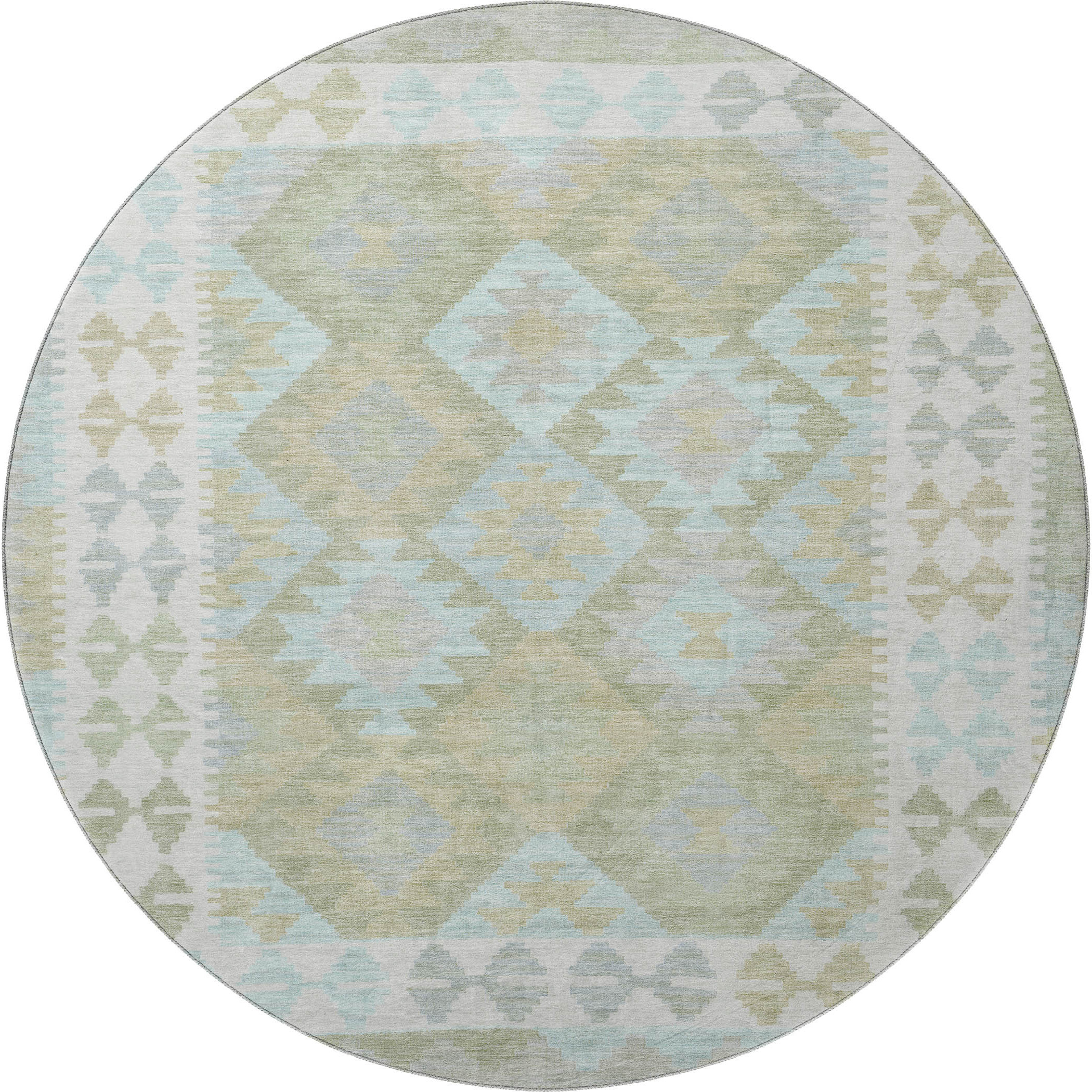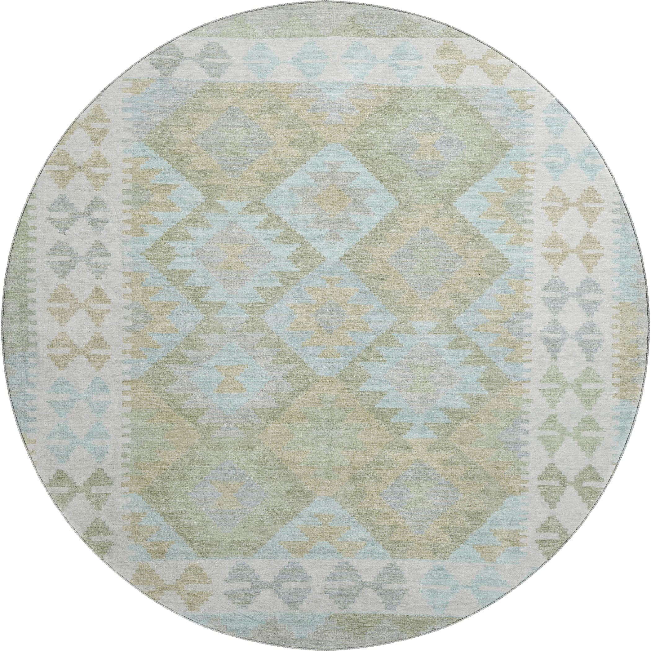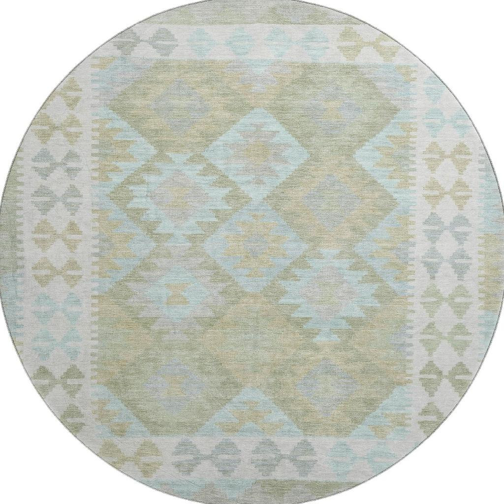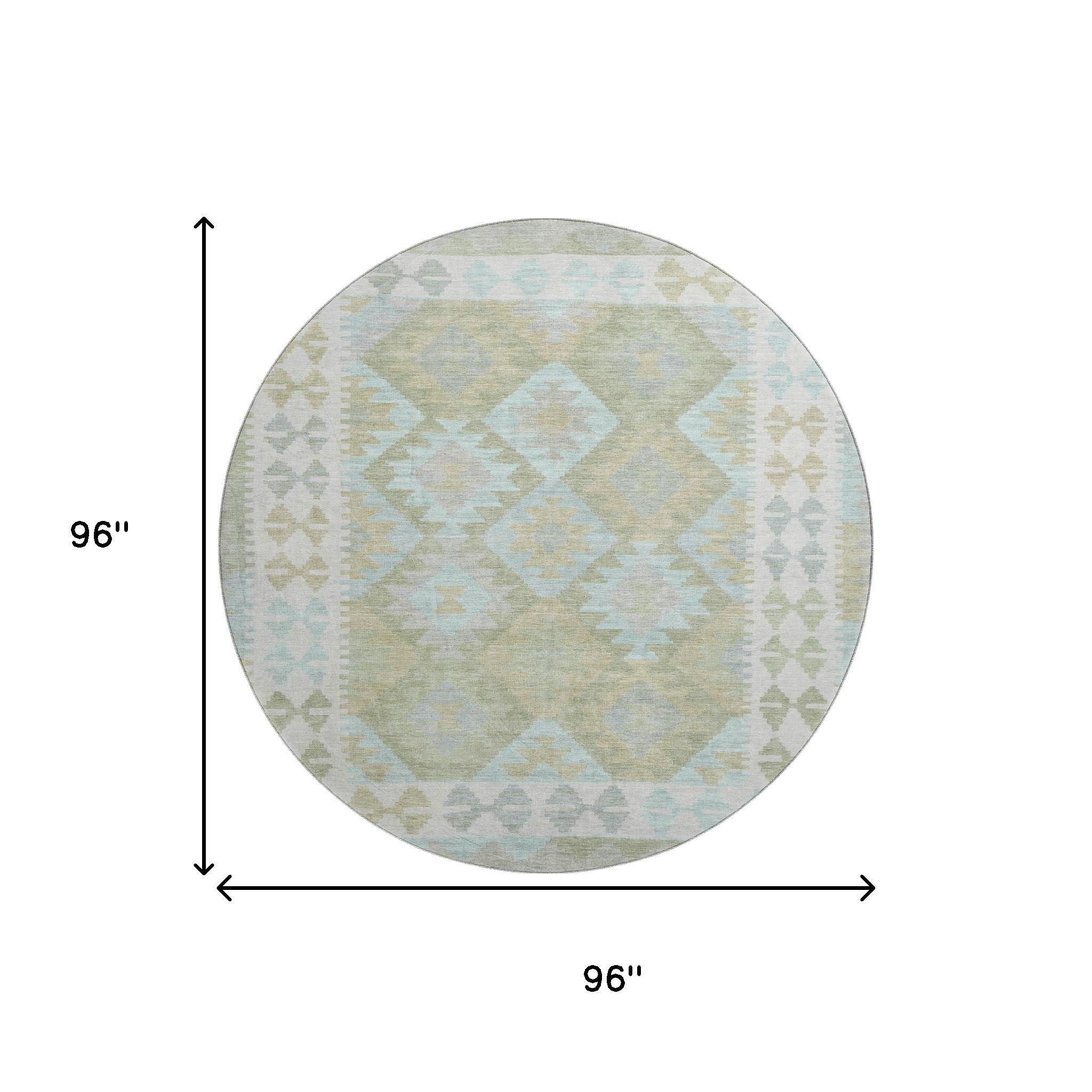 Add some artistry to your room with this 8-foot sage and blue tribal washable round rug with uv protection. Ideal for spaces with kids and pets, this rug is stain resistant to help repel dirt and spilled liquids. Built to last, this rug crafted from polyester fibers is known for its durability and long lasting appeal. Rugs are a great way to showcase your style, hide imperfections, warm your home and reduce noise. This larger sized, transitional styled rug is ready to create a focal point or statement piece in your room. 96.00-inch h x 96.00-inch w x 0.39-inch d.