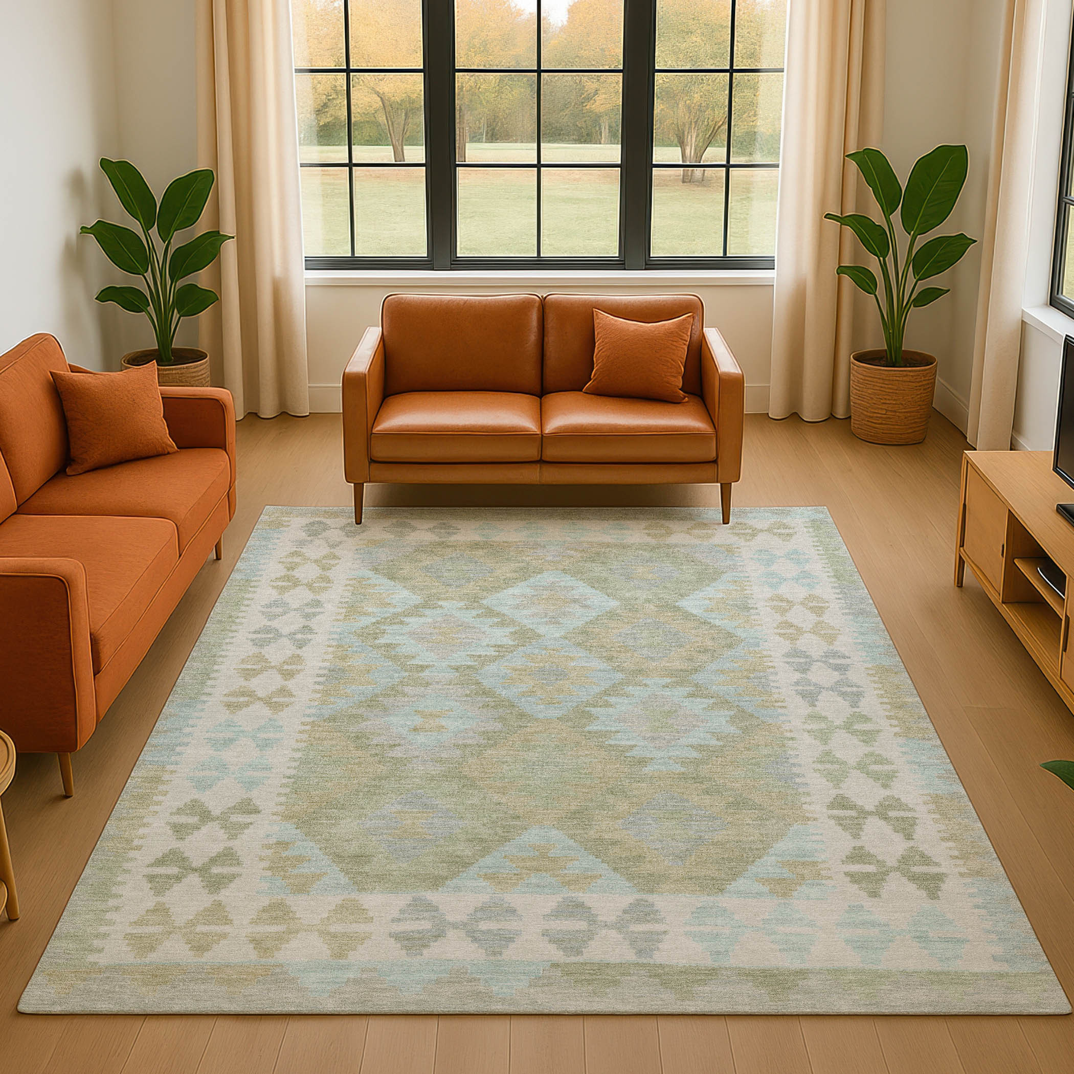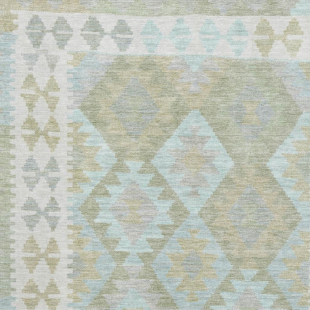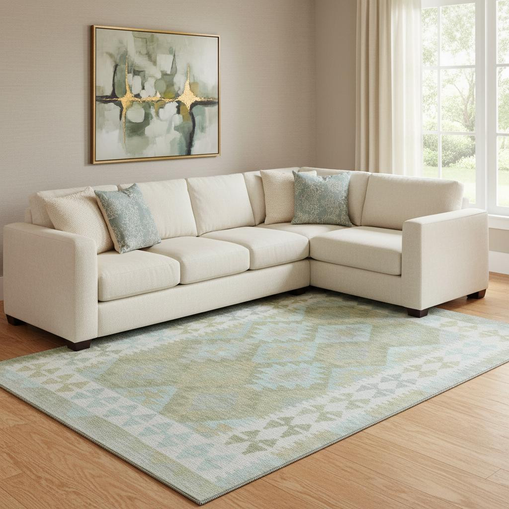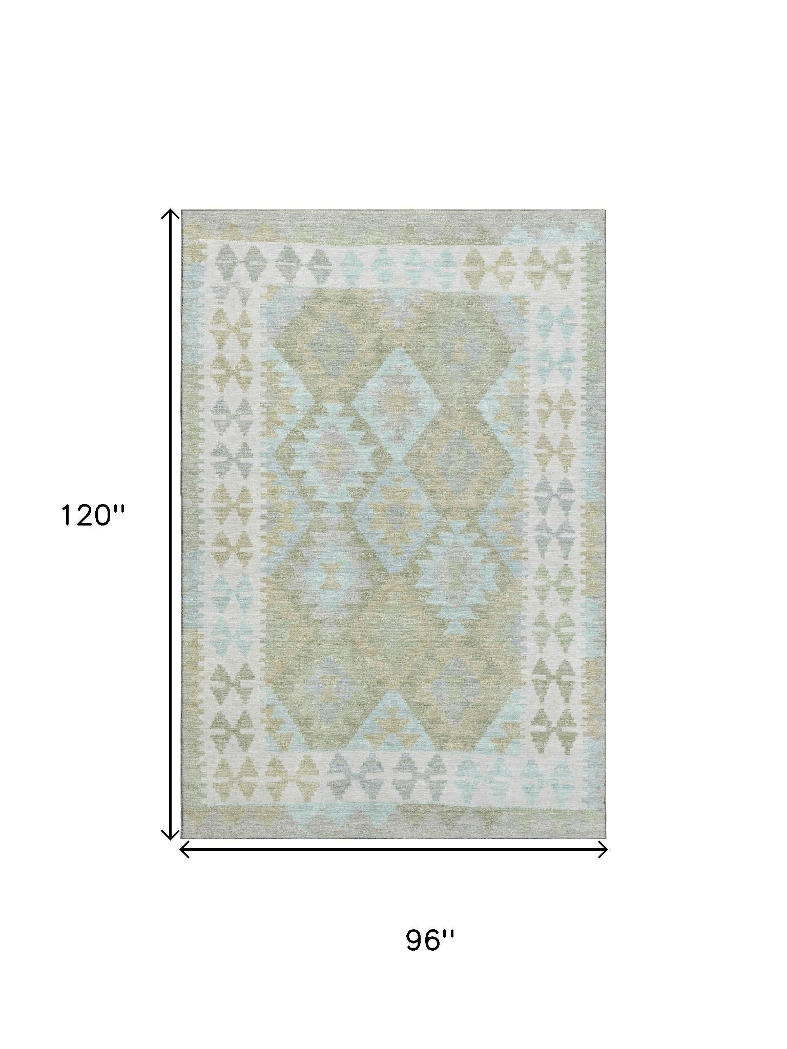 This 8-foot x 10-foot sage and blue tribal washable area rug with uv protection, is a great way to add warmth to a room. Ideal for spaces with kids and pets, this rug is stain resistant to help repel dirt and spilled liquids. Built to last, this rug crafted from polyester fibers is known for its durability and long lasting appeal. Rugs are a great way to showcase your style, hide imperfections, warm your home and reduce noise. This larger sized, transitional styled rug is ready to create a focal point or statement piece in your room. 96.00-inch h x 120.00-inch w x 0.39-inch d.
