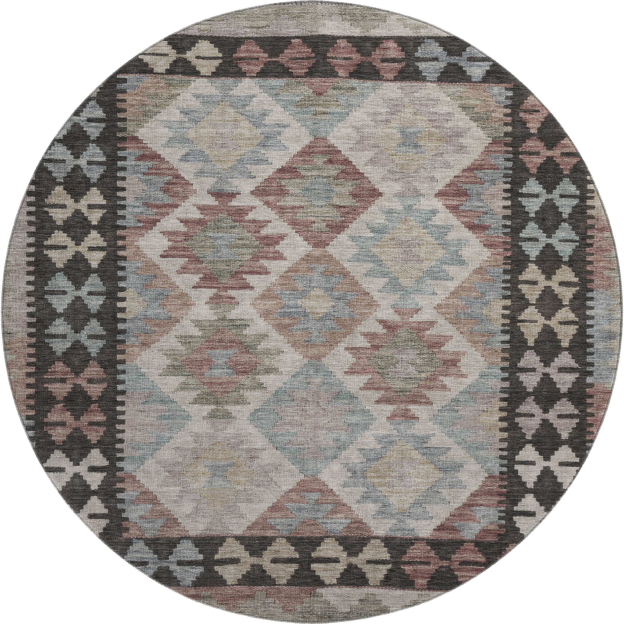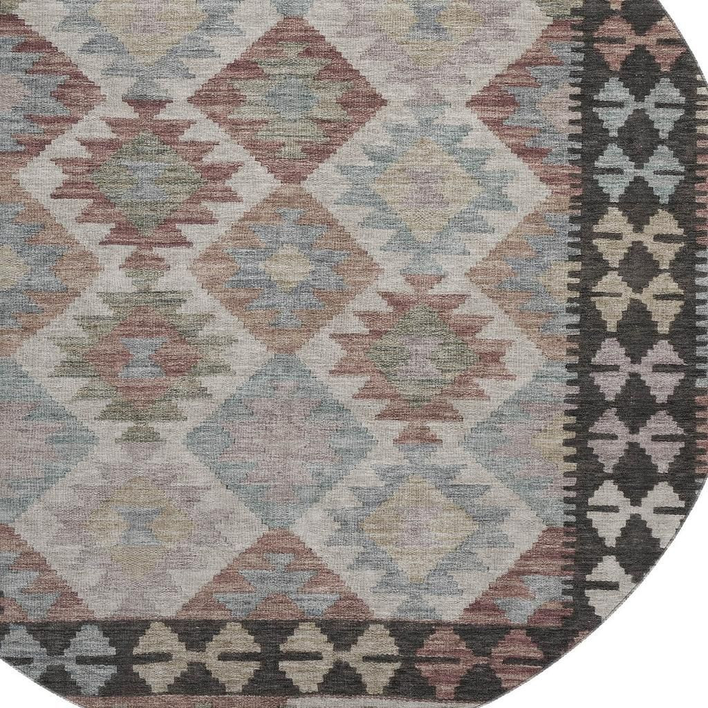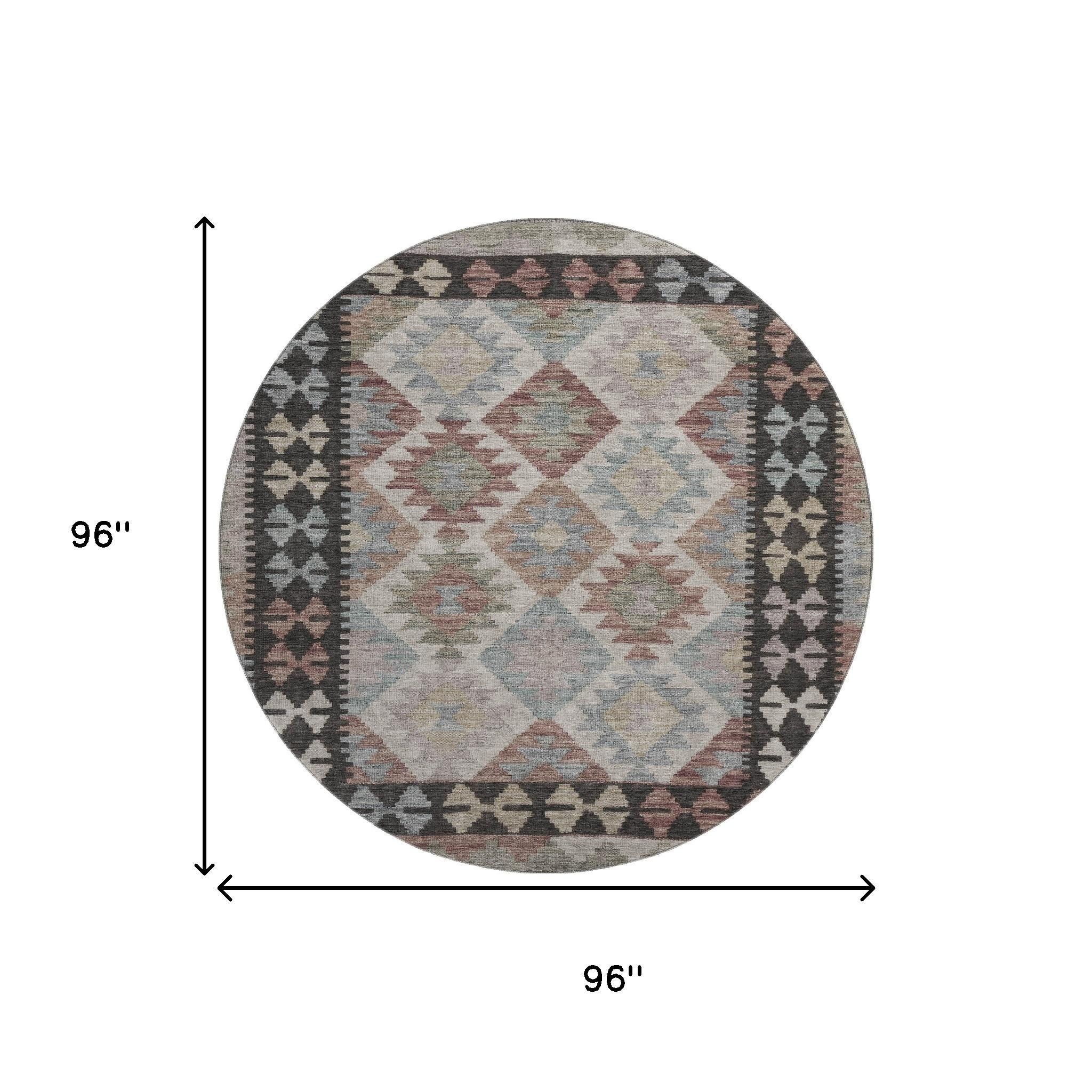 This 8-foot taupe and charcoal tribal washable round rug with uv protection, is a great way to add warmth to a room. Ideal for spaces with kids and pets, this rug is stain resistant to help repel dirt and spilled liquids. Built to last, this rug crafted from polyester fibers is known for its durability and long lasting appeal. Rugs are a great way to showcase your style, hide imperfections, warm your home and reduce noise. This larger sized, transitional styled rug is ready to create a focal point or statement piece in your room. 96.00-inch h x 96.00-inch w x 0.39-inch d.