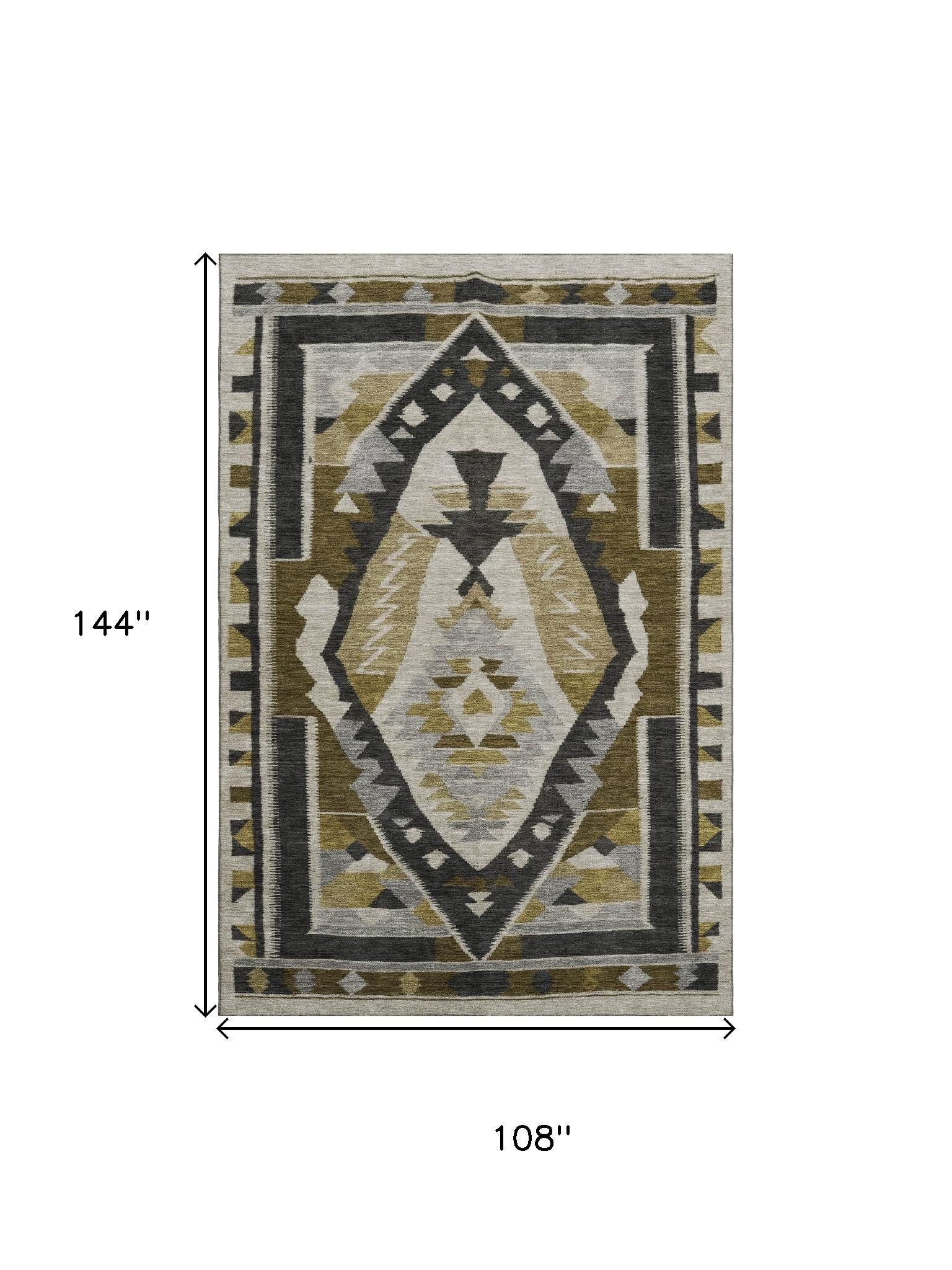 This 9-foot x 12-foot chocolate beige and charcoal tribal washable area rug with uv protection, is a great way to add warmth to a room. Ideal for spaces with kids and pets, this rug is stain resistant to help repel dirt and spilled liquids. Built to last, this rug crafted from polyester fibers is known for its durability and long lasting appeal. Rugs are a great way to showcase your style, hide imperfections, warm your home and reduce noise. This larger sized, transitional styled rug is ready to create a focal point or statement piece in your room. 108.00-inch h x 144.00-inch w x 0.39-inch d.