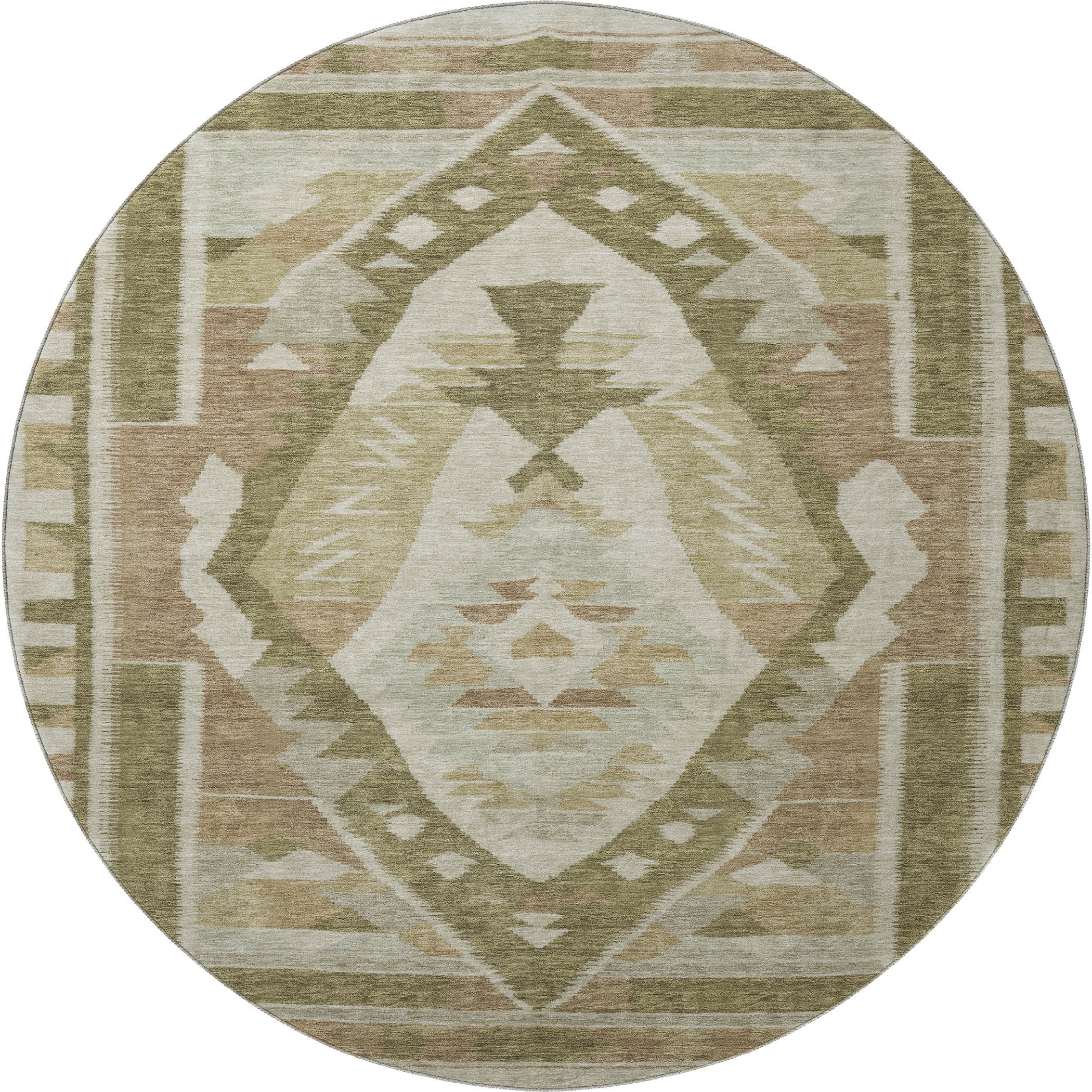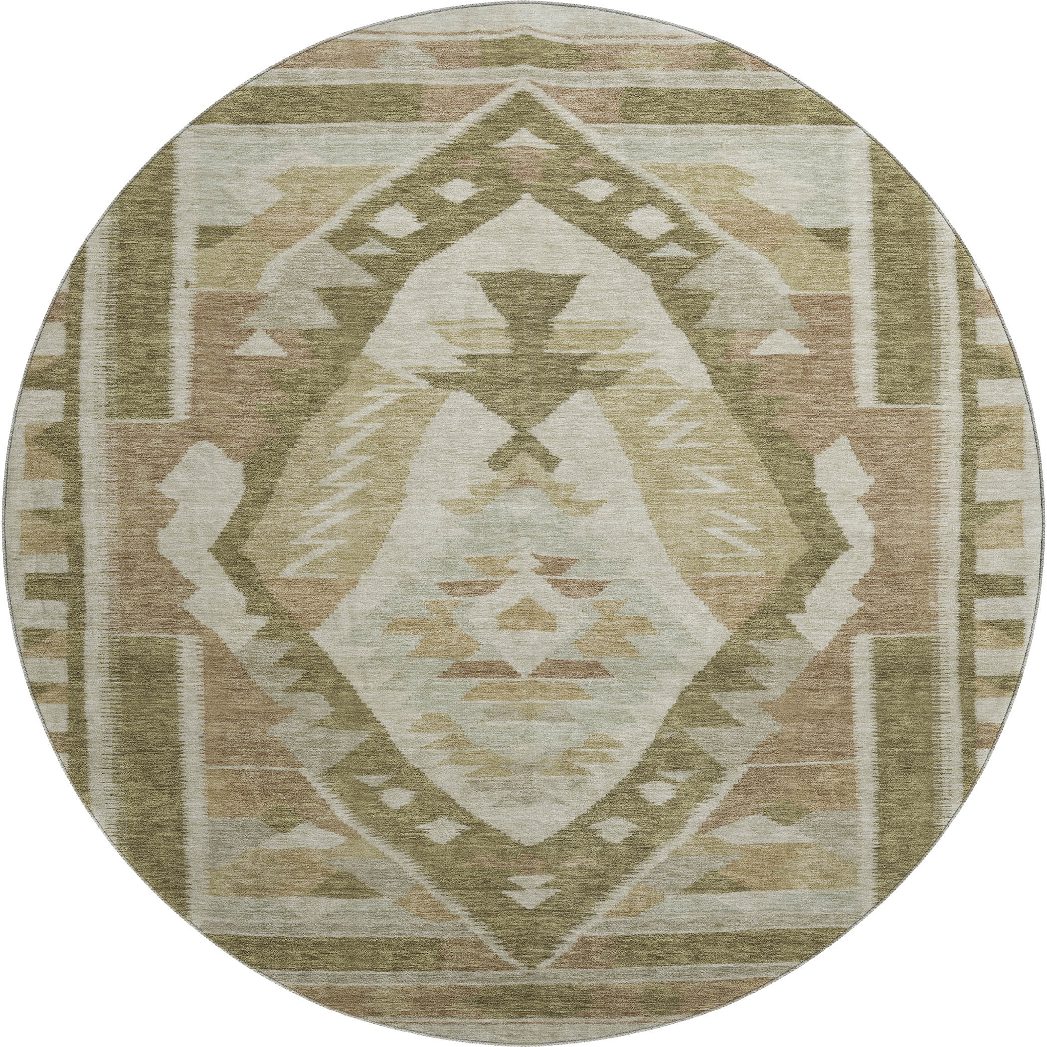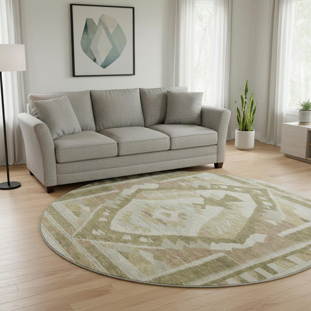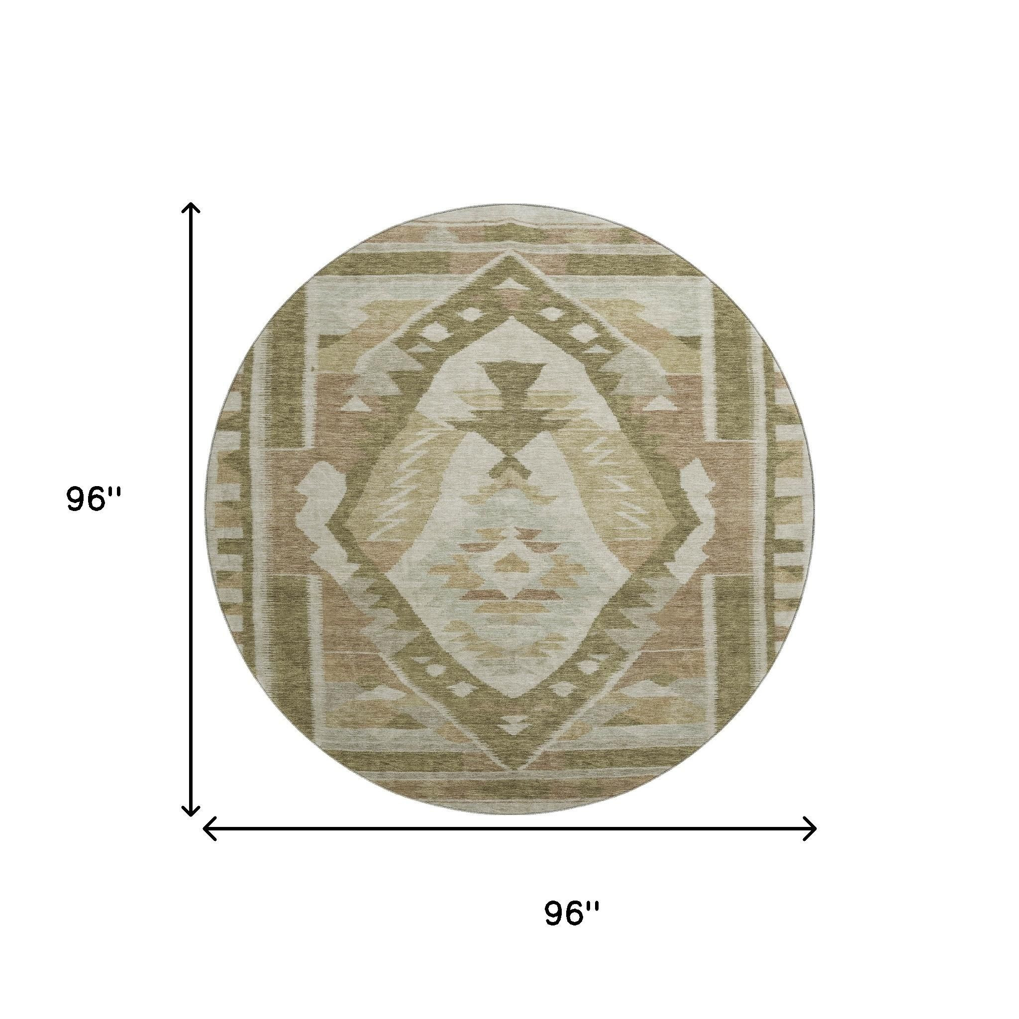 Set an inviting tone in your space with this 8-foot linen ivory and khaki tribal washable round rug with uv protection. Ideal for spaces with kids and pets, this rug is stain resistant to help repel dirt and spilled liquids. Built to last, this rug crafted from polyester fibers is known for its durability and long lasting appeal. Rugs are a great way to showcase your style, hide imperfections, warm your home and reduce noise. This larger sized, transitional styled rug is ready to create a focal point or statement piece in your room. 96.00-inch h x 96.00-inch w x 0.39-inch d.