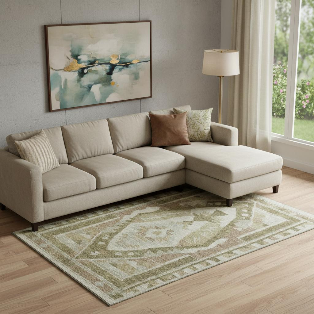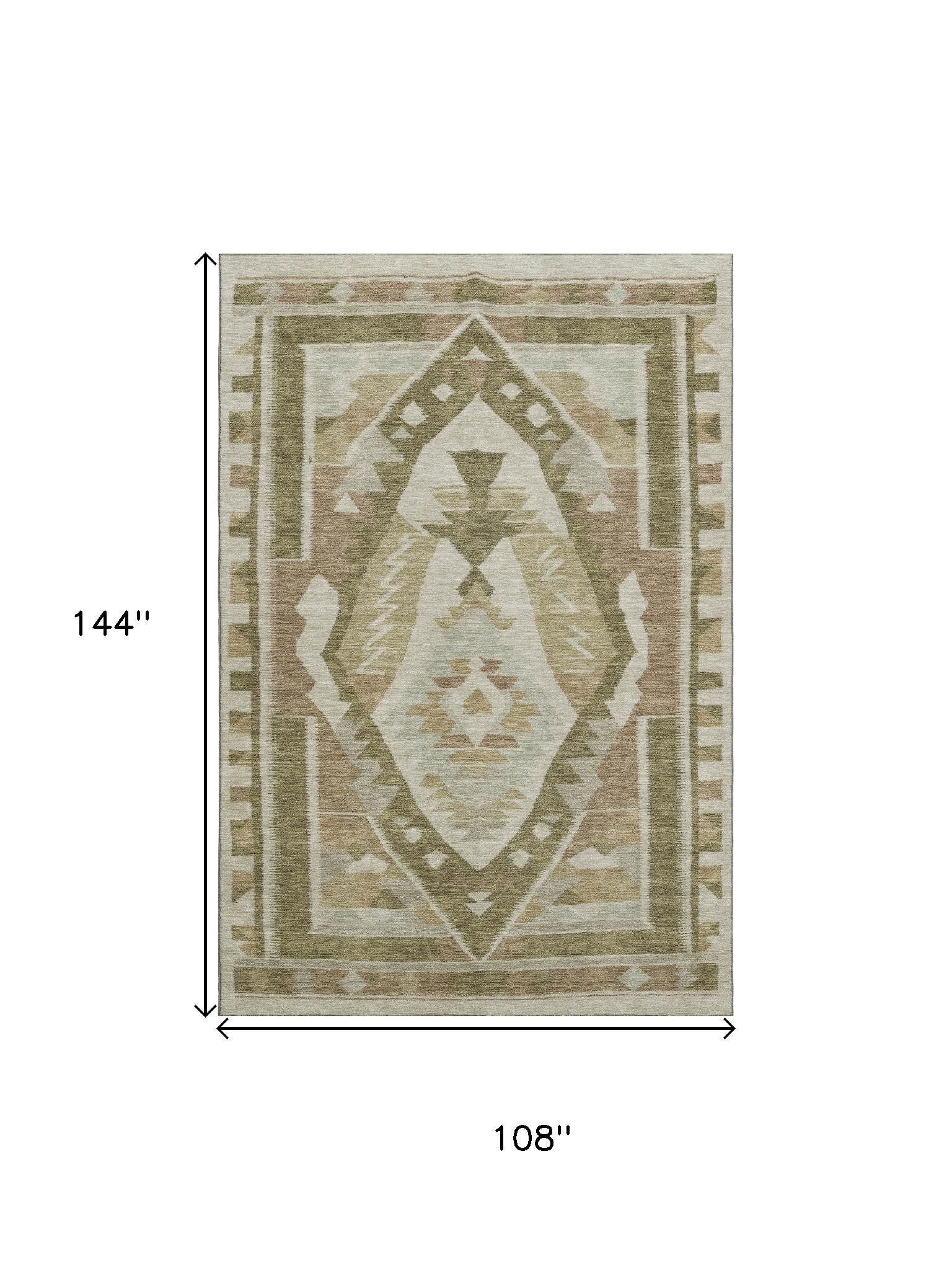 Set an inviting tone in your space with this 9-foot x 12-foot linen ivory and khaki tribal washable area rug with uv protection. Ideal for spaces with kids and pets, this rug is stain resistant to help repel dirt and spilled liquids. Built to last, this rug crafted from polyester fibers is known for its durability and long lasting appeal. Rugs are a great way to showcase your style, hide imperfections, warm your home and reduce noise. This larger sized, transitional styled rug is ready to create a focal point or statement piece in your room. 108.00-inch h x 144.00-inch w x 0.39-inch d.