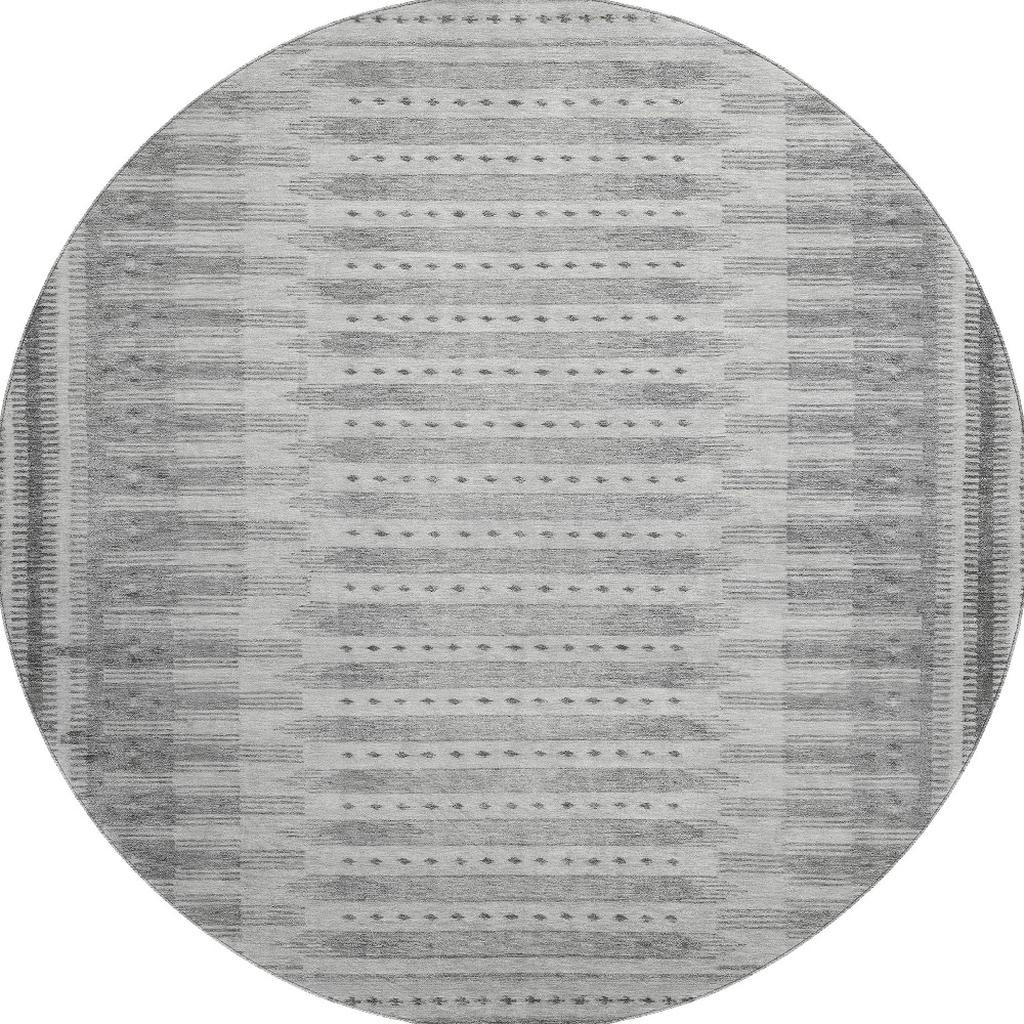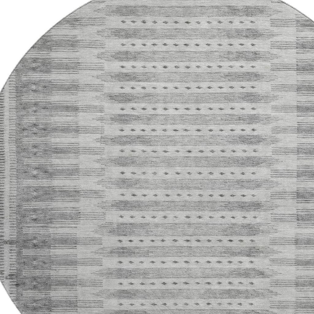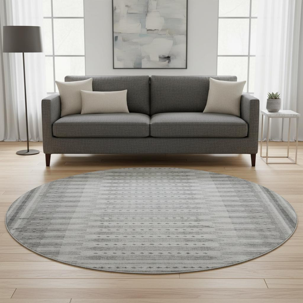 Add some artistry to your room with this 8-foot gray and silver geometric washable round rug with uv protection. Ideal for spaces with kids and pets, this rug is stain resistant to help repel dirt and spilled liquids. Built to last, this rug crafted from polyester fibers is known for its durability and long lasting appeal. Rugs are a great way to showcase your style, hide imperfections, warm your home and reduce noise. This larger sized, transitional styled rug is ready to create a focal point or statement piece in your room. 96.00-inch h x 96.00-inch w x 0.39-inch d.