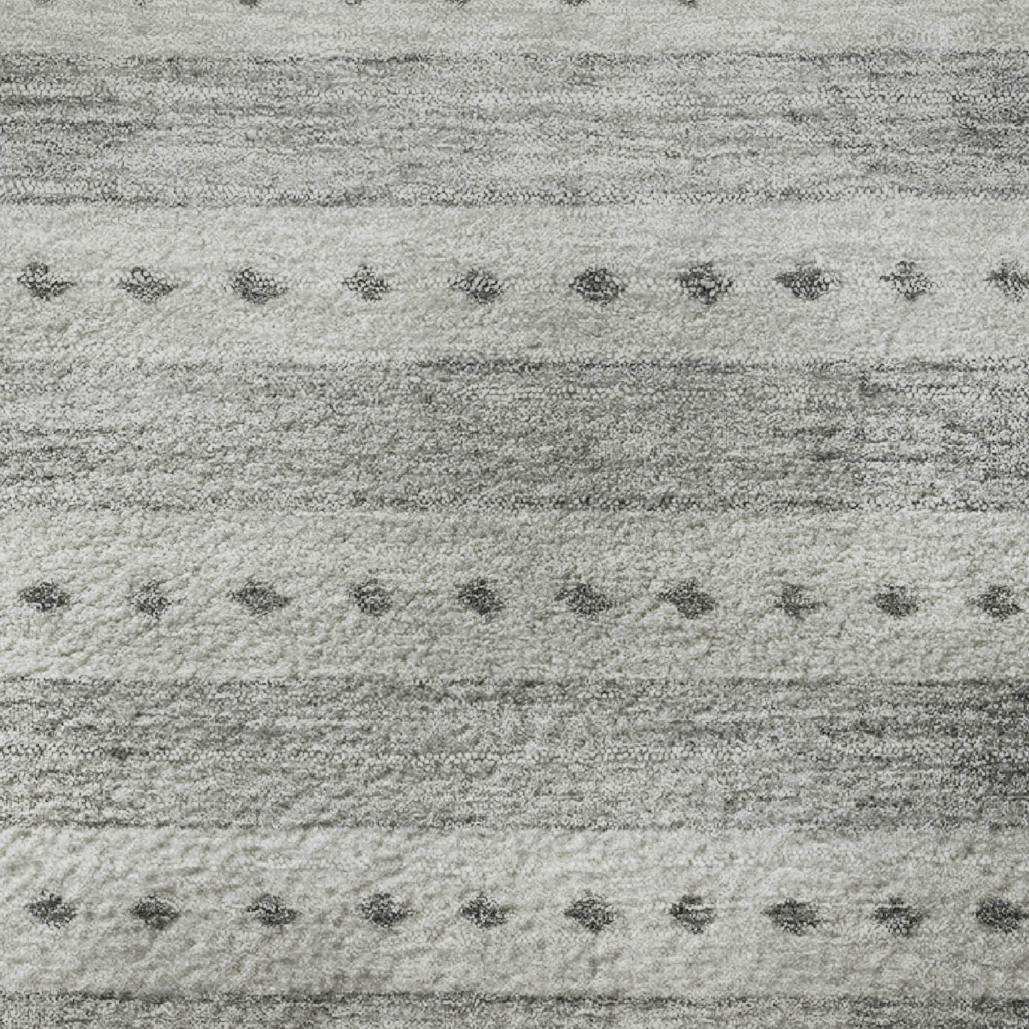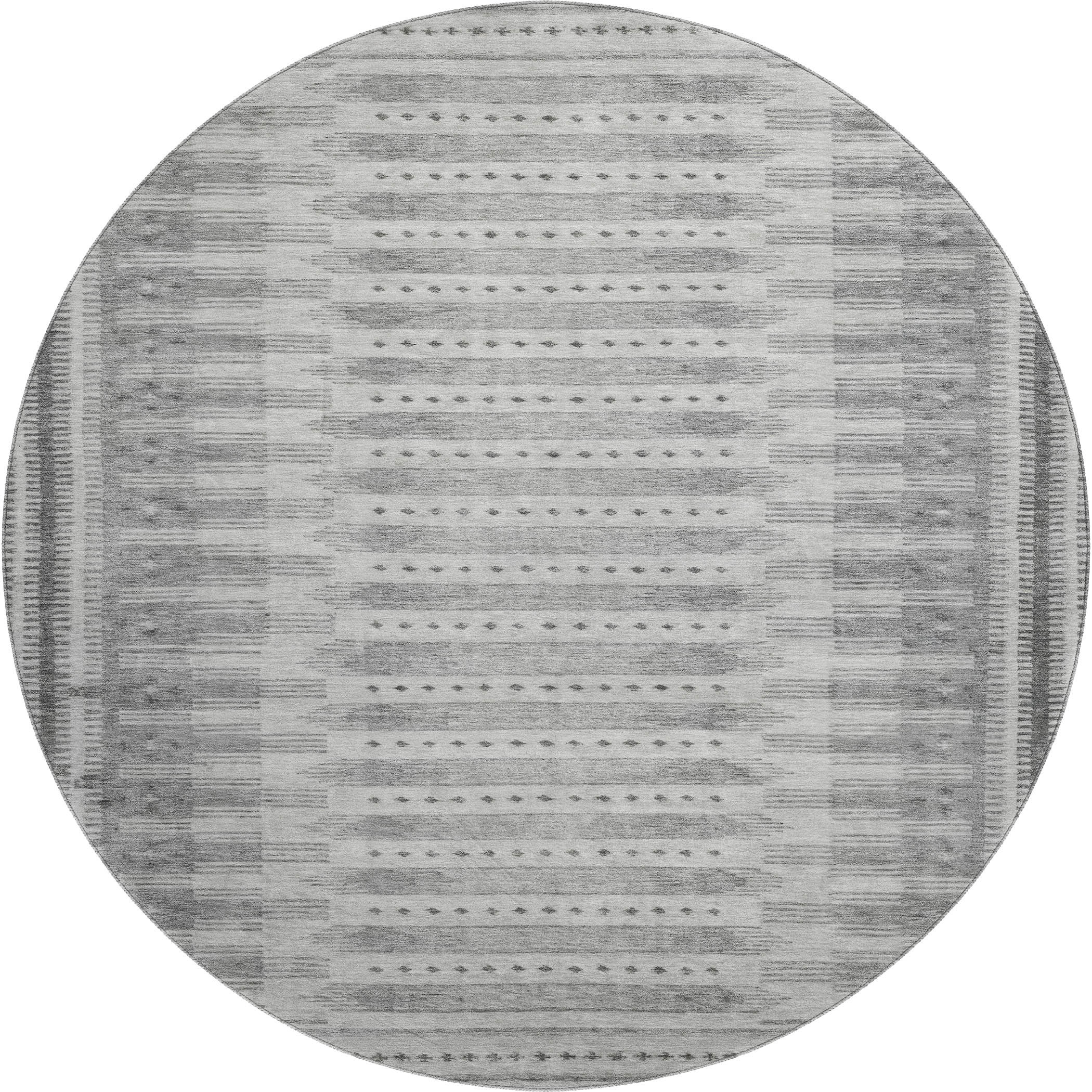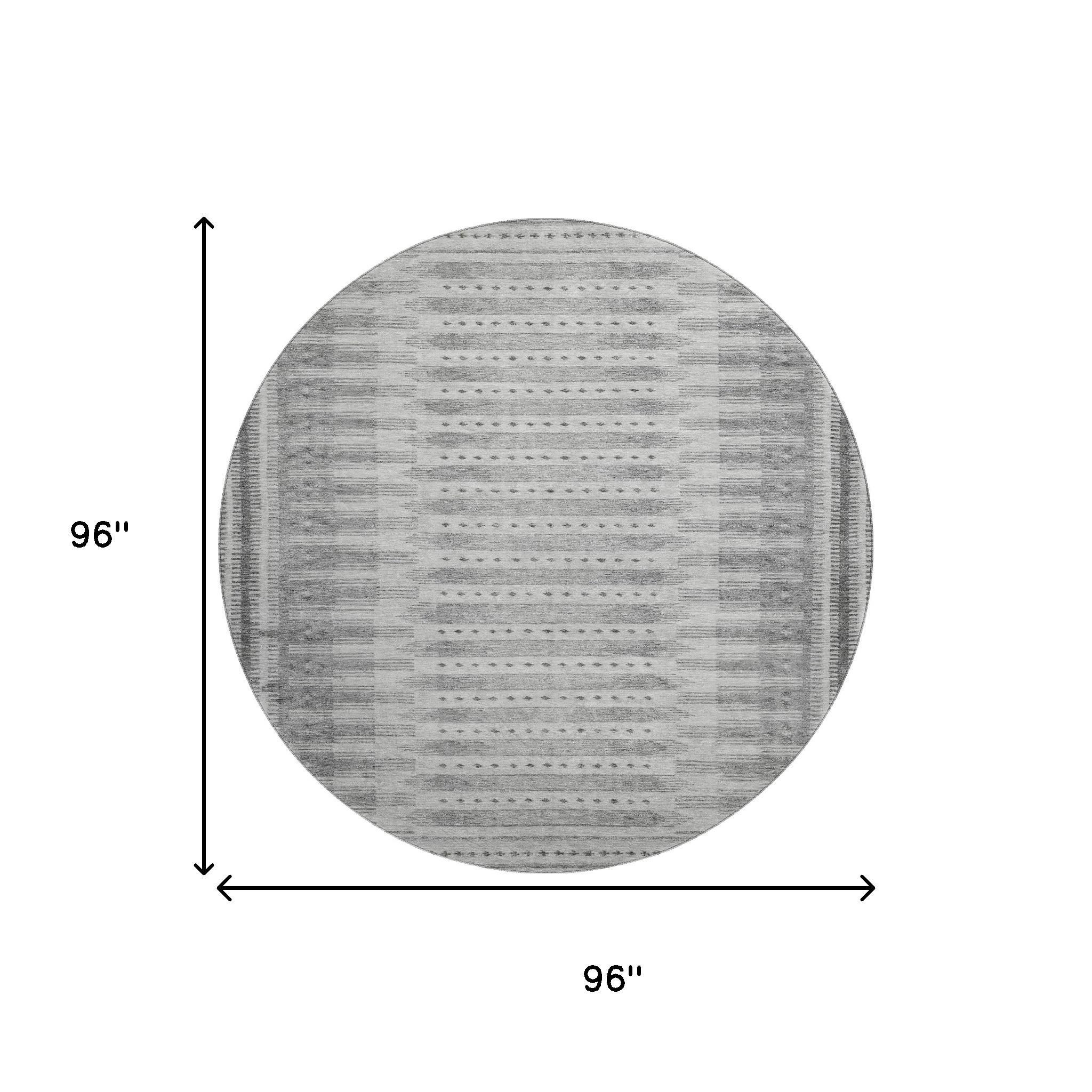 Add some artistry to your room with this 8-foot gray and silver geometric washable round rug with uv protection. Ideal for spaces with kids and pets, this rug is stain resistant to help repel dirt and spilled liquids. Built to last, this rug crafted from polyester fibers is known for its durability and long lasting appeal. Rugs are a great way to showcase your style, hide imperfections, warm your home and reduce noise. This larger sized, transitional styled rug is ready to create a focal point or statement piece in your room. 96.00-inch h x 96.00-inch w x 0.39-inch d.