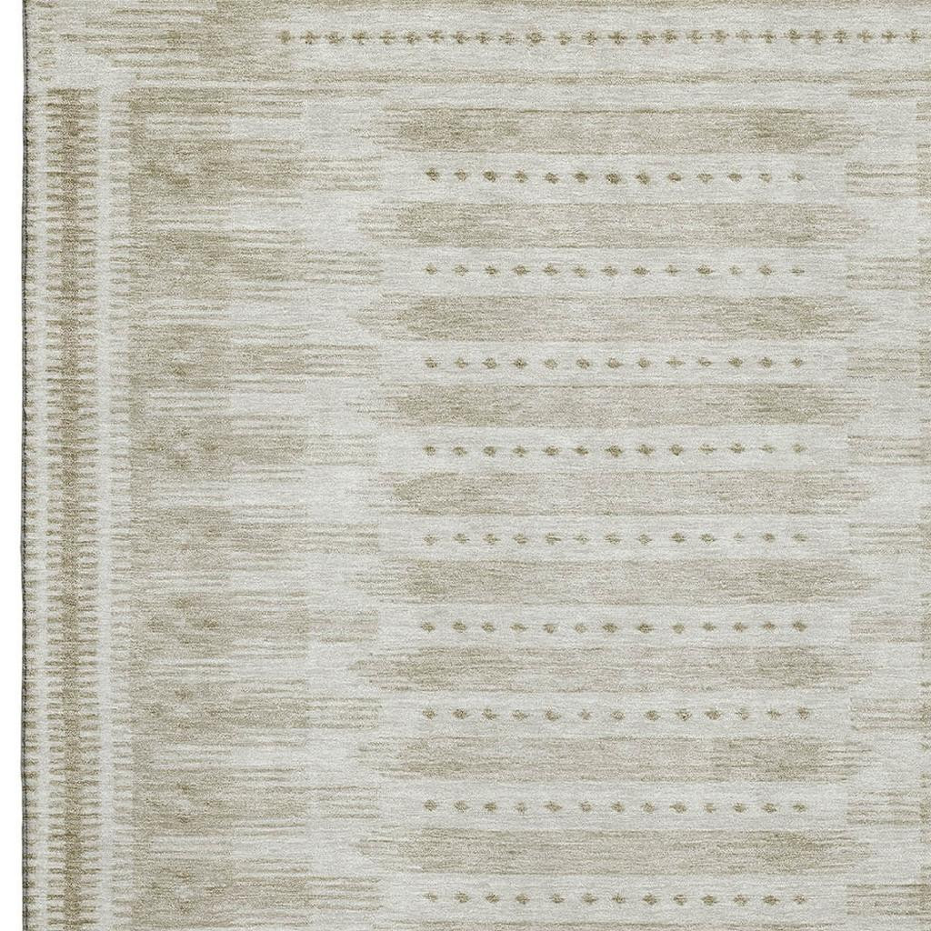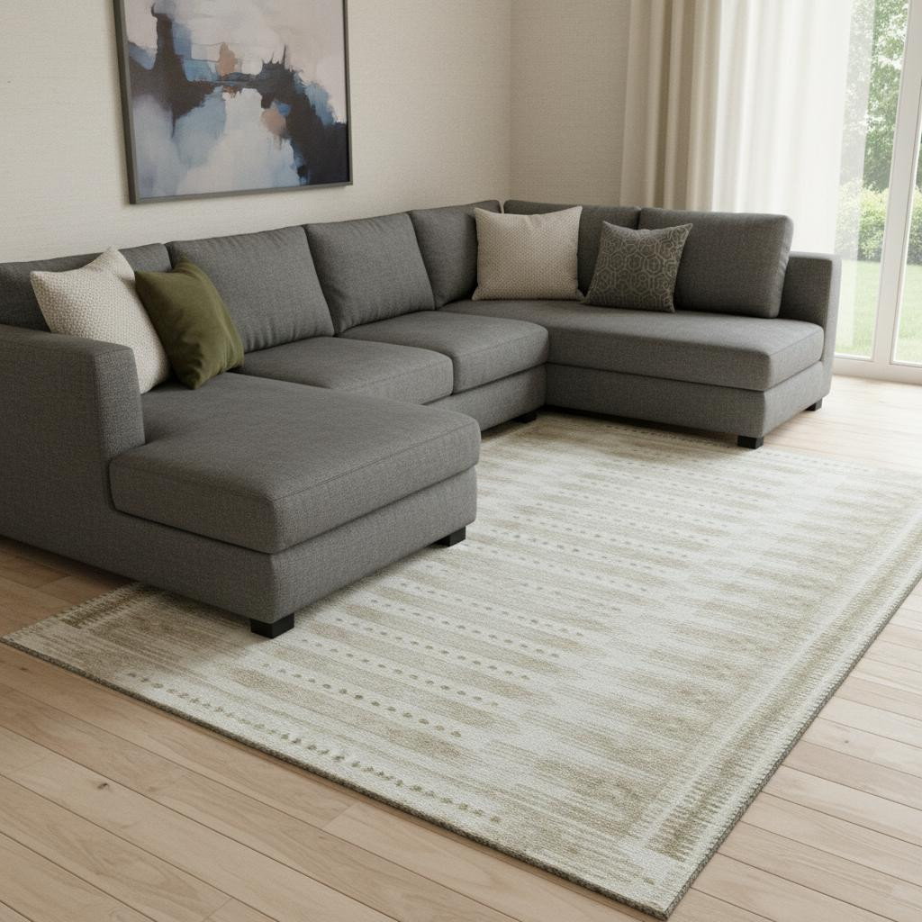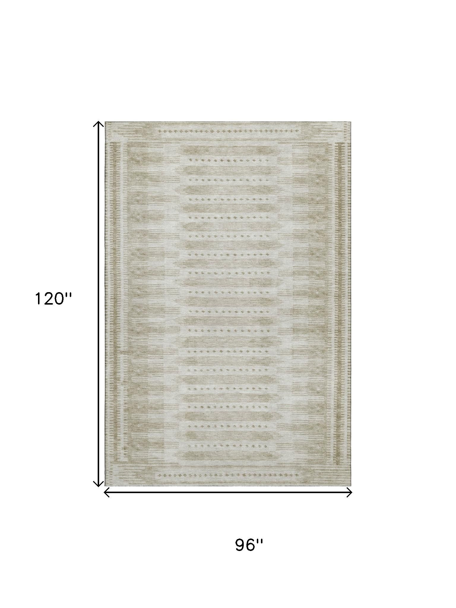 Add some artistry to your room with this 8-foot x 10-foot khaki and beige geometric washable area rug with uv protection. Ideal for spaces with kids and pets, this rug is stain resistant to help repel dirt and spilled liquids. Built to last, this rug crafted from polyester fibers is known for its durability and long lasting appeal. Rugs are a great way to showcase your style, hide imperfections, warm your home and reduce noise. This larger sized, transitional styled rug is ready to create a focal point or statement piece in your room. 96.00-inch h x 120.00-inch w x 0.39-inch d.