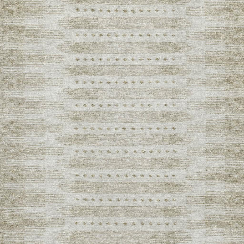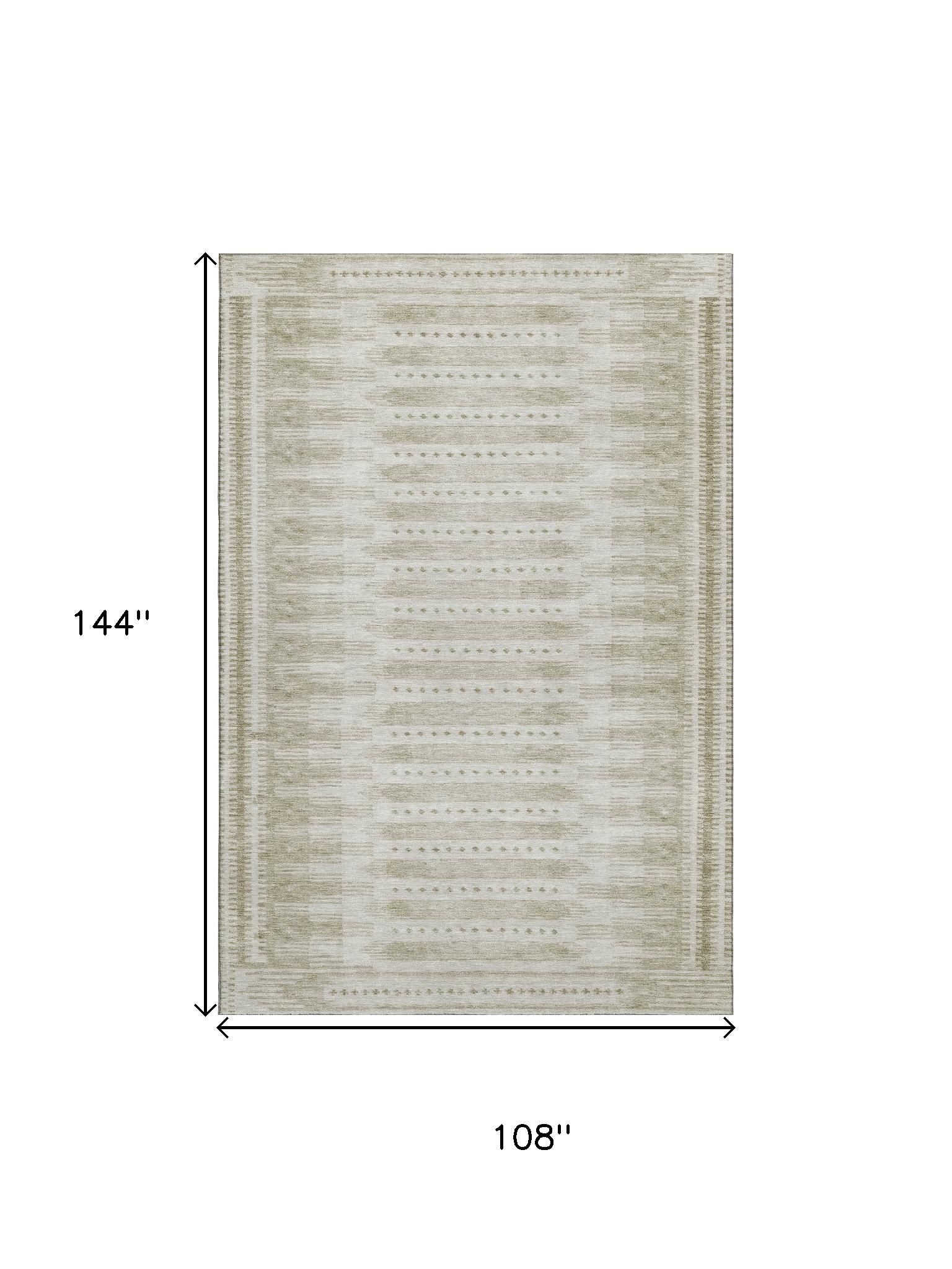 This 9-foot x 12-foot khaki and beige geometric washable area rug with uv protection, is a great way to add warmth to a room. Ideal for spaces with kids and pets, this rug is stain resistant to help repel dirt and spilled liquids. Built to last, this rug crafted from polyester fibers is known for its durability and long lasting appeal. Rugs are a great way to showcase your style, hide imperfections, warm your home and reduce noise. This larger sized, transitional styled rug is ready to create a focal point or statement piece in your room. 108.00-inch h x 144.00-inch w x 0.39-inch d.