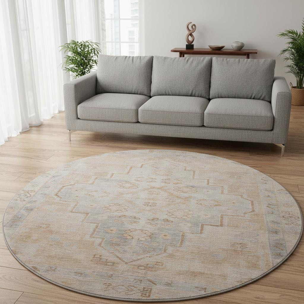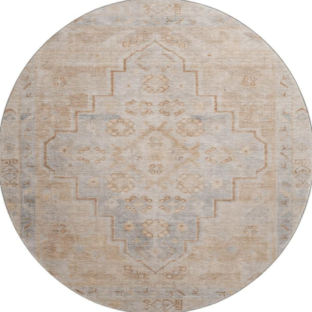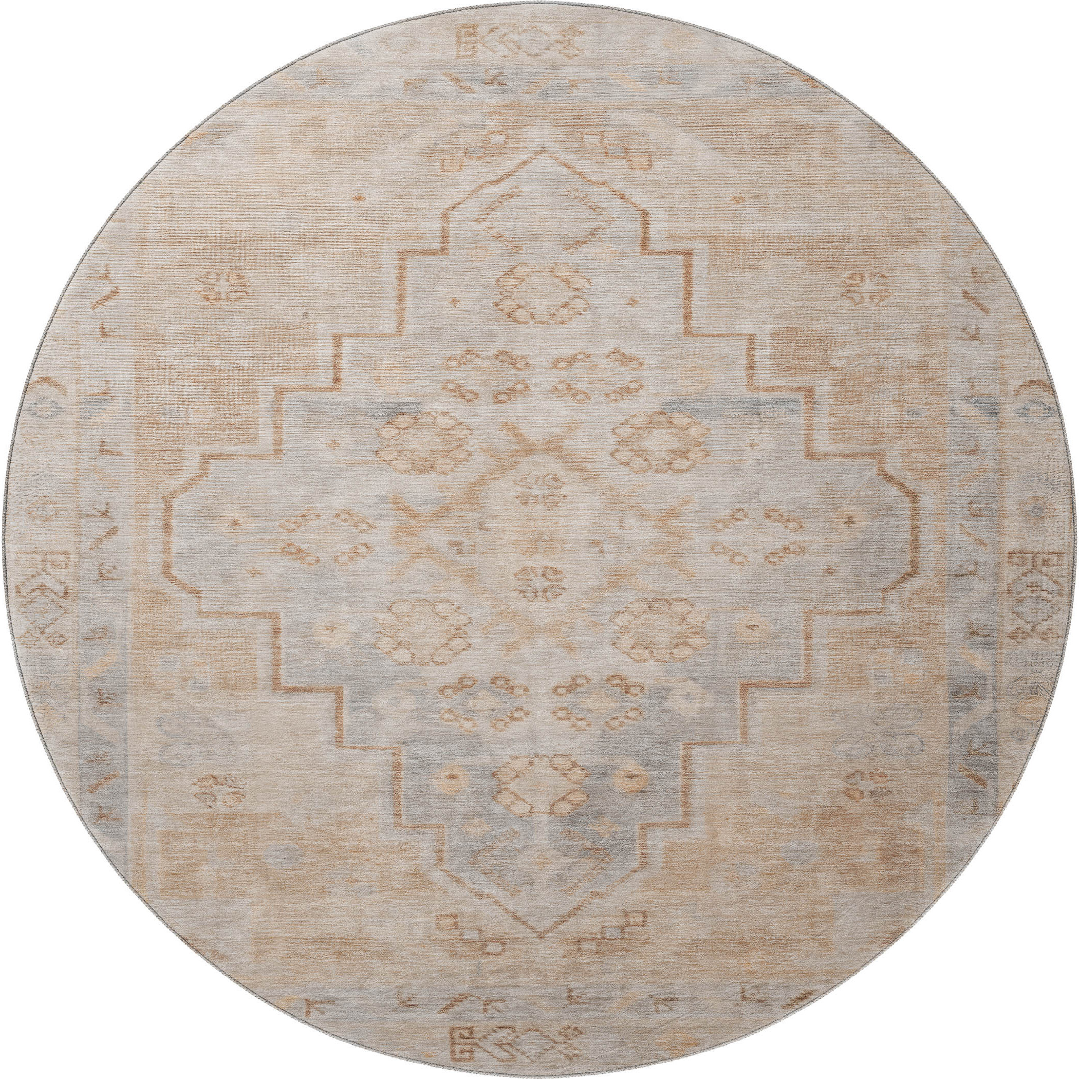 Set an inviting tone in your space with this 8-foot copper and gray medallion washable round rug with uv protection. Ideal for spaces with kids and pets, this rug is stain resistant to help repel dirt and spilled liquids. Built to last, this rug crafted from polyester fibers is known for its durability and long lasting appeal. Rugs are a great way to showcase your style, hide imperfections, warm your home and reduce noise. This larger sized, transitional styled rug is ready to create a focal point or statement piece in your room. 96.00-inch h x 96.00-inch w x 0.39-inch d.