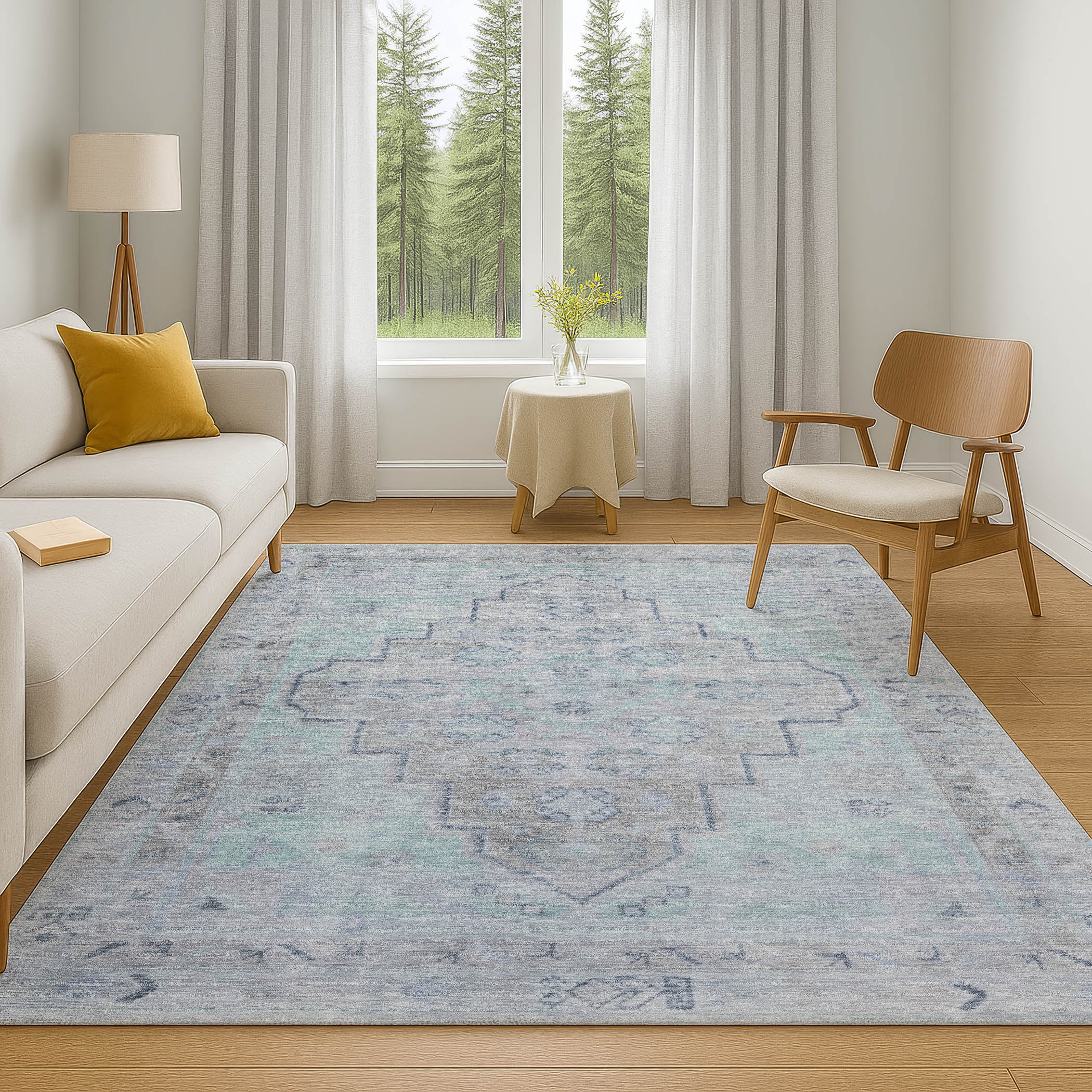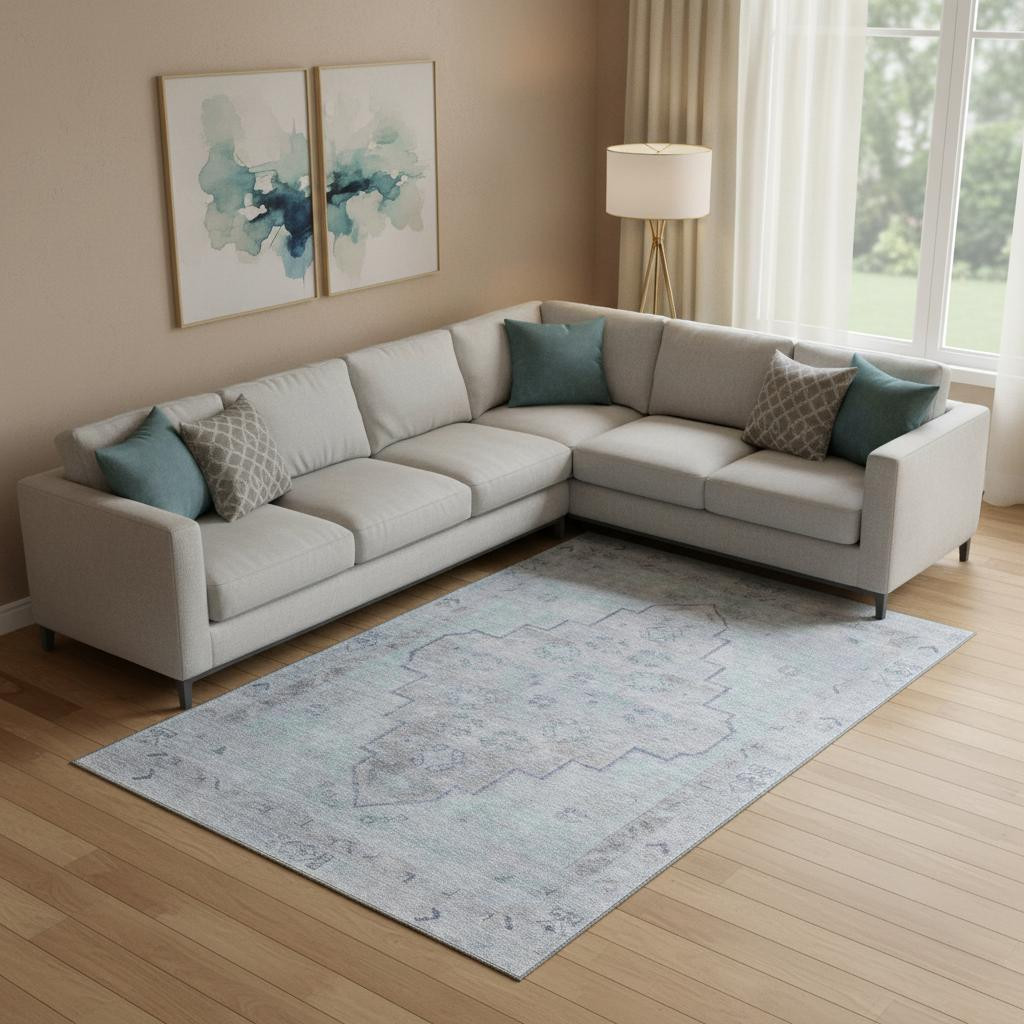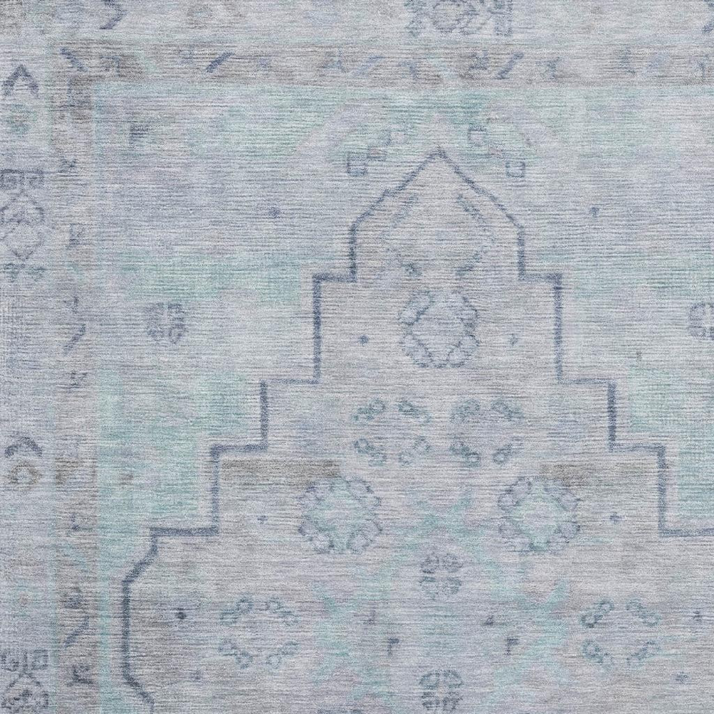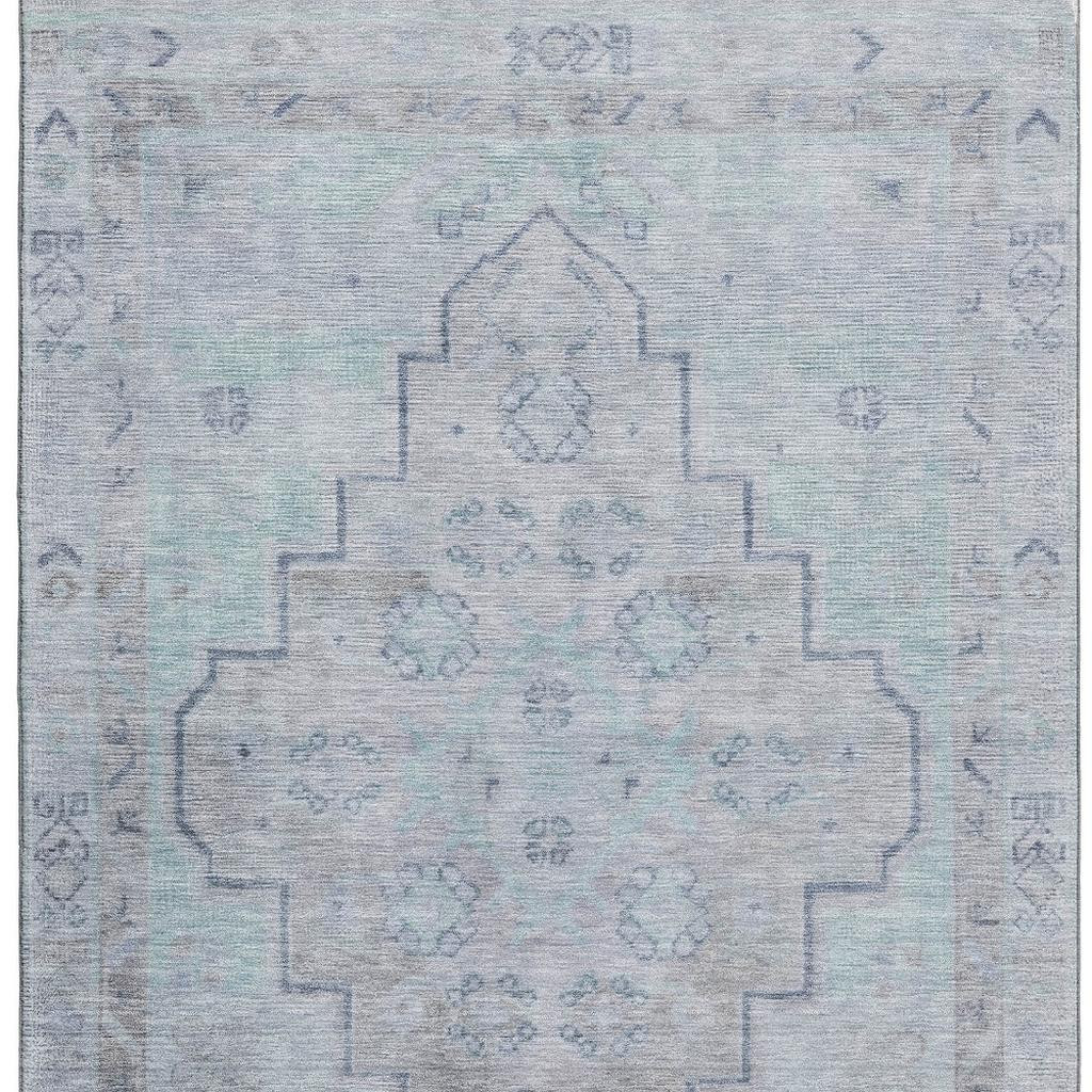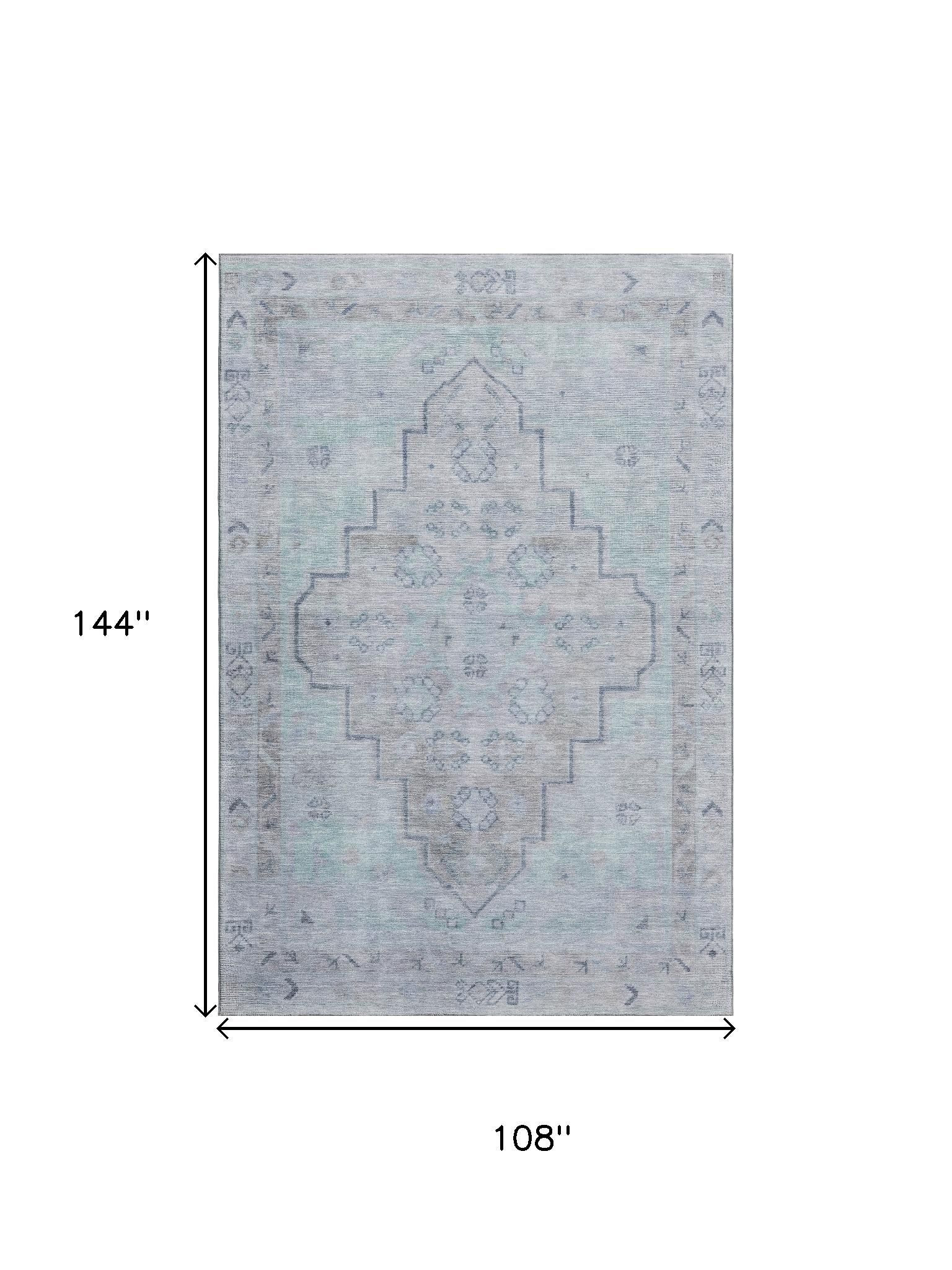 Add some artistry to your room with this 9-foot x 12-foot gray and teal medallion washable area rug with uv protection. Ideal for spaces with kids and pets, this rug is stain resistant to help repel dirt and spilled liquids. Built to last, this rug crafted from polyester fibers is known for its durability and long lasting appeal. Rugs are a great way to showcase your style, hide imperfections, warm your home and reduce noise. This larger sized, transitional styled rug is ready to create a focal point or statement piece in your room. 108.00-inch h x 144.00-inch w x 0.39-inch d.