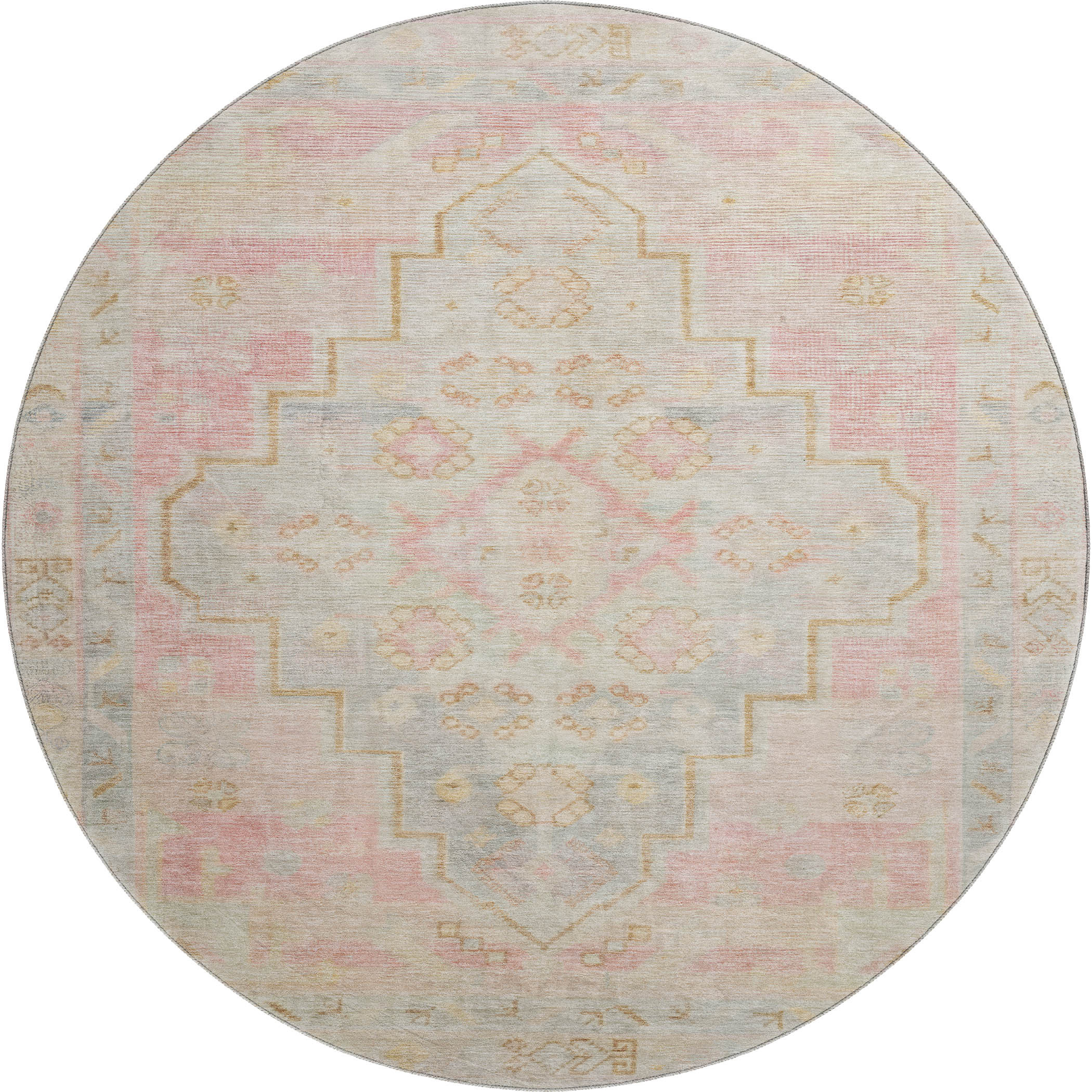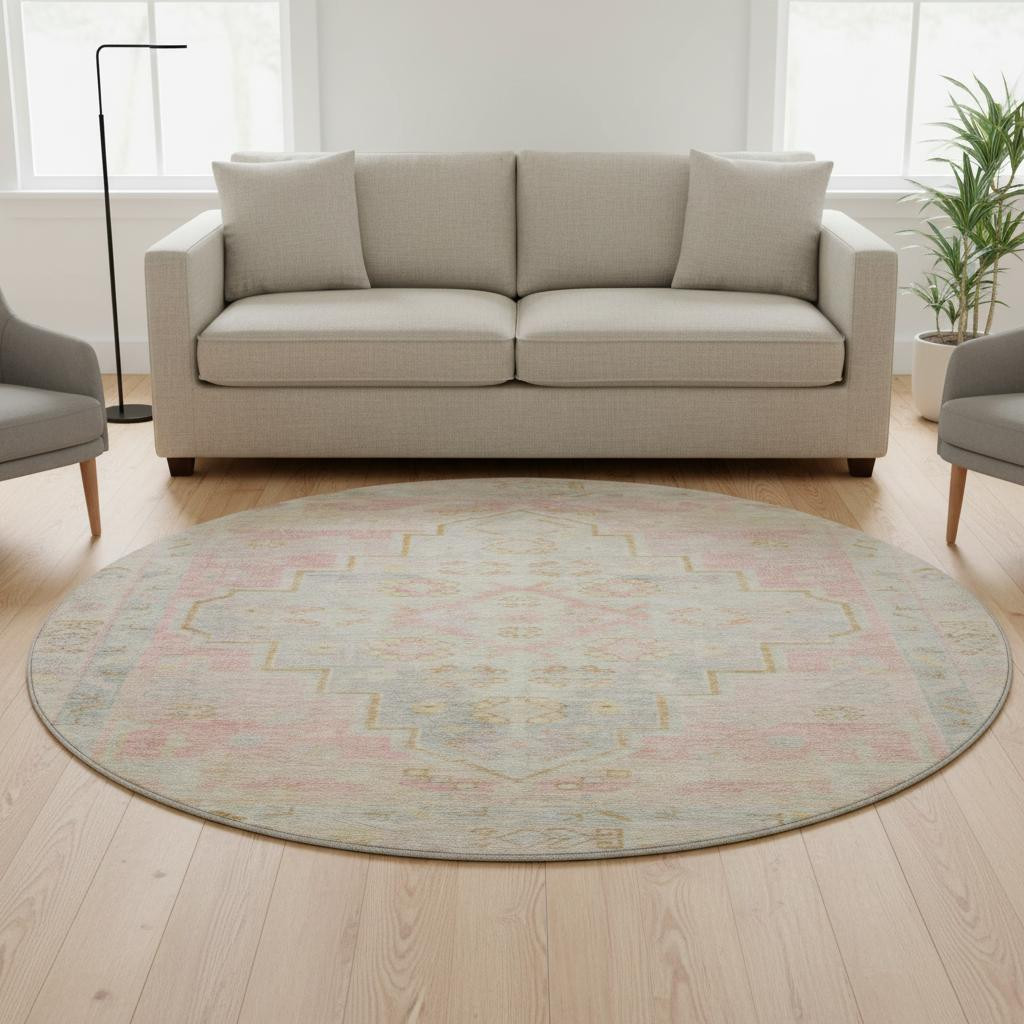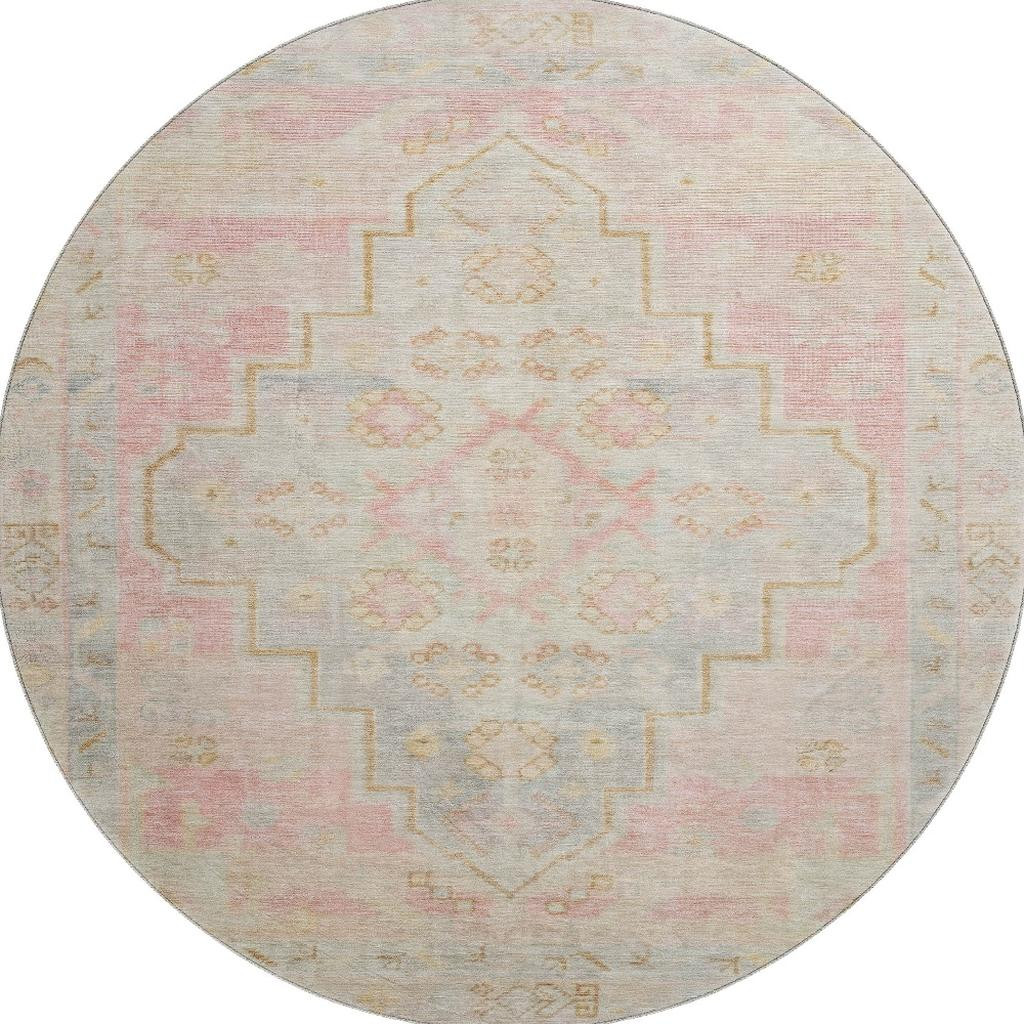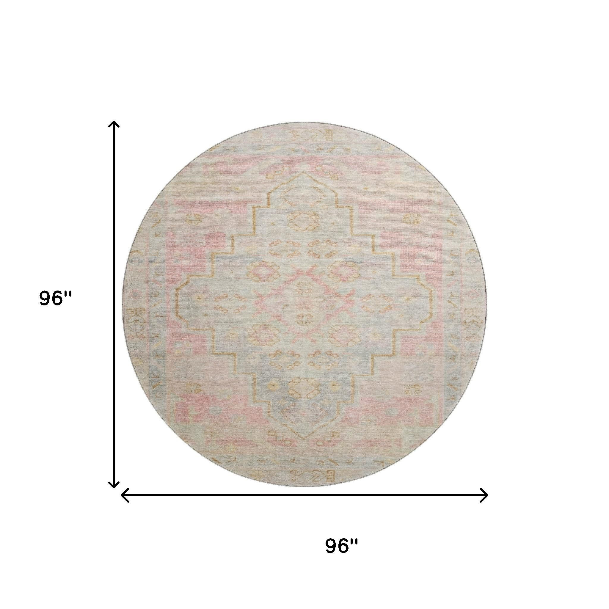 Add great coloration and comfortable texture to your space with this 8-foot pink and gray medallion washable round rug with uv protection. Ideal for spaces with kids and pets, this rug is stain resistant to help repel dirt and spilled liquids. Built to last, this rug crafted from polyester fibers is known for its durability and long lasting appeal. Rugs are a great way to showcase your style, hide imperfections, warm your home and reduce noise. This larger sized, transitional styled rug is ready to create a focal point or statement piece in your room. 96.00-inch h x 96.00-inch w x 0.39-inch d.