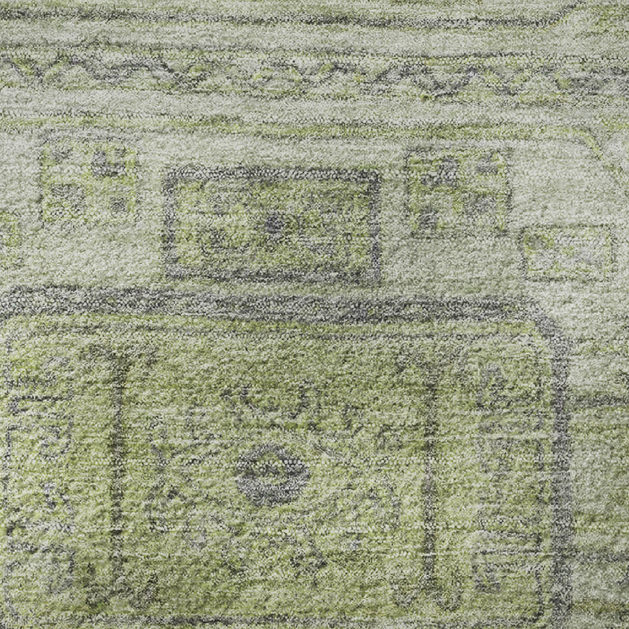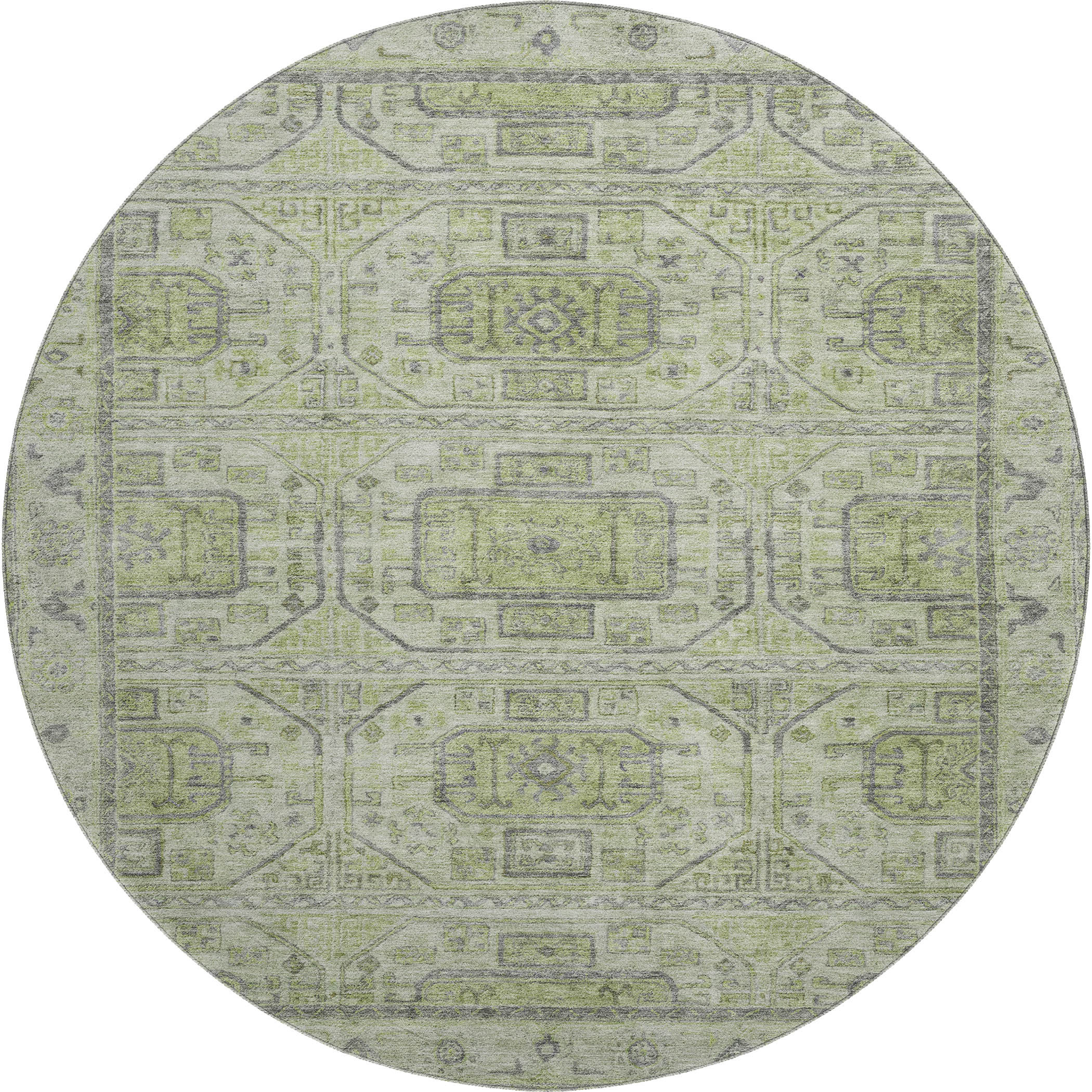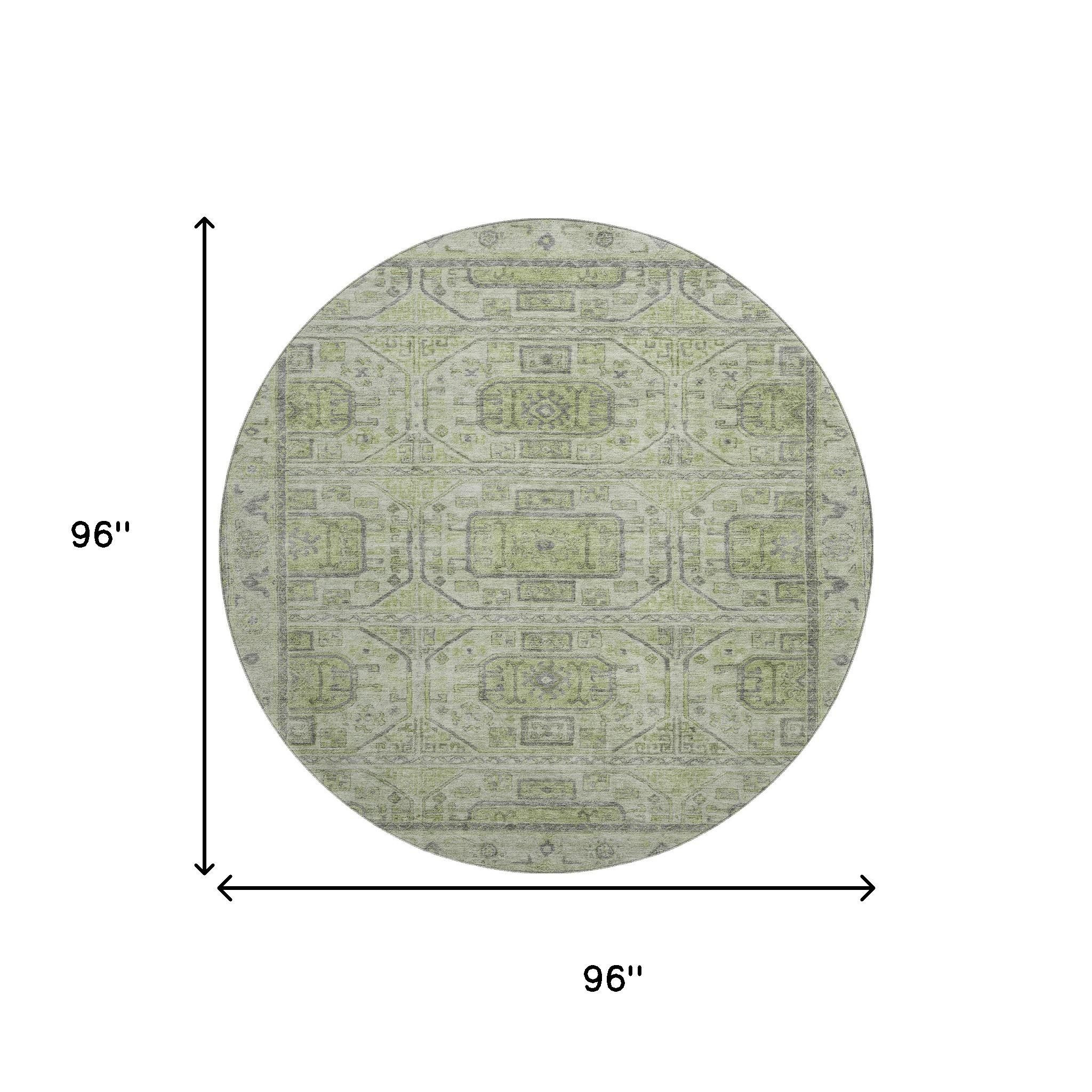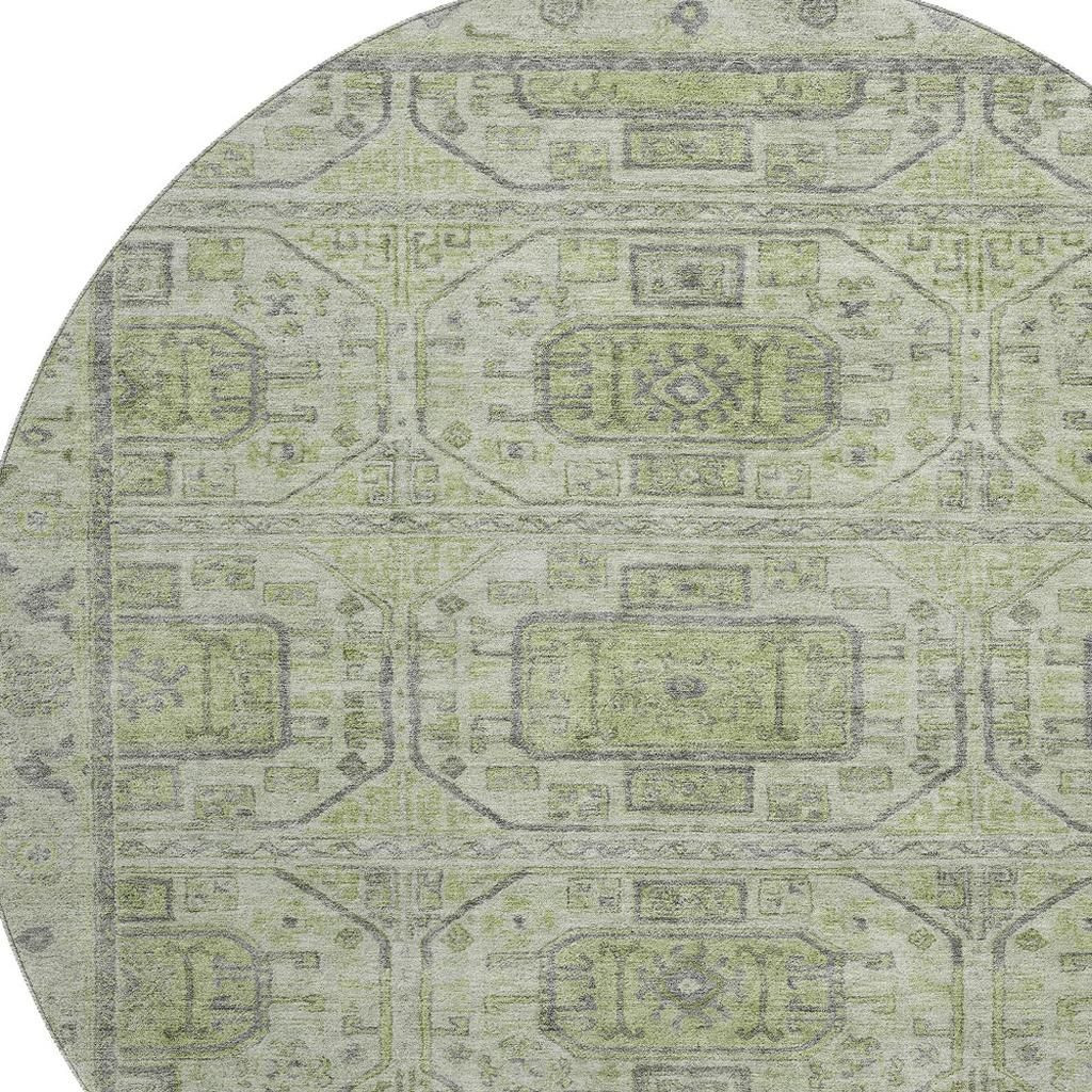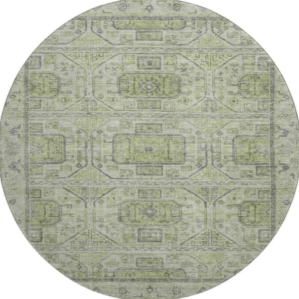 Add some artistry to your room with this 8-foot artichoke green and gray geometric washable round rug with uv protection. Ideal for spaces with kids and pets, this rug is stain resistant to help repel dirt and spilled liquids. Built to last, this rug crafted from polyester fibers is known for its durability and long lasting appeal. Rugs are a great way to showcase your style, hide imperfections, warm your home and reduce noise. This larger sized, transitional styled rug is ready to create a focal point or statement piece in your room. 96.00-inch h x 96.00-inch w x 0.39-inch d.