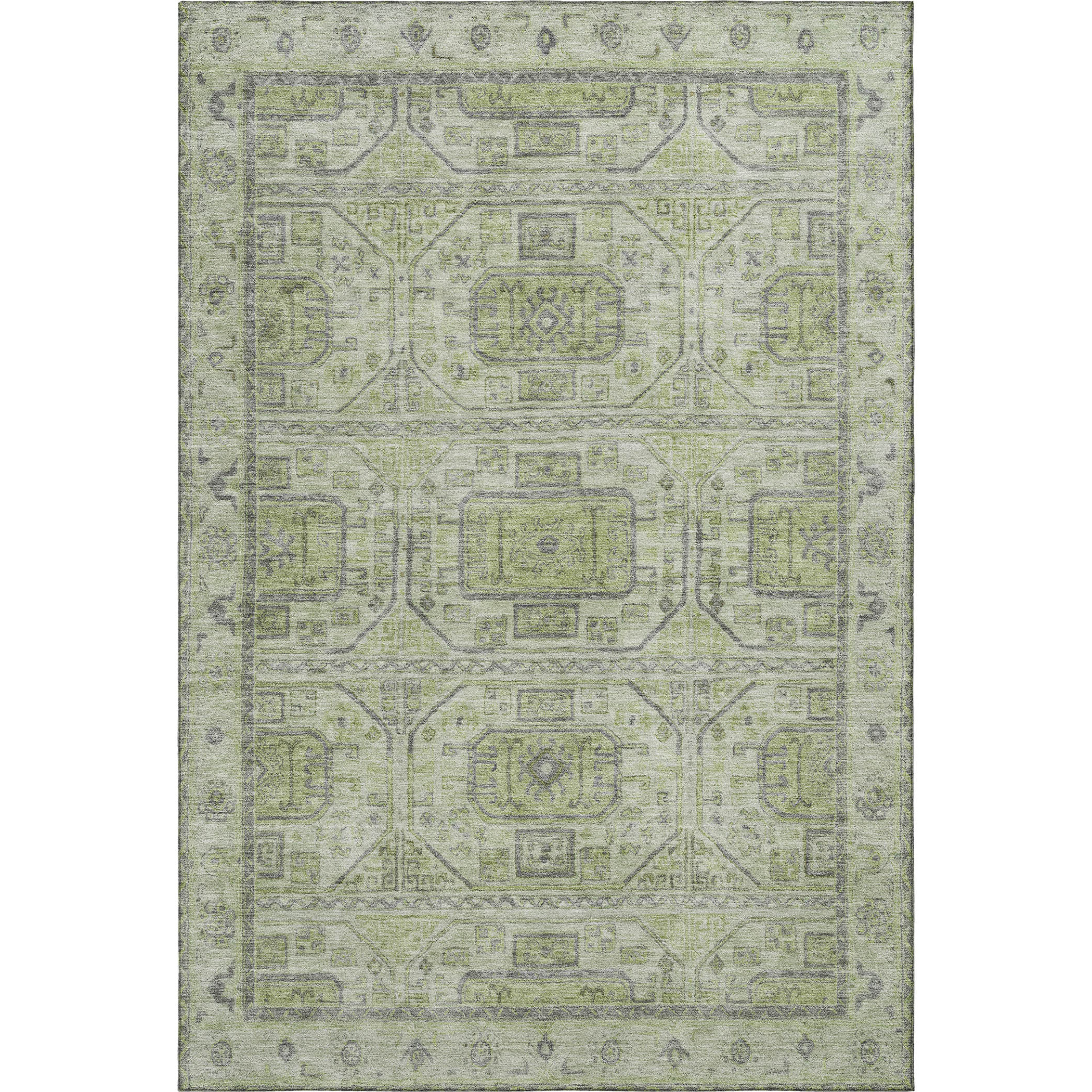 Add some artistry to your room with this 10-foot x 14-foot artichoke green and gray geometric washable area rug with uv protection. Ideal for spaces with kids and pets, this rug is stain resistant to help repel dirt and spilled liquids. Built to last, this rug crafted from polyester fibers is known for its durability and long lasting appeal. Rugs are a great way to showcase your style, hide imperfections, warm your home and reduce noise. This larger sized, transitional styled rug is ready to create a focal point or statement piece in your room. 120.00-inch h x 168.00-inch w x 0.39-inch d.