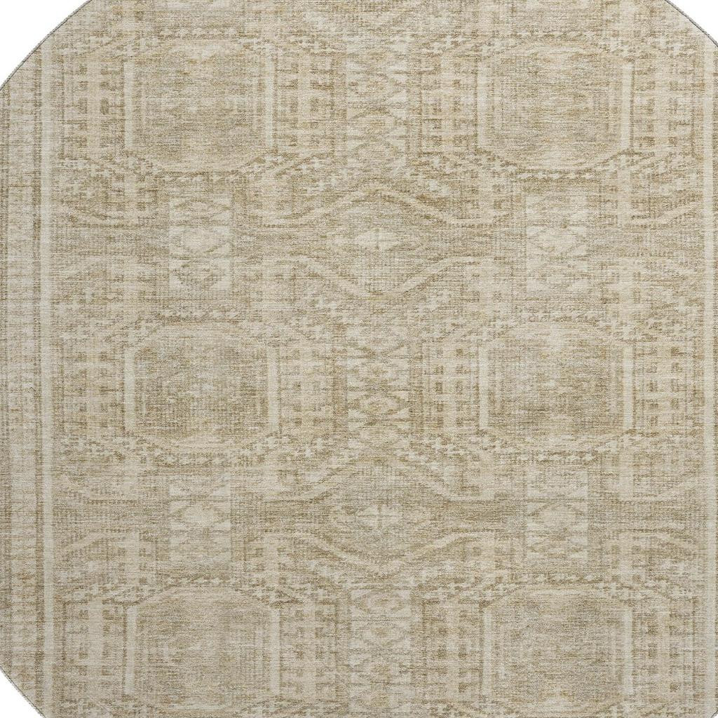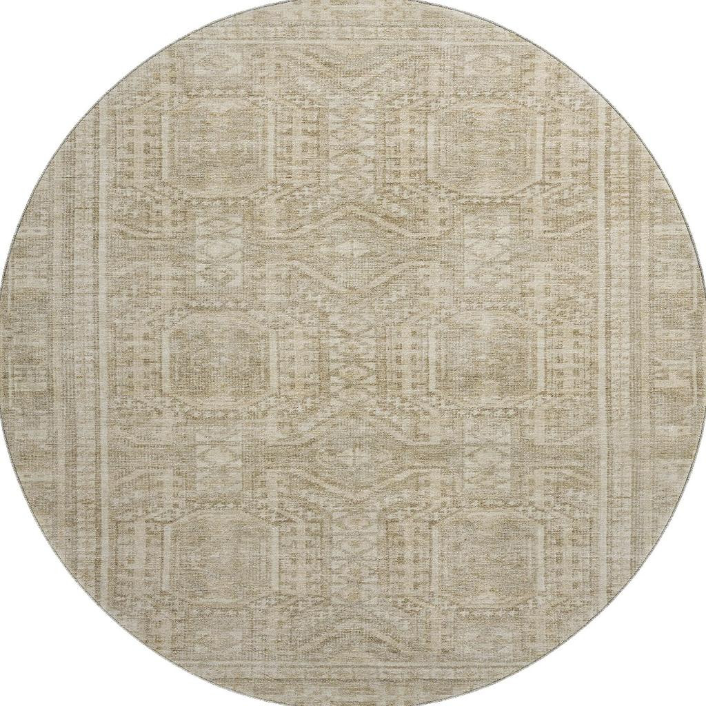 Add some artistry to your room with this 8-foot beige and taupe geometric washable round rug with uv protection. Ideal for spaces with kids and pets, this rug is stain resistant to help repel dirt and spilled liquids. Built to last, this rug crafted from polyester fibers is known for its durability and long lasting appeal. Rugs are a great way to showcase your style, hide imperfections, warm your home and reduce noise. This larger sized, transitional styled rug is ready to create a focal point or statement piece in your room. 96.00-inch h x 96.00-inch w x 0.39-inch d.