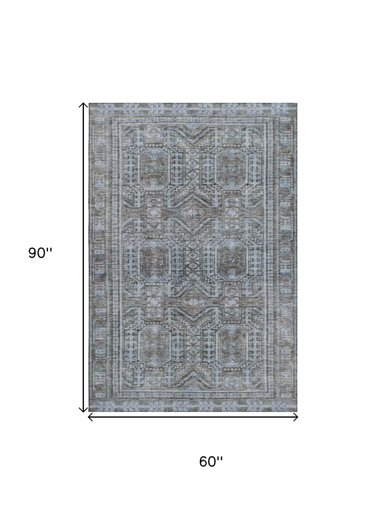 Add great coloration and comfortable texture to your space with this 5-foot x 8-foot chocolate and blue geometric washable area rug with uv protection. Ideal for spaces with kids and pets, this rug is stain resistant to help repel dirt and spilled liquids. Built to last, this rug crafted from polyester fibers is known for its durability and long lasting appeal. Rugs are a great way to showcase your style, hide imperfections, warm your home and reduce noise. This larger sized, transitional styled rug is ready to create a focal point or statement piece in your room. 60.00-inch h x 90.00-inch w x 0.39-inch d.