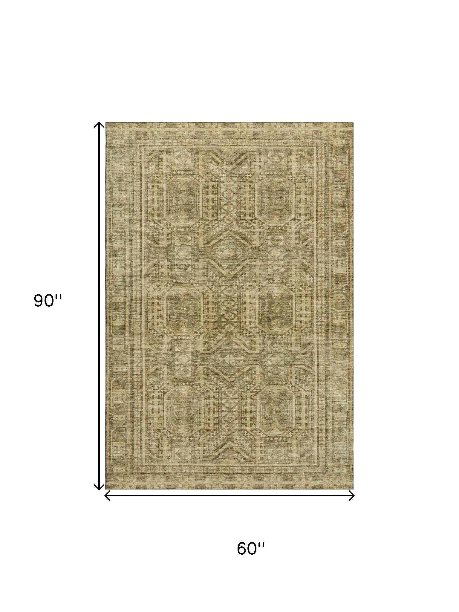 Add some artistry to your room with this 5-foot x 8-foot khaki and taupe geometric washable area rug with uv protection. Ideal for spaces with kids and pets, this rug is stain resistant to help repel dirt and spilled liquids. Built to last, this rug crafted from polyester fibers is known for its durability and long lasting appeal. Rugs are a great way to showcase your style, hide imperfections, warm your home and reduce noise. This larger sized, transitional styled rug is ready to create a focal point or statement piece in your room. 60.00-inch h x 90.00-inch w x 0.39-inch d.