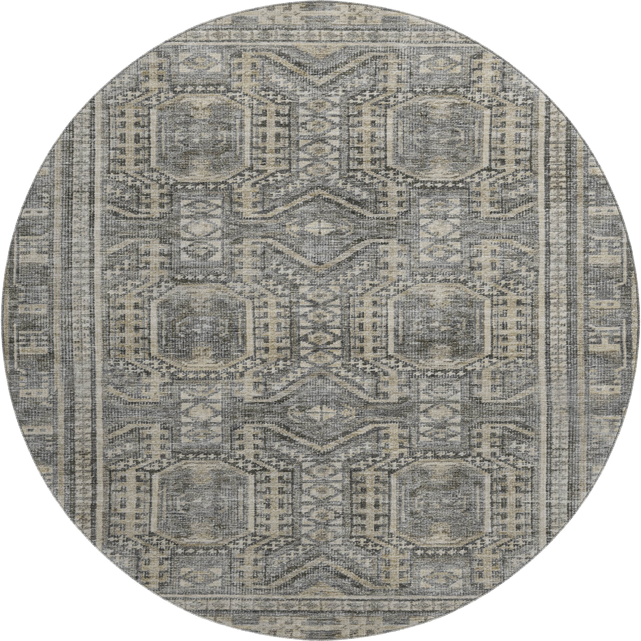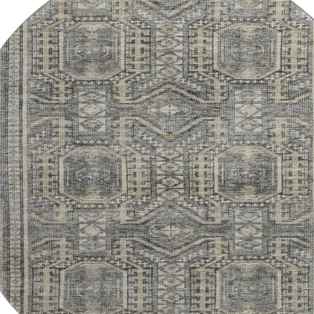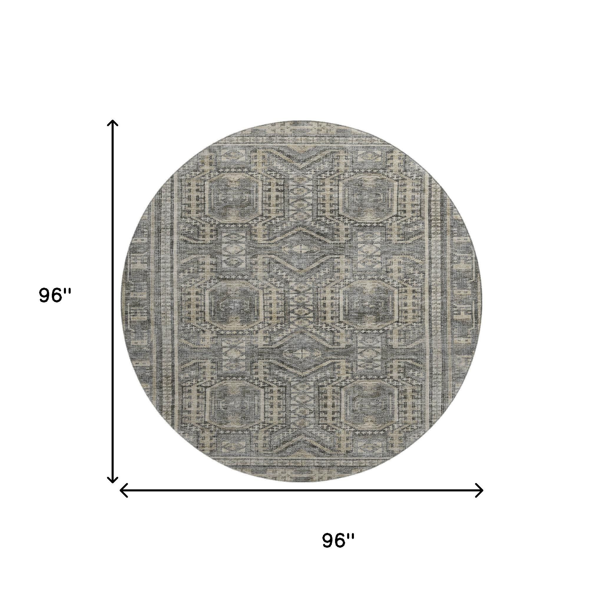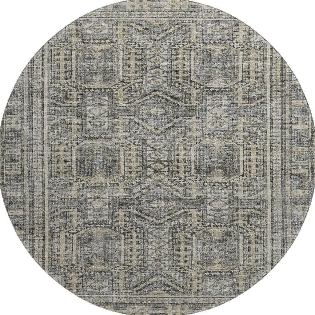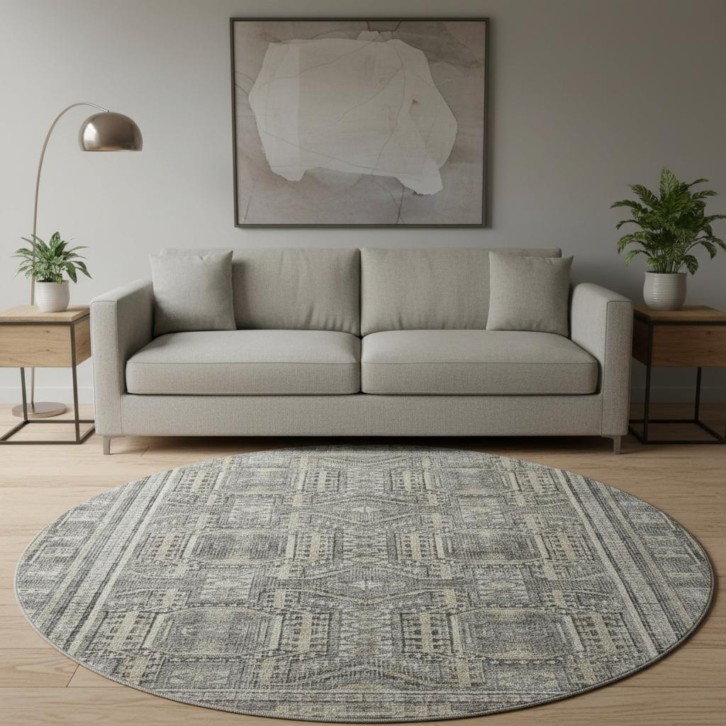 This 8-foot pewter and gray geometric washable round rug with uv protection, is a great way to add warmth to a room. Ideal for spaces with kids and pets, this rug is stain resistant to help repel dirt and spilled liquids. Built to last, this rug crafted from polyester fibers is known for its durability and long lasting appeal. Rugs are a great way to showcase your style, hide imperfections, warm your home and reduce noise. This larger sized, transitional styled rug is ready to create a focal point or statement piece in your room. 96.00-inch h x 96.00-inch w x 0.39-inch d.
