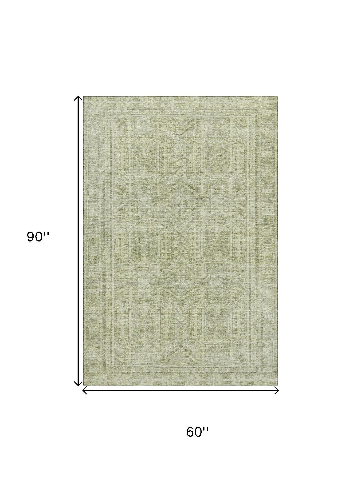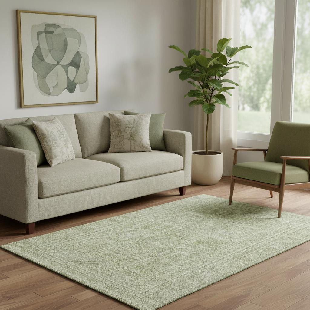 Set an inviting tone in your space with this 5-foot x 8-foot sage and fern green geometric washable area rug with uv protection. Ideal for spaces with kids and pets, this rug is stain resistant to help repel dirt and spilled liquids. Built to last, this rug crafted from polyester fibers is known for its durability and long lasting appeal. Rugs are a great way to showcase your style, hide imperfections, warm your home and reduce noise. This larger sized, transitional styled rug is ready to create a focal point or statement piece in your room. 60.00-inch h x 90.00-inch w x 0.39-inch d.