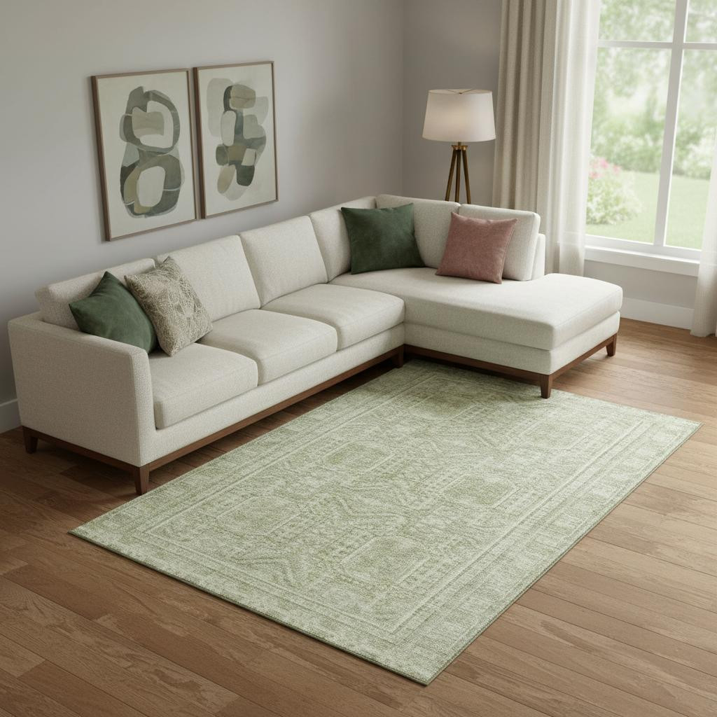 Add great coloration and comfortable texture to your space with this 9-foot x 12-foot sage and fern green geometric washable area rug with uv protection. Ideal for spaces with kids and pets, this rug is stain resistant to help repel dirt and spilled liquids. Built to last, this rug crafted from polyester fibers is known for its durability and long lasting appeal. Rugs are a great way to showcase your style, hide imperfections, warm your home and reduce noise. This larger sized, transitional styled rug is ready to create a focal point or statement piece in your room. 108.00-inch h x 144.00-inch w x 0.39-inch d.