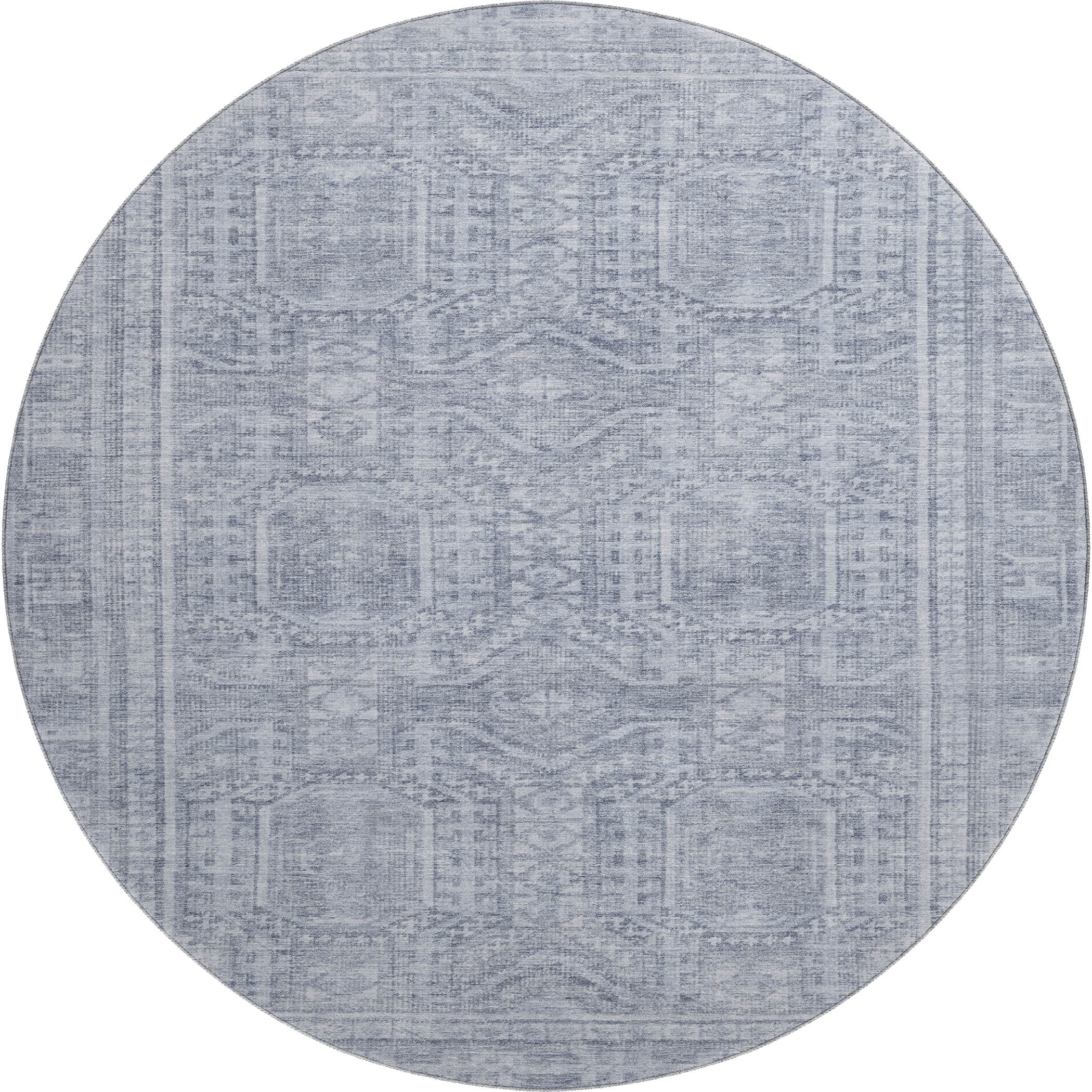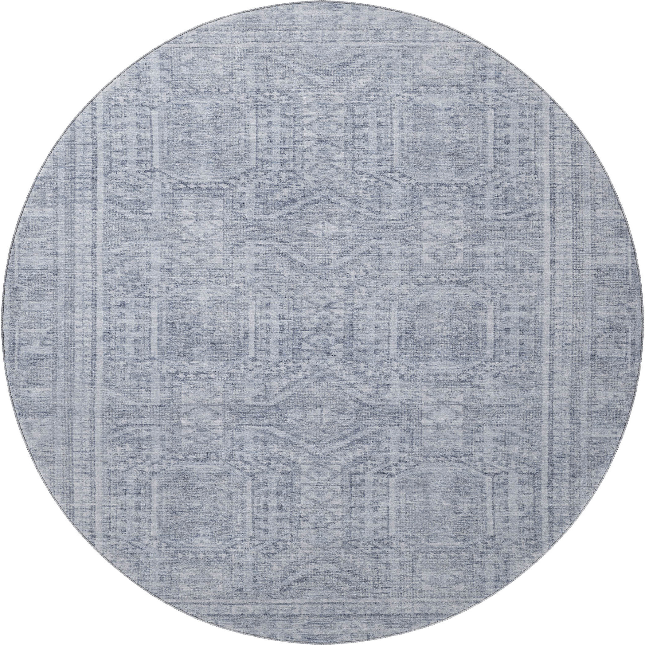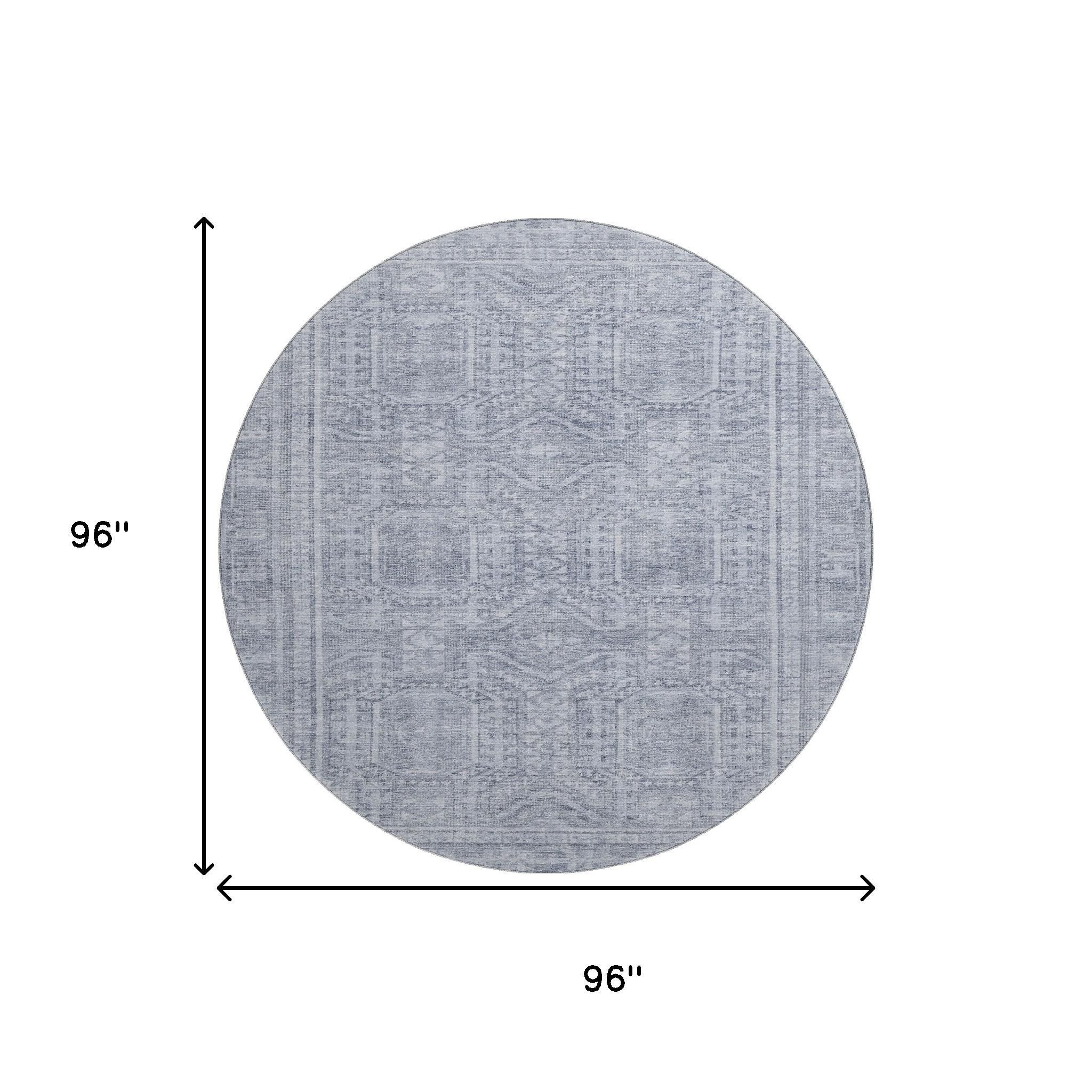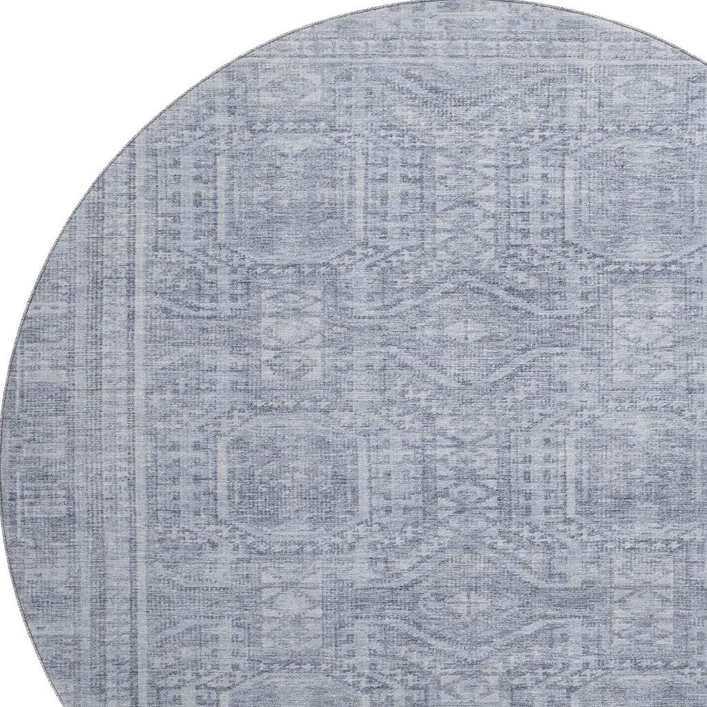 Add some artistry to your room with this 8-foot sky blue and gray geometric washable round rug with uv protection. Ideal for spaces with kids and pets, this rug is stain resistant to help repel dirt and spilled liquids. Built to last, this rug crafted from polyester fibers is known for its durability and long lasting appeal. Rugs are a great way to showcase your style, hide imperfections, warm your home and reduce noise. This larger sized, transitional styled rug is ready to create a focal point or statement piece in your room. 96.00-inch h x 96.00-inch w x 0.39-inch d.