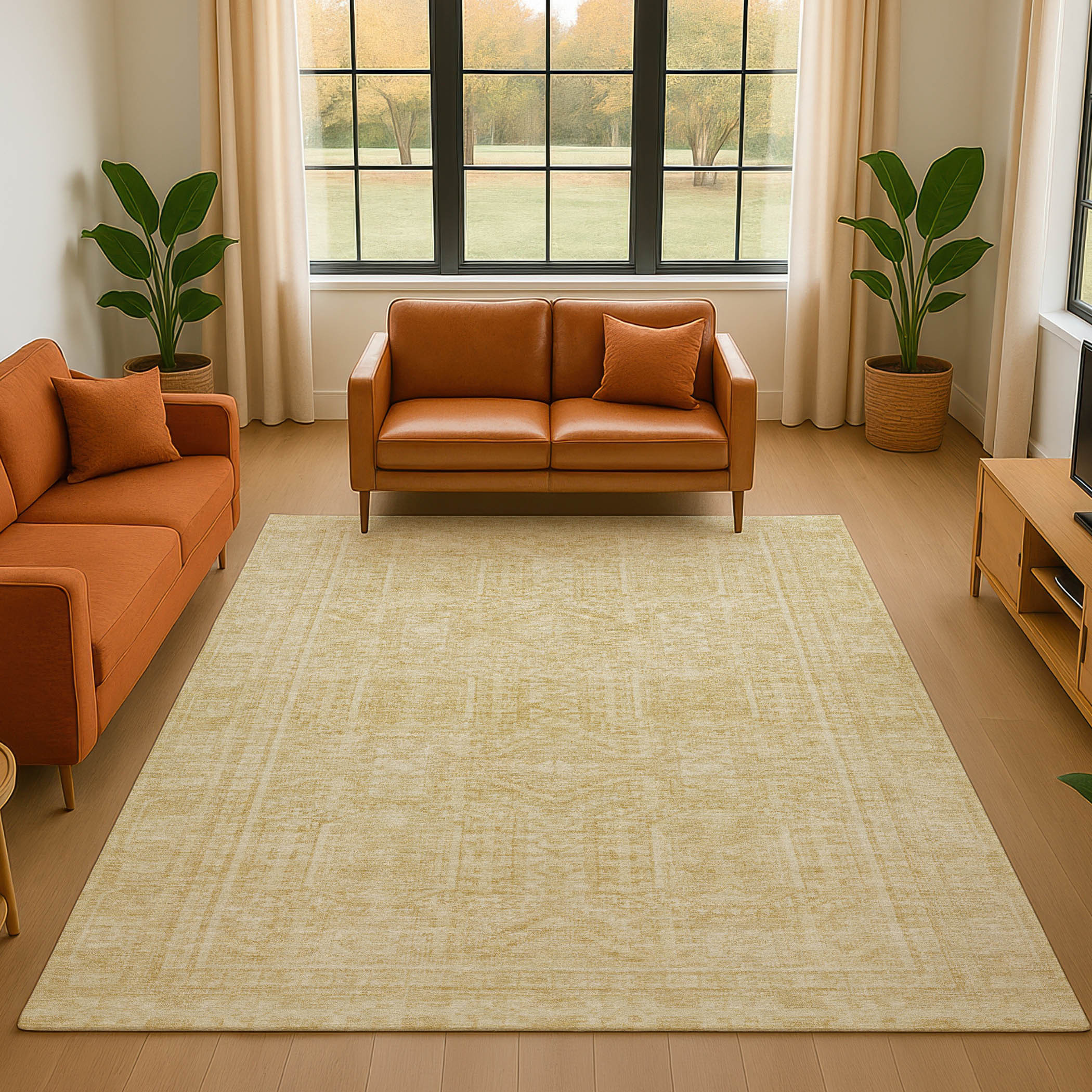 This 5-foot x 8-foot wheat and beige geometric washable area rug with uv protection, is a great way to add warmth to a room. Ideal for spaces with kids and pets, this rug is stain resistant to help repel dirt and spilled liquids. Built to last, this rug crafted from polyester fibers is known for its durability and long lasting appeal. Rugs are a great way to showcase your style, hide imperfections, warm your home and reduce noise. This larger sized, transitional styled rug is ready to create a focal point or statement piece in your room. 60.00-inch h x 90.00-inch w x 0.39-inch d.