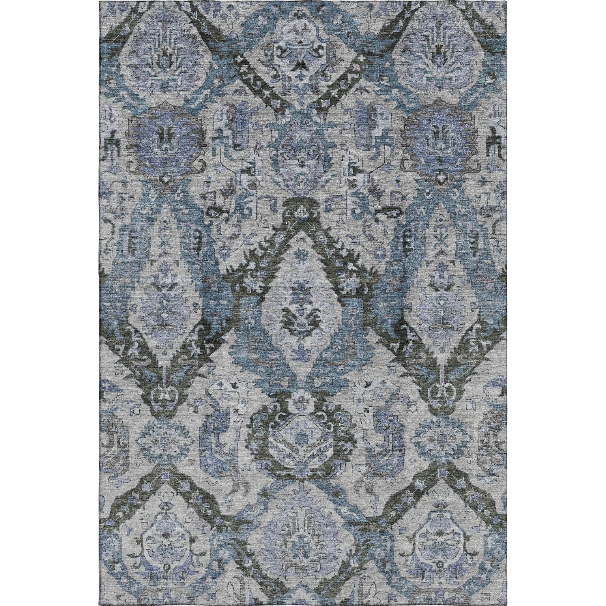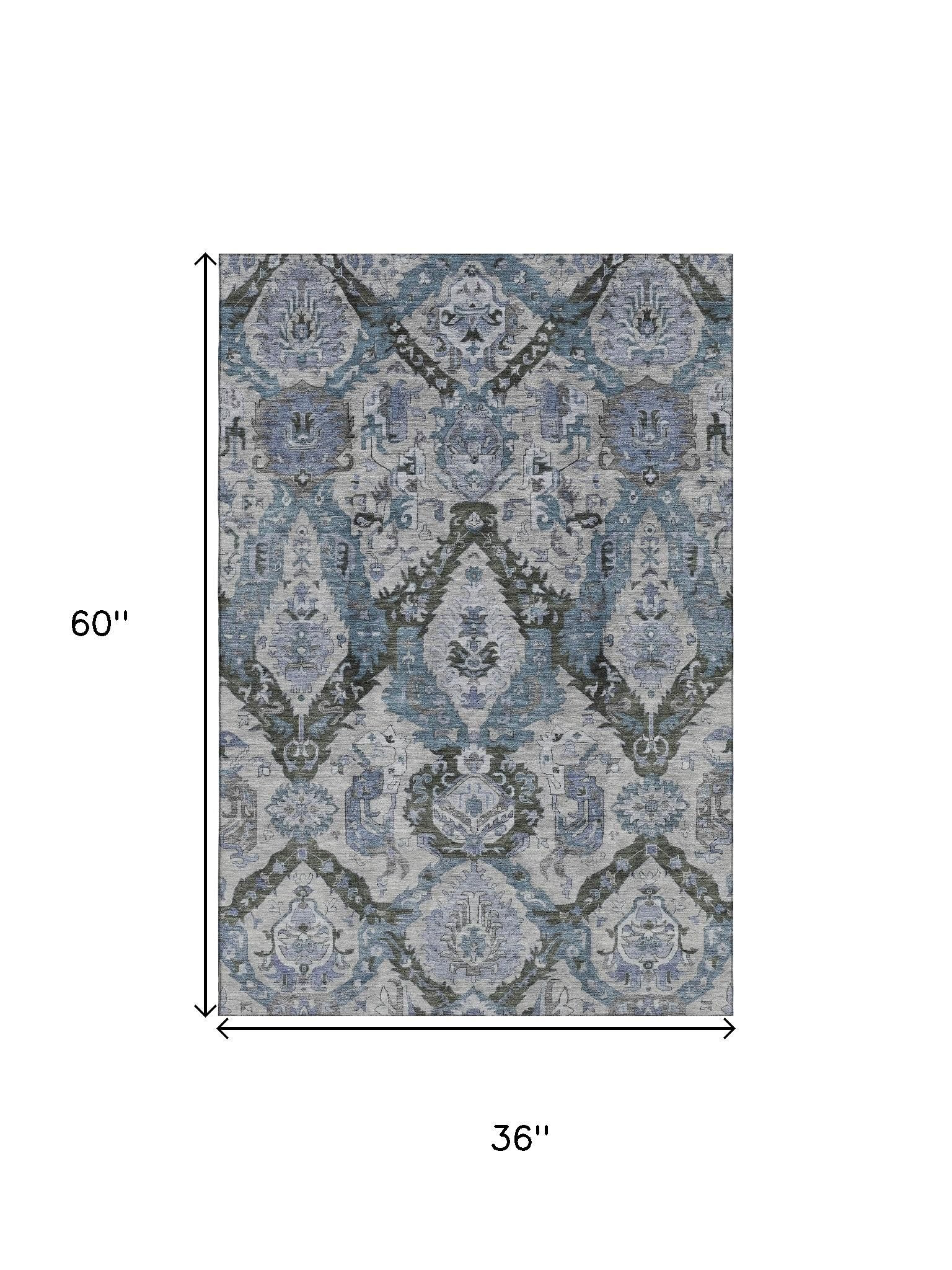 This 3-foot x 5-foot gray and blue ikat washable area rug with uv protection, is a great way to add warmth to a room. Ideal for spaces with kids and pets, this rug is stain resistant to help repel dirt and spilled liquids. Built to last, this rug crafted from polyester fibers is known for its durability and long lasting appeal. Rugs are a great way to showcase your style, hide imperfections, warm your home and reduce noise. This smaller sized, transitional styled rug is just what you need for your walkway, bedside, in front of door, cabinet, refrigerator, or chair. 36.00-inch h x 60.00-inch w x 0.39-inch d.