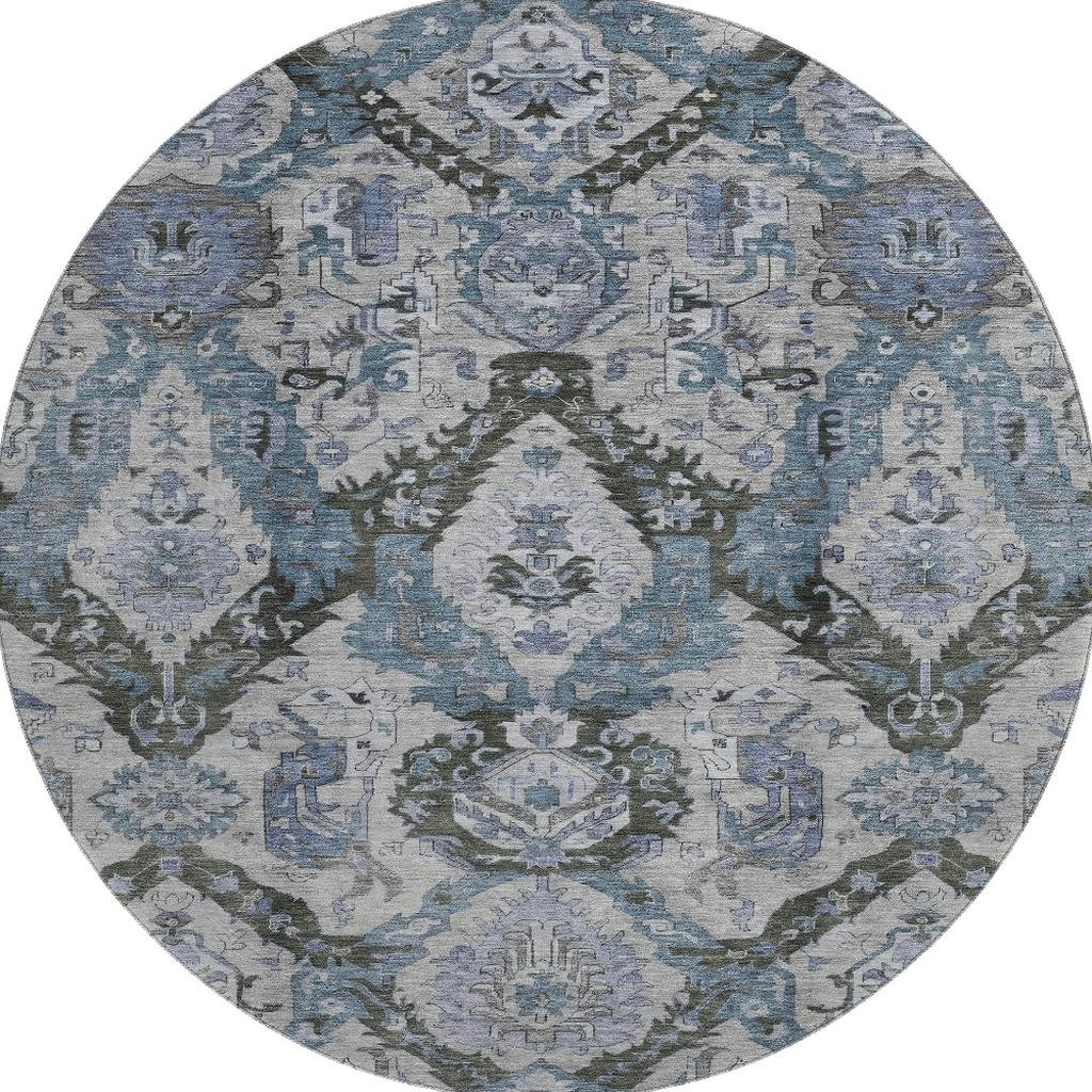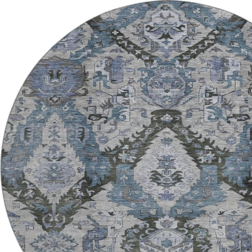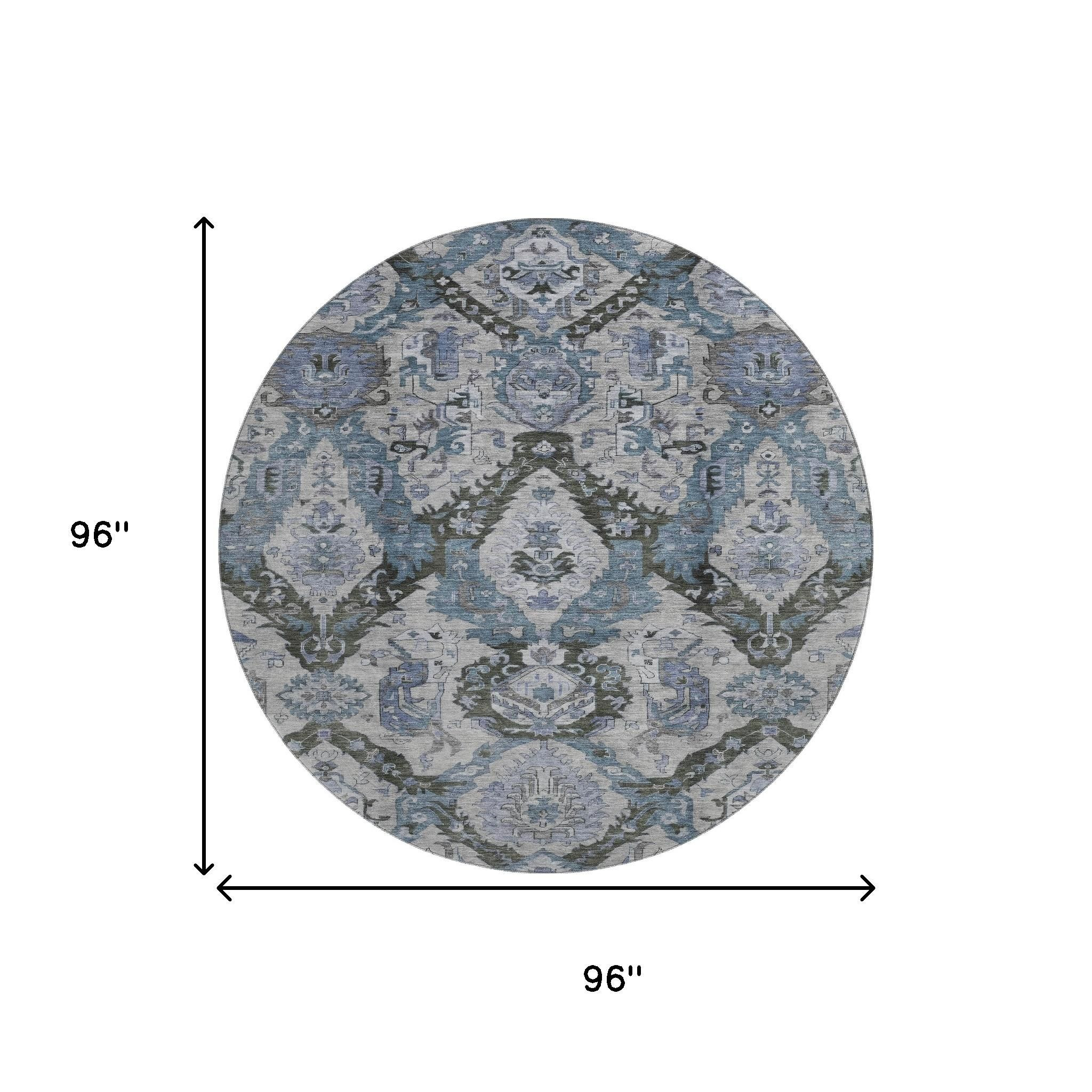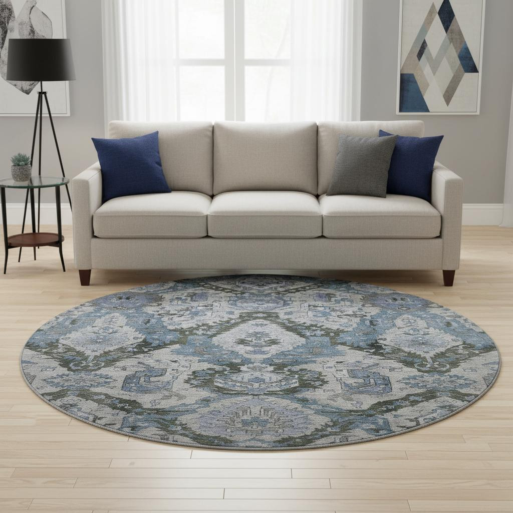 Set an inviting tone in your space with this 8-foot gray and blue ikat washable round rug with uv protection. Ideal for spaces with kids and pets, this rug is stain resistant to help repel dirt and spilled liquids. Built to last, this rug crafted from polyester fibers is known for its durability and long lasting appeal. Rugs are a great way to showcase your style, hide imperfections, warm your home and reduce noise. This larger sized, transitional styled rug is ready to create a focal point or statement piece in your room. 96.00-inch h x 96.00-inch w x 0.39-inch d.