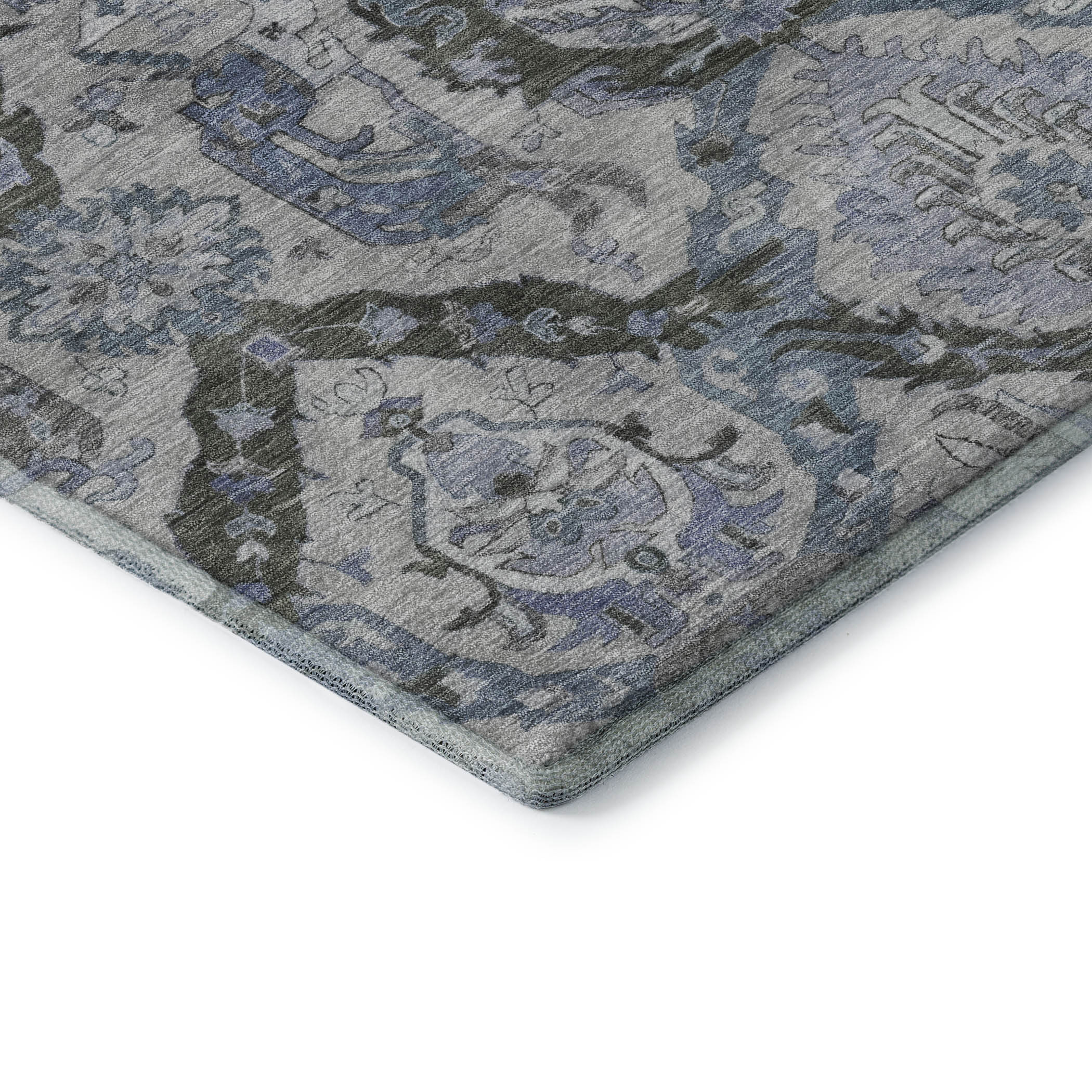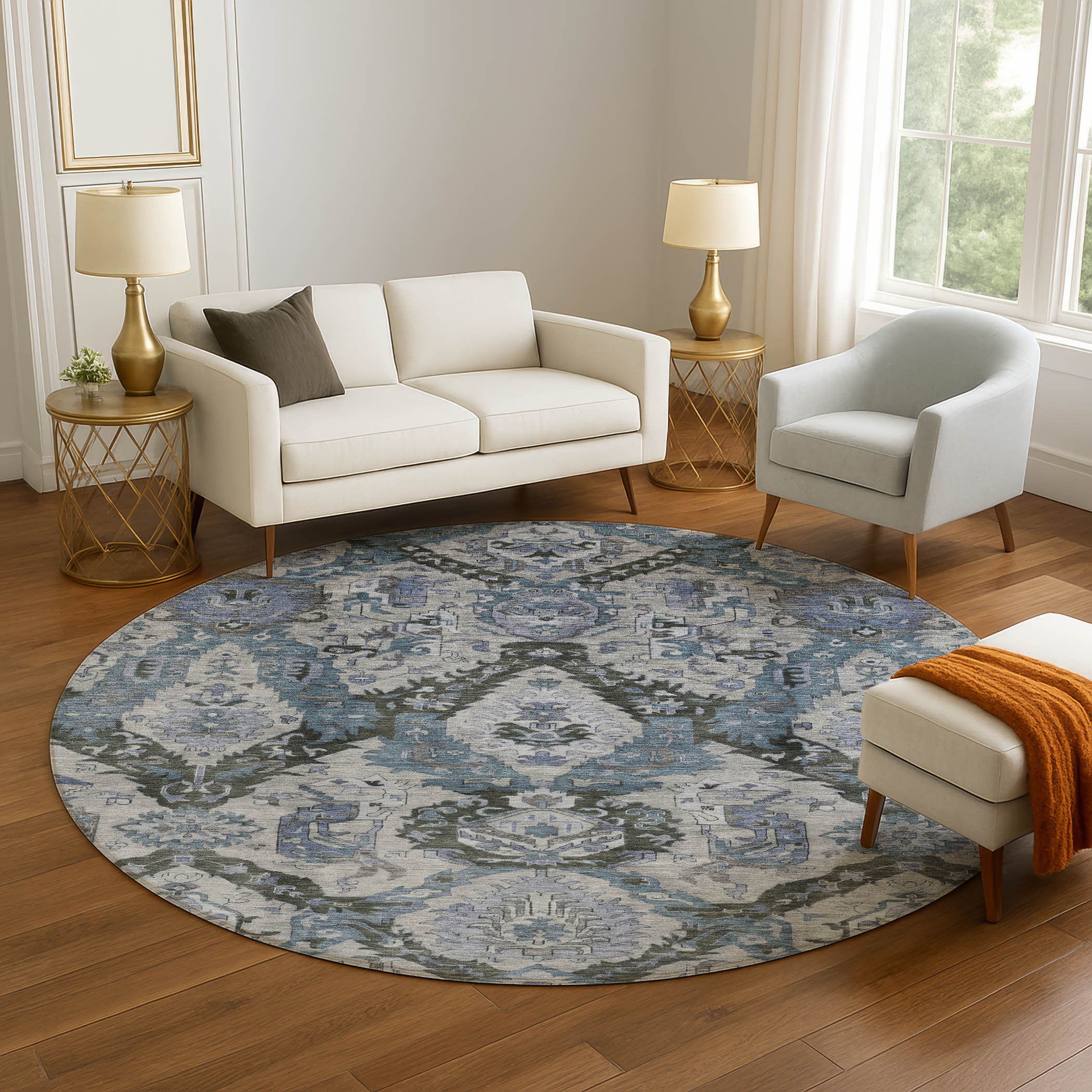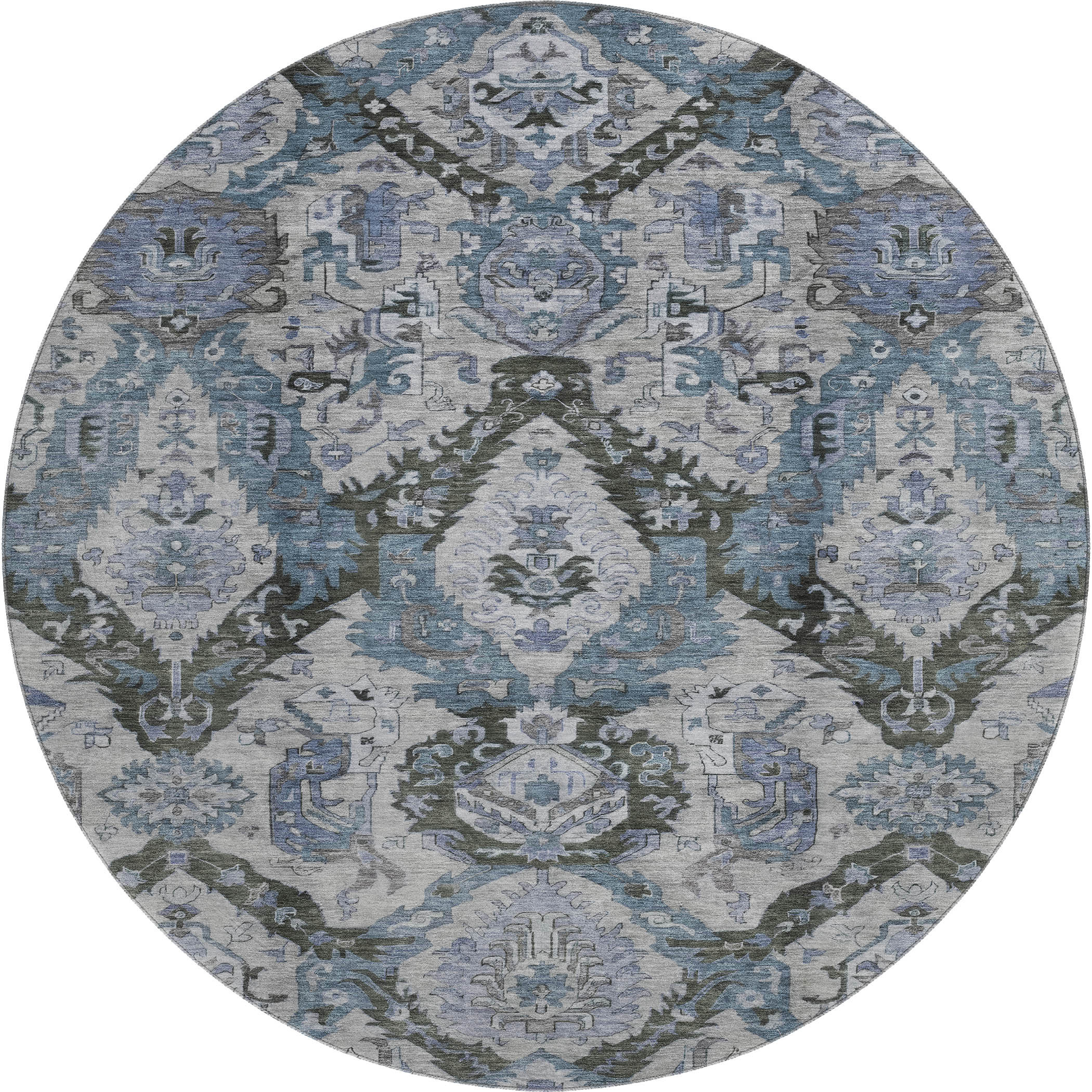 Set an inviting tone in your space with this 8-foot gray and blue ikat washable round rug with uv protection. Ideal for spaces with kids and pets, this rug is stain resistant to help repel dirt and spilled liquids. Built to last, this rug crafted from polyester fibers is known for its durability and long lasting appeal. Rugs are a great way to showcase your style, hide imperfections, warm your home and reduce noise. This larger sized, transitional styled rug is ready to create a focal point or statement piece in your room. 96.00-inch h x 96.00-inch w x 0.39-inch d.