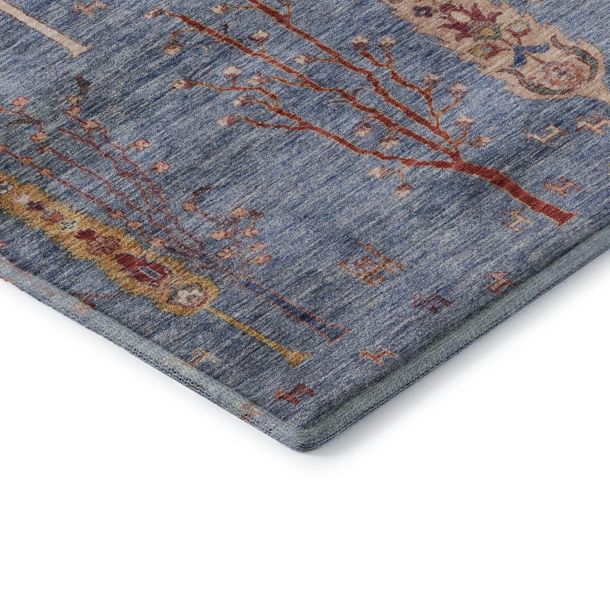 Set an inviting tone in your space with this 5-foot x 8-foot blue and rust floral washable area rug with uv protection. Ideal for spaces with kids and pets, this rug is stain resistant to help repel dirt and spilled liquids. Built to last, this rug crafted from polyester fibers is known for its durability and long lasting appeal. Rugs are a great way to showcase your style, hide imperfections, warm your home and reduce noise. This larger sized, transitional styled rug is ready to create a focal point or statement piece in your room. 60.00-inch h x 90.00-inch w x 0.39-inch d.