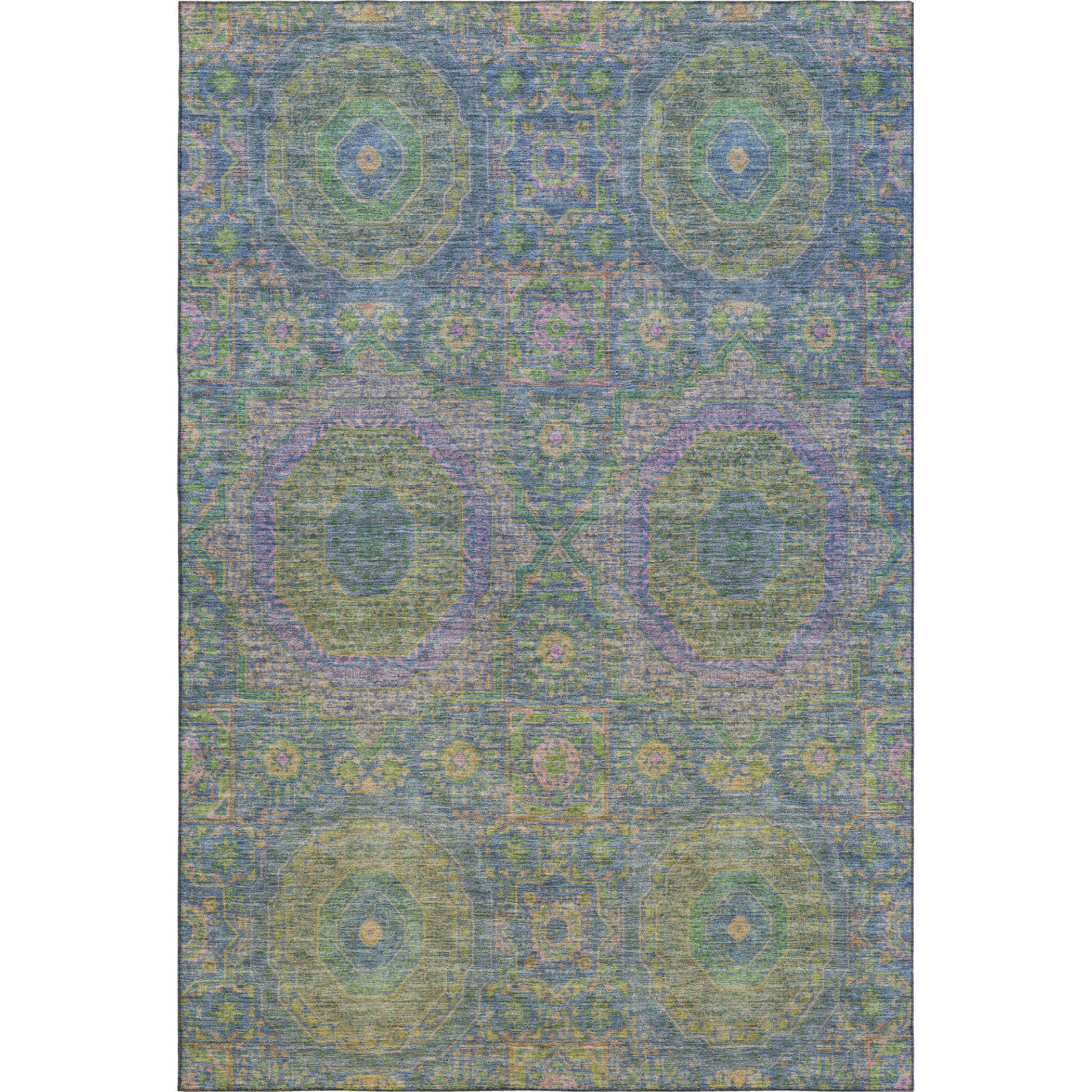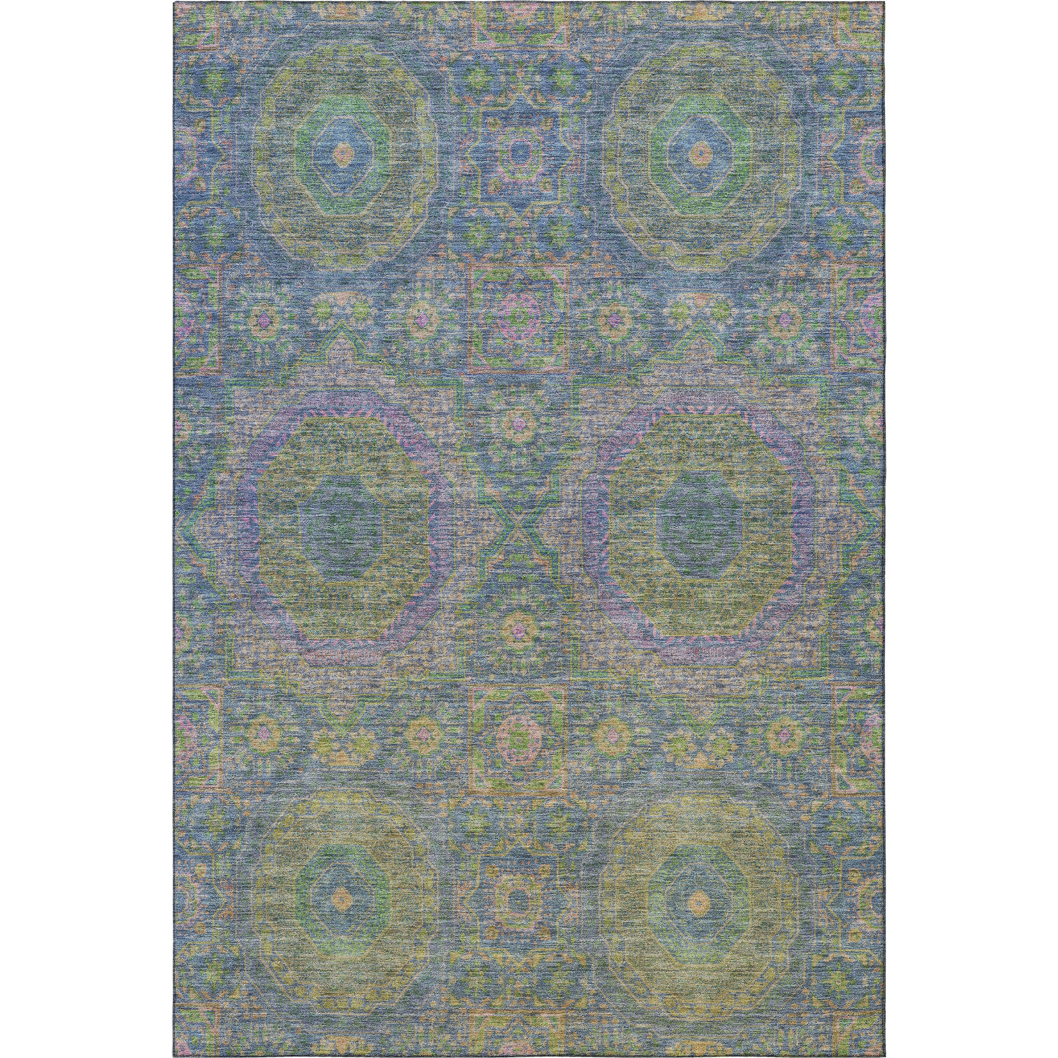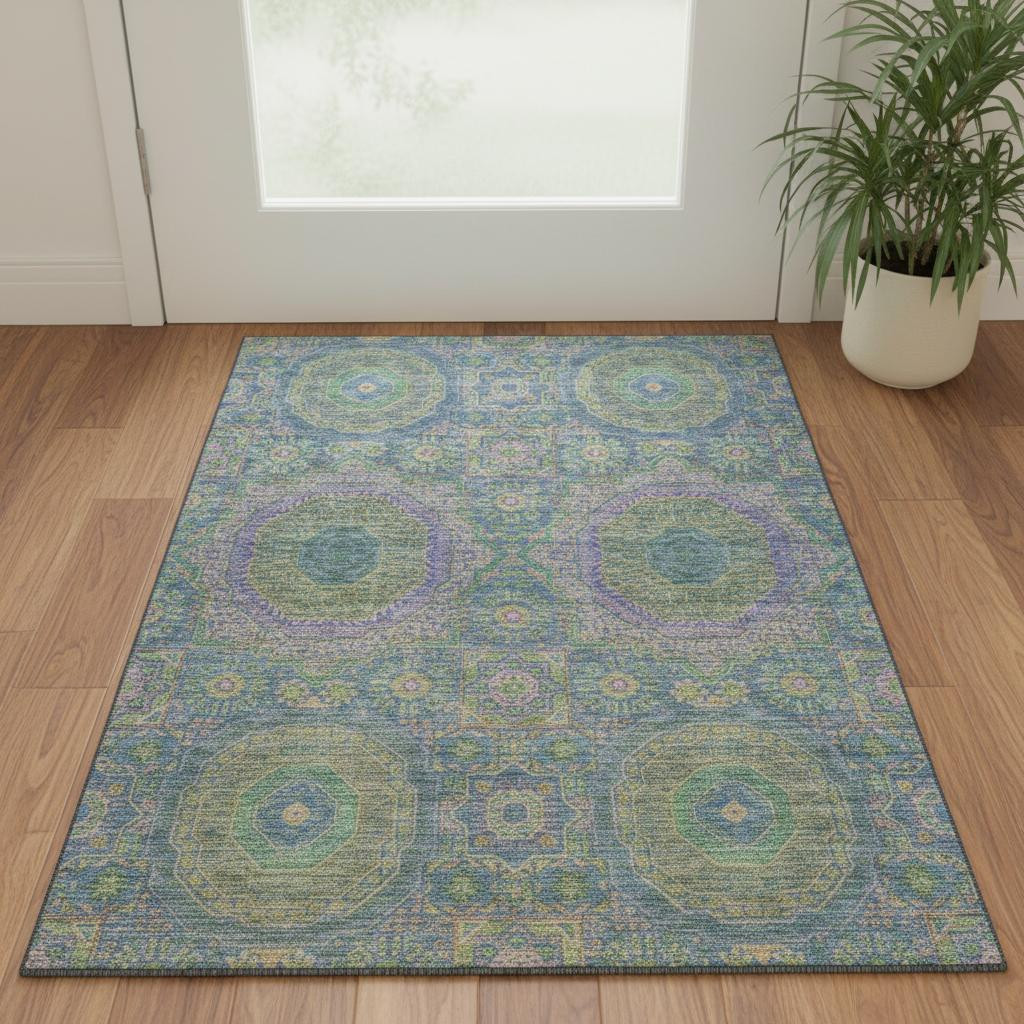 Set an inviting tone in your space with this 3-foot x 5-foot blue purple and green medallion washable area rug with uv protection. Ideal for spaces with kids and pets, this rug is stain resistant to help repel dirt and spilled liquids. Built to last, this rug crafted from polyester fibers is known for its durability and long lasting appeal. Rugs are a great way to showcase your style, hide imperfections, warm your home and reduce noise. This smaller sized, transitional styled rug is just what you need for your walkway, bedside, in front of door, cabinet, refrigerator, or chair. 36.00-inch h x 60.00-inch w x 0.39-inch d.