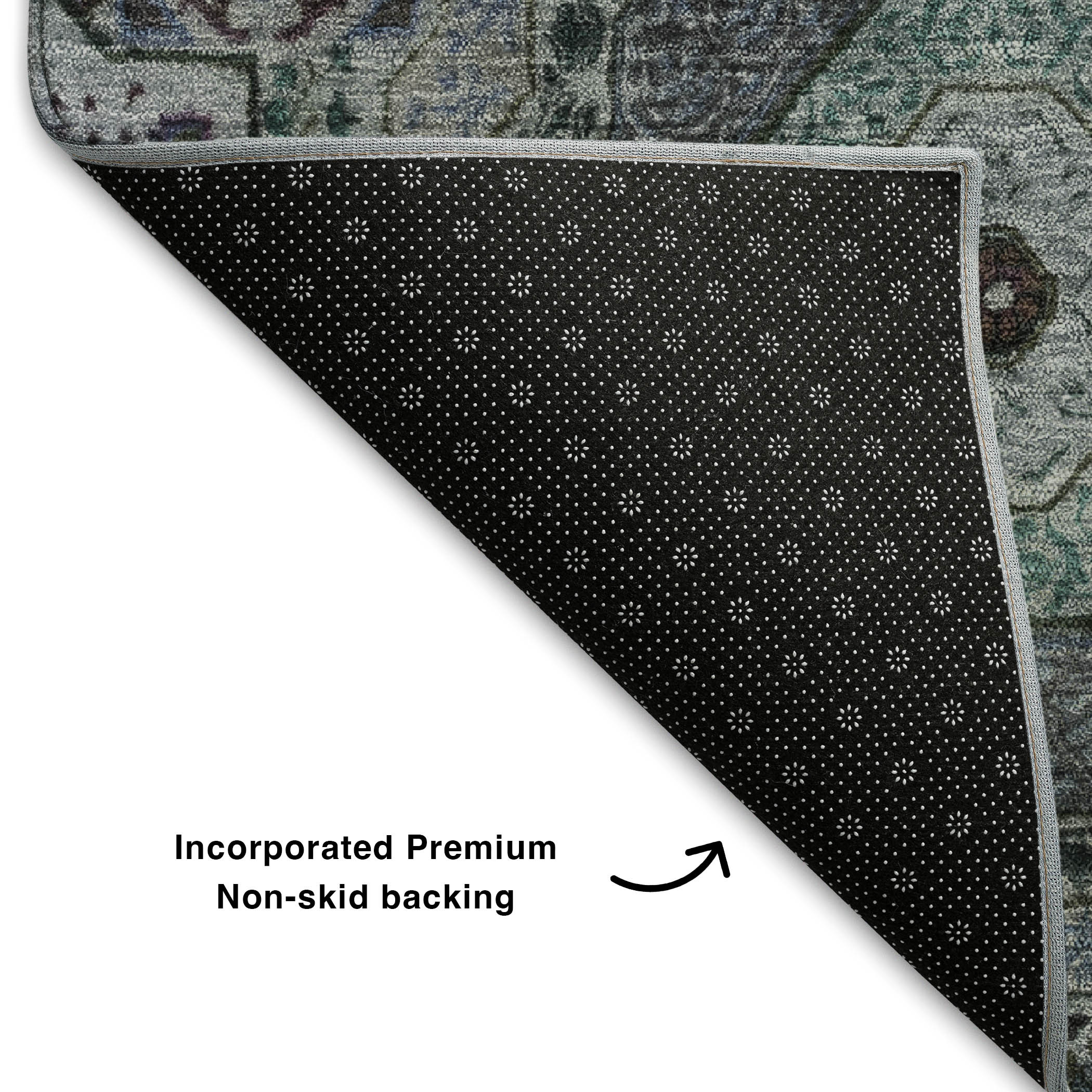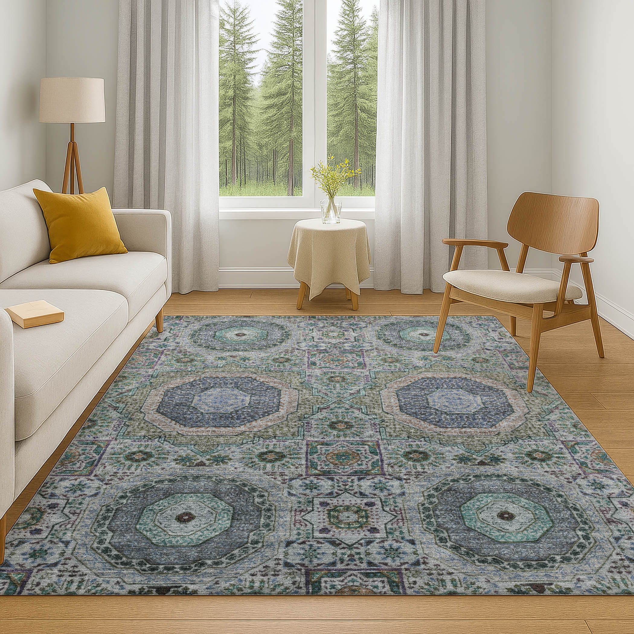 This 3-foot x 5-foot green blue and gray medallion washable area rug with uv protection, is a great way to add warmth to a room. Ideal for spaces with kids and pets, this rug is stain resistant to help repel dirt and spilled liquids. Built to last, this rug crafted from polyester fibers is known for its durability and long lasting appeal. Rugs are a great way to showcase your style, hide imperfections, warm your home and reduce noise. This smaller sized, transitional styled rug is just what you need for your walkway, bedside, in front of door, cabinet, refrigerator, or chair. 36.00-inch h x 60.00-inch w x 0.39-inch d.