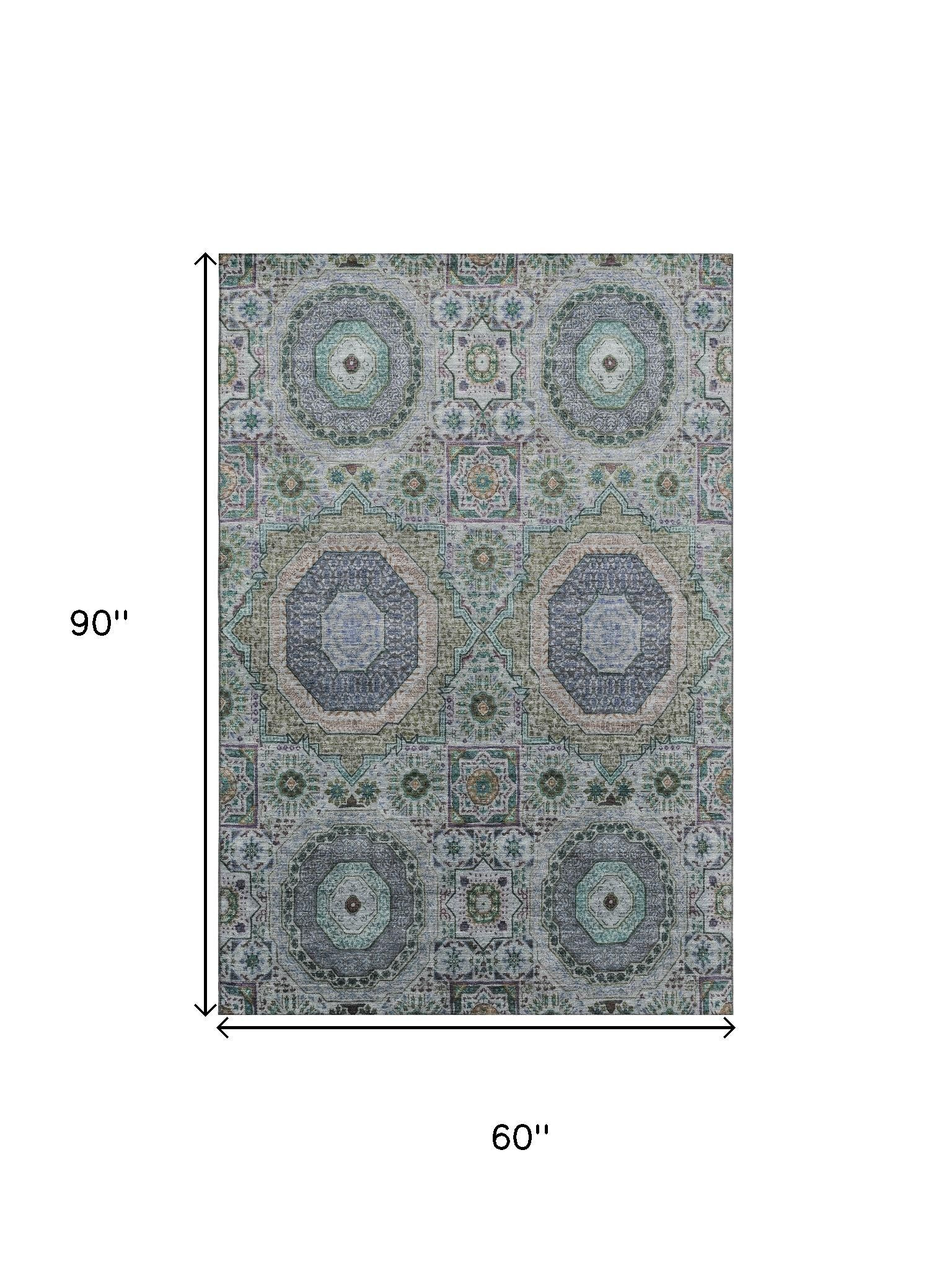 Add great coloration and comfortable texture to your space with this 5-foot x 8-foot green blue and gray medallion washable area rug with uv protection. Ideal for spaces with kids and pets, this rug is stain resistant to help repel dirt and spilled liquids. Built to last, this rug crafted from polyester fibers is known for its durability and long lasting appeal. Rugs are a great way to showcase your style, hide imperfections, warm your home and reduce noise. This larger sized, transitional styled rug is ready to create a focal point or statement piece in your room. 60.00-inch h x 90.00-inch w x 0.39-inch d.