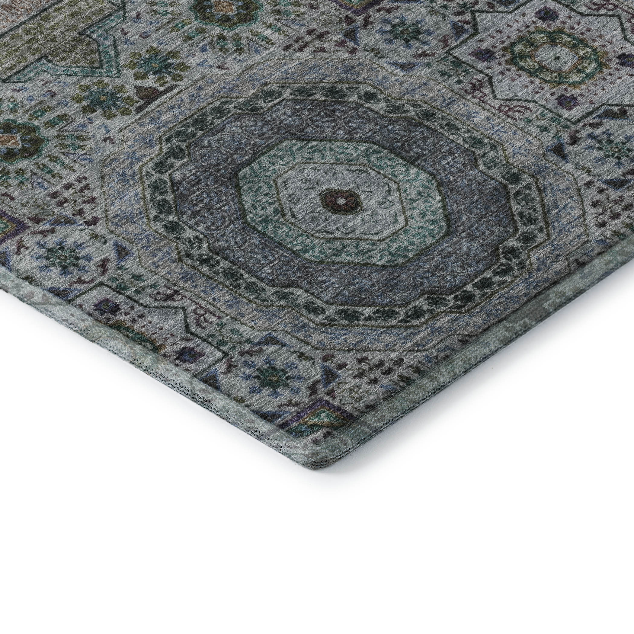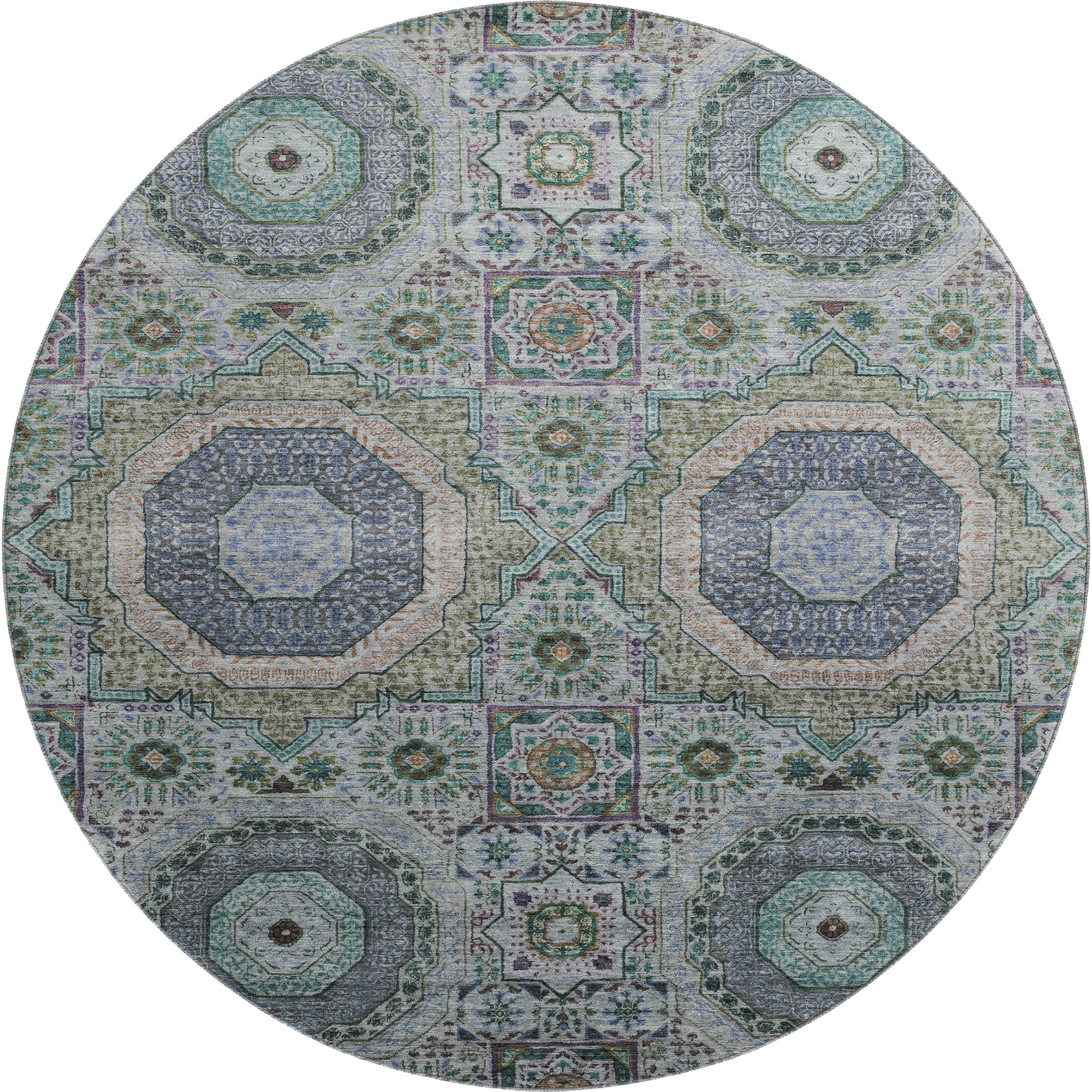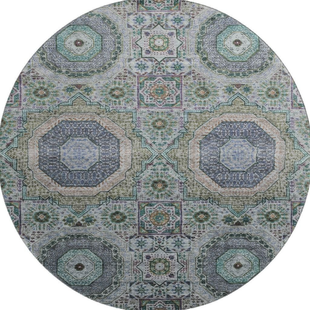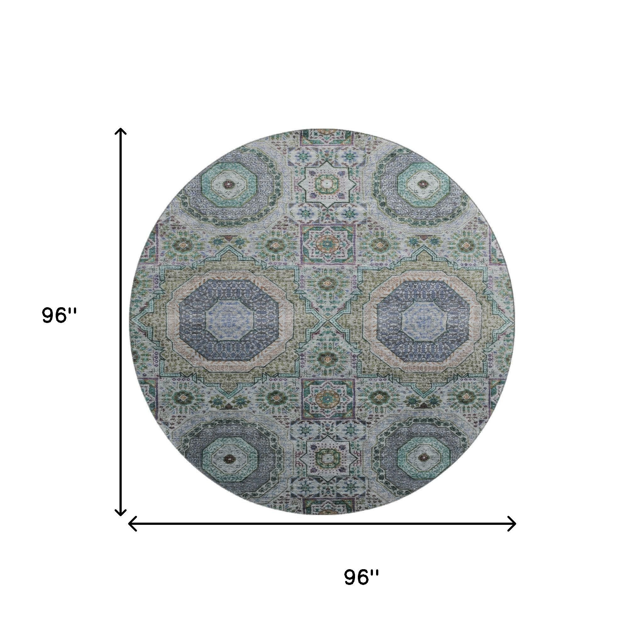 Add some artistry to your room with this 8-foot green blue and gray medallion washable round rug with uv protection. Ideal for spaces with kids and pets, this rug is stain resistant to help repel dirt and spilled liquids. Built to last, this rug crafted from polyester fibers is known for its durability and long lasting appeal. Rugs are a great way to showcase your style, hide imperfections, warm your home and reduce noise. This larger sized, transitional styled rug is ready to create a focal point or statement piece in your room. 96.00-inch h x 96.00-inch w x 0.39-inch d.