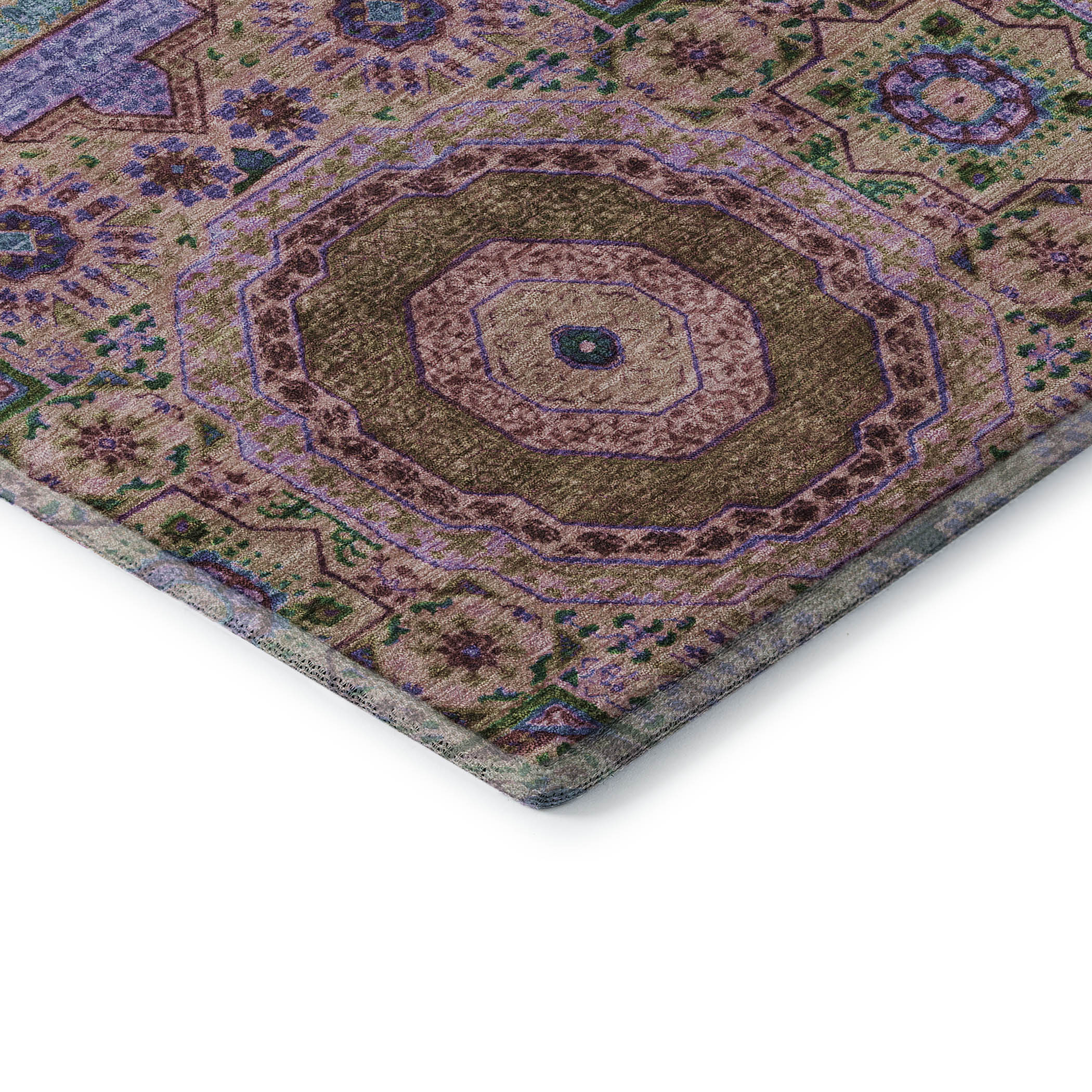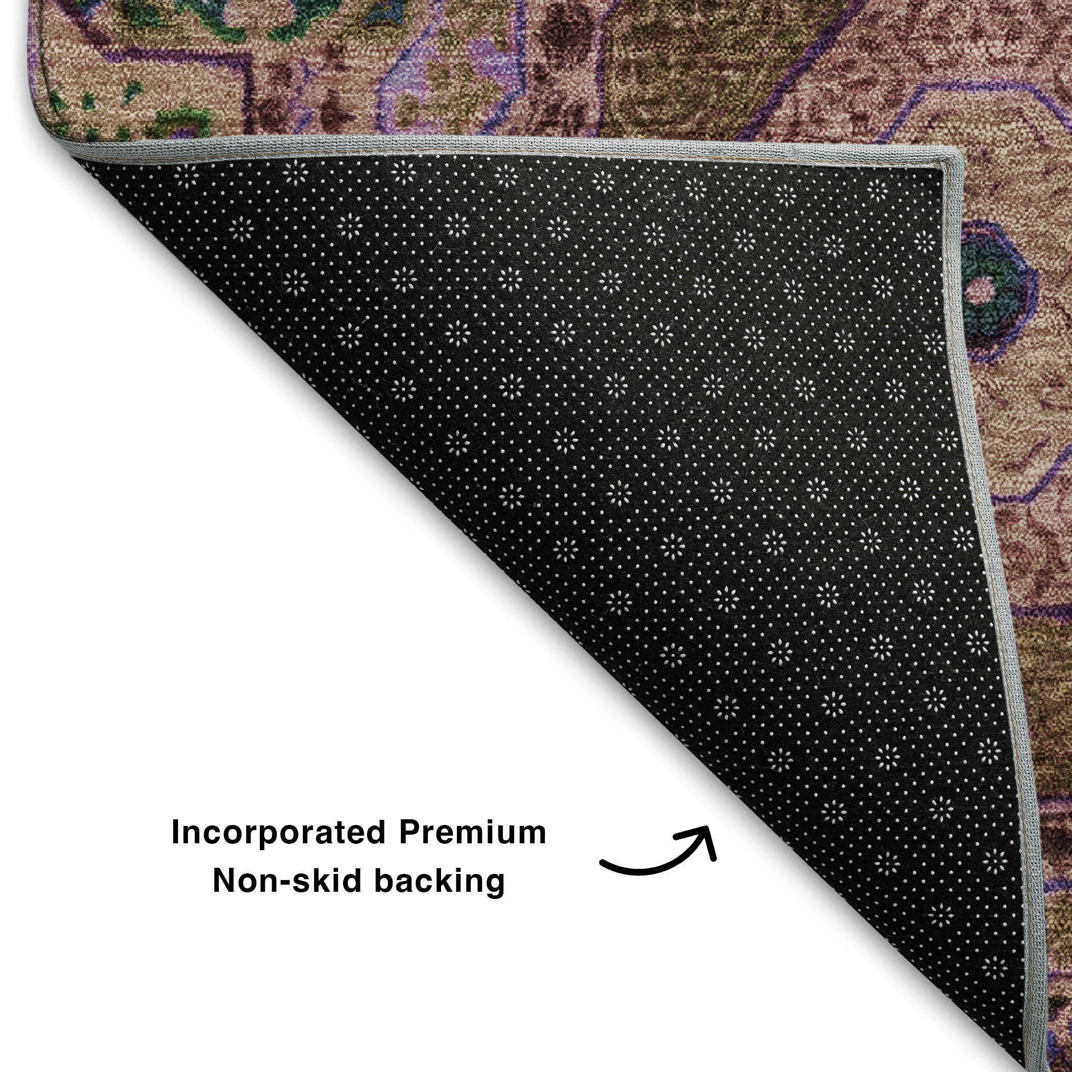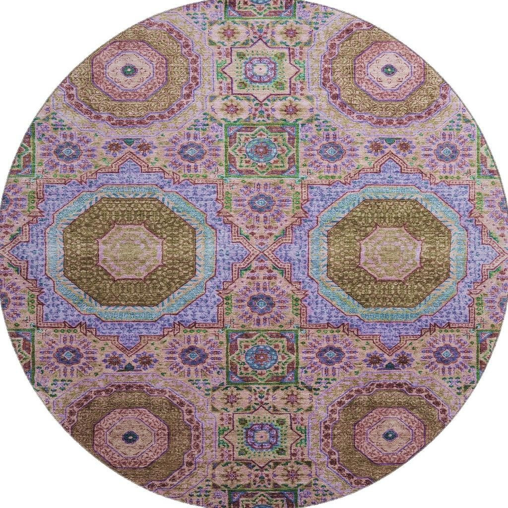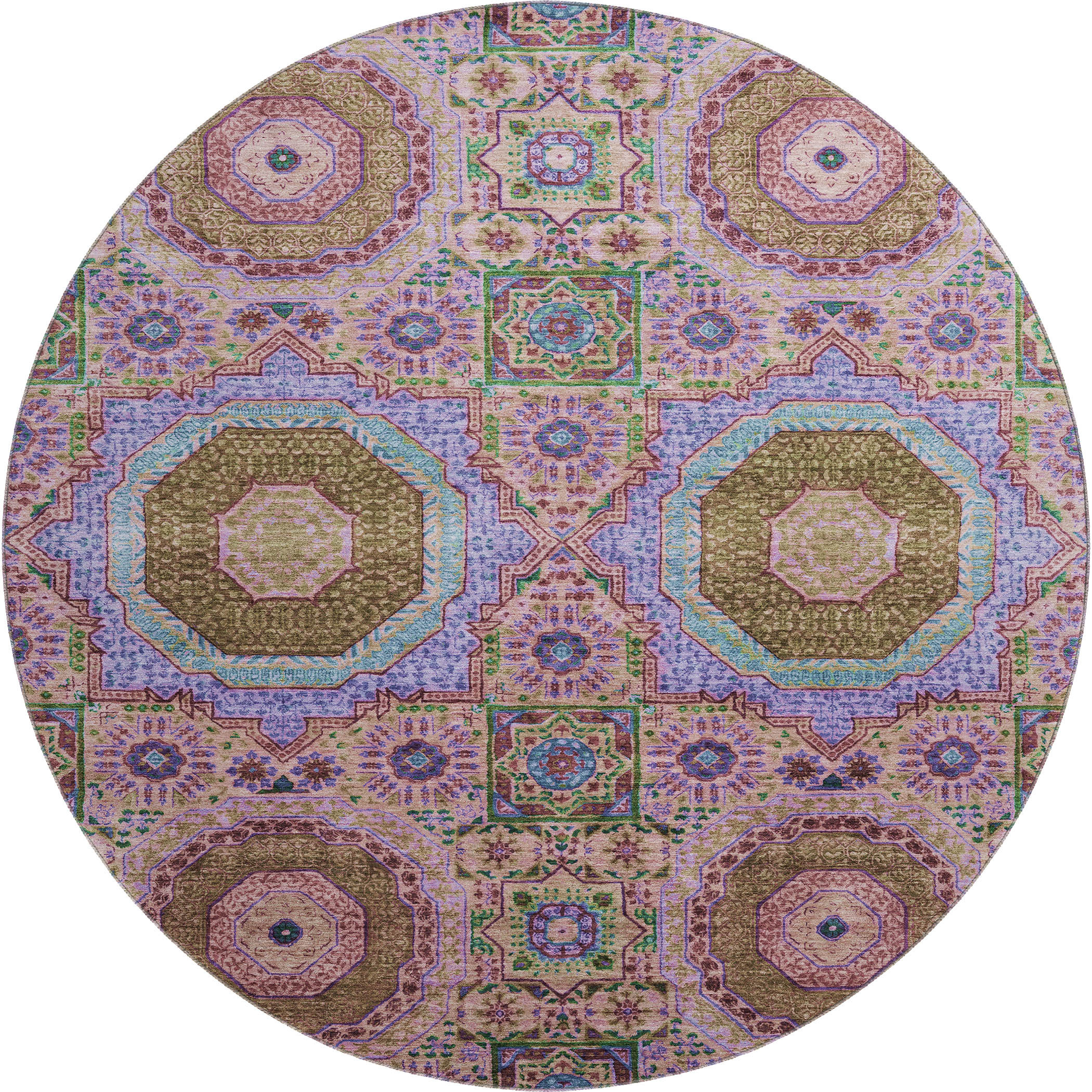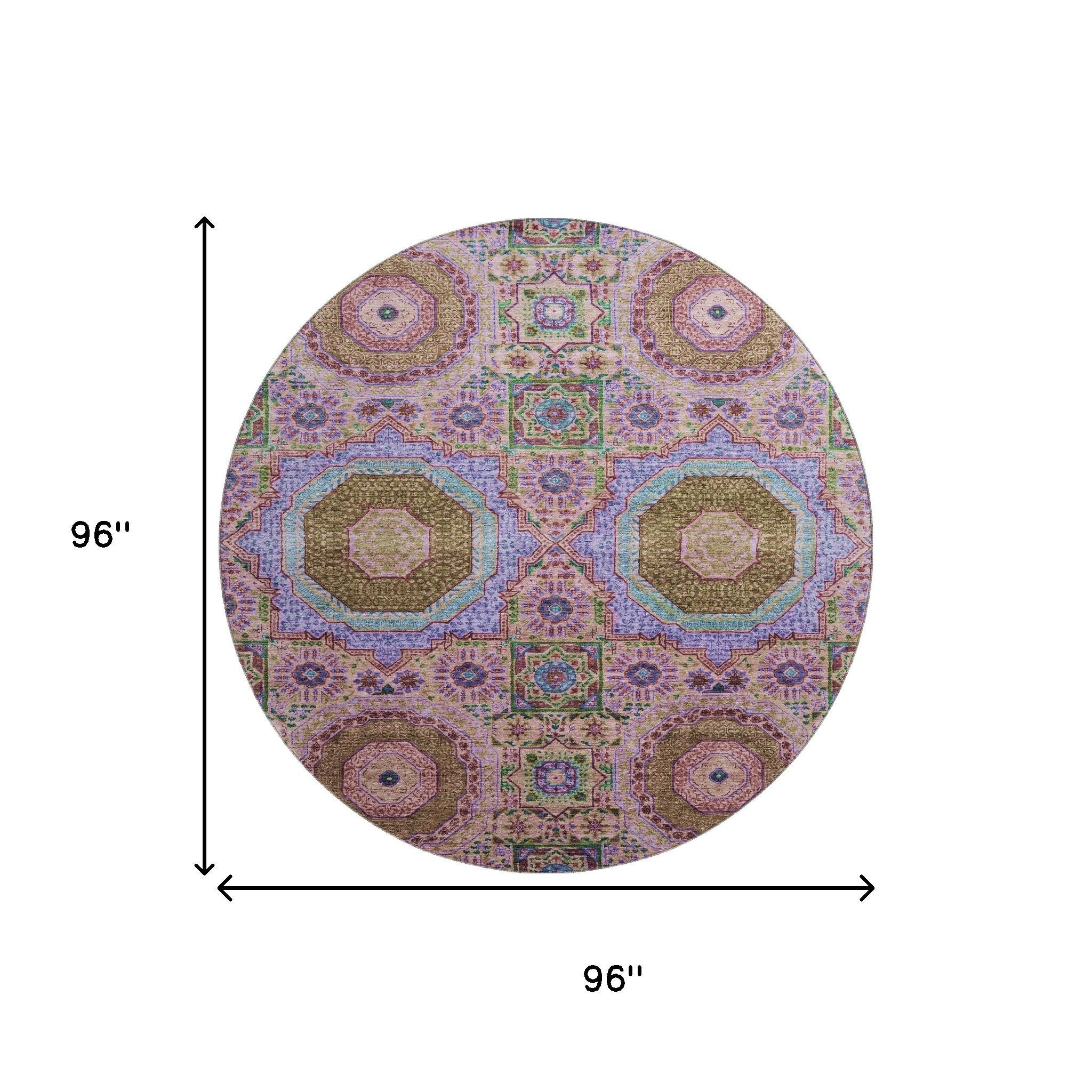 This 8-foot pink teal and taupe medallion washable round rug with uv protection, is a great way to add warmth to a room. Ideal for spaces with kids and pets, this rug is stain resistant to help repel dirt and spilled liquids. Built to last, this rug crafted from polyester fibers is known for its durability and long lasting appeal. Rugs are a great way to showcase your style, hide imperfections, warm your home and reduce noise. This larger sized, transitional styled rug is ready to create a focal point or statement piece in your room. 96.00-inch h x 96.00-inch w x 0.39-inch d.