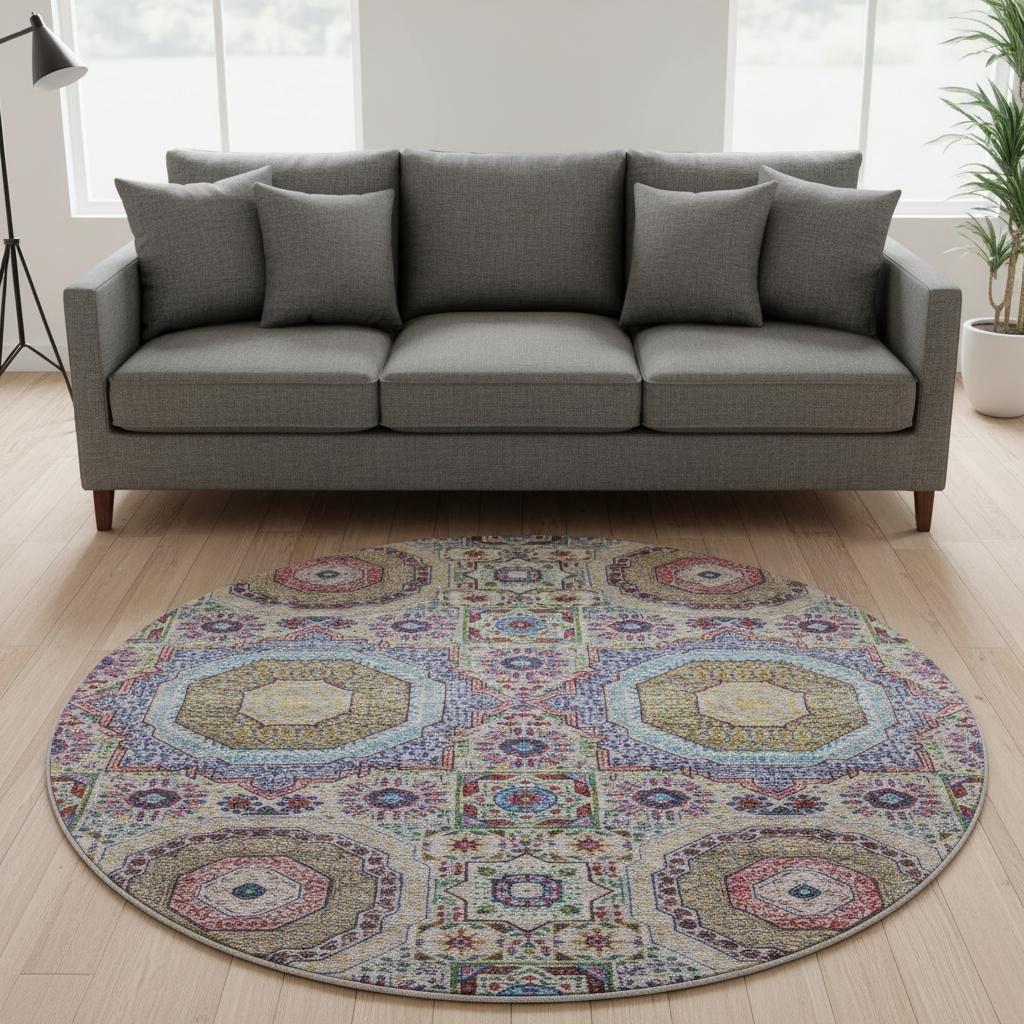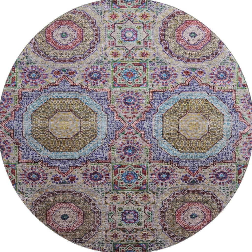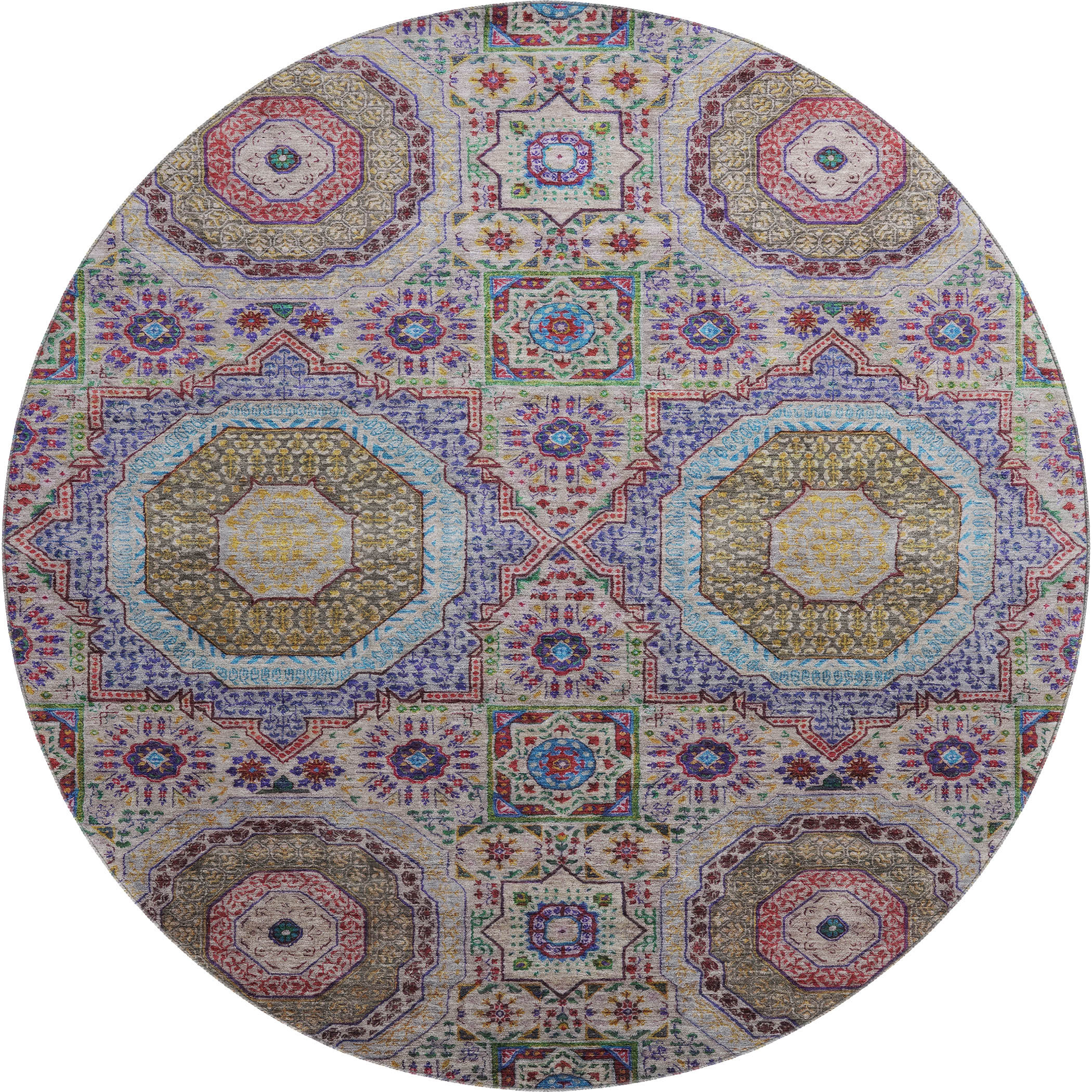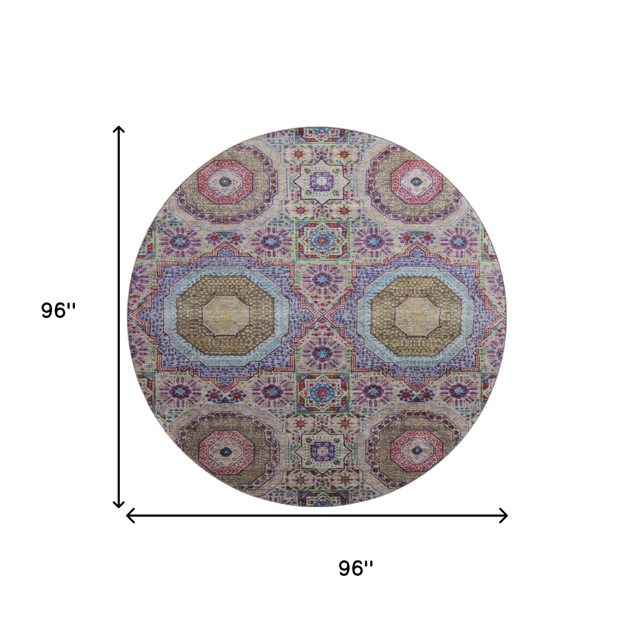 Add some artistry to your room with this 8-foot purple teal and red medallion washable round rug with uv protection. Ideal for spaces with kids and pets, this rug is stain resistant to help repel dirt and spilled liquids. Built to last, this rug crafted from polyester fibers is known for its durability and long lasting appeal. Rugs are a great way to showcase your style, hide imperfections, warm your home and reduce noise. This larger sized, transitional styled rug is ready to create a focal point or statement piece in your room. 96.00-inch h x 96.00-inch w x 0.39-inch d.