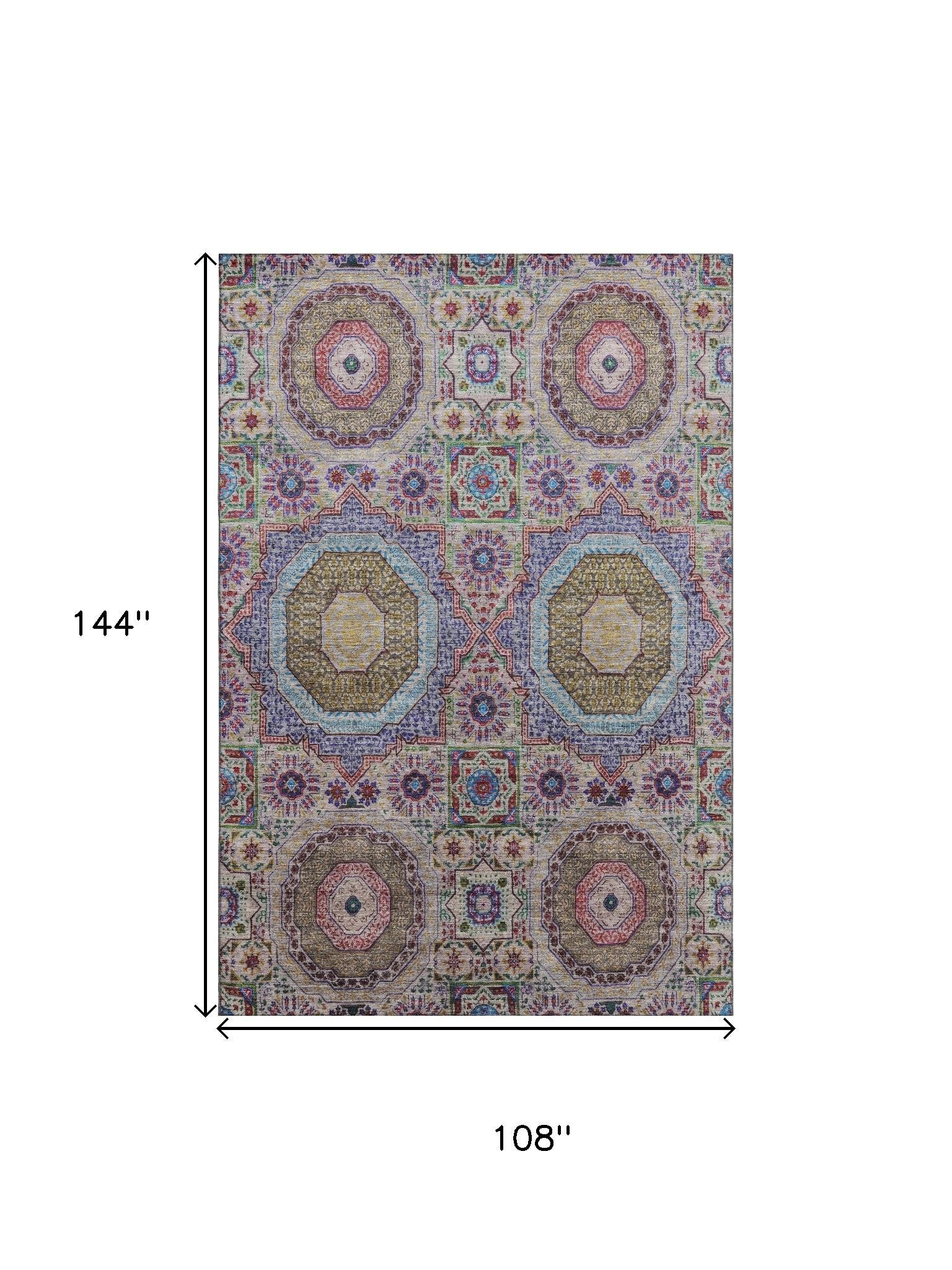 Add some artistry to your room with this 9-foot x 12-foot purple teal and red medallion washable area rug with uv protection. Ideal for spaces with kids and pets, this rug is stain resistant to help repel dirt and spilled liquids. Built to last, this rug crafted from polyester fibers is known for its durability and long lasting appeal. Rugs are a great way to showcase your style, hide imperfections, warm your home and reduce noise. This larger sized, transitional styled rug is ready to create a focal point or statement piece in your room. 108.00-inch h x 144.00-inch w x 0.39-inch d.