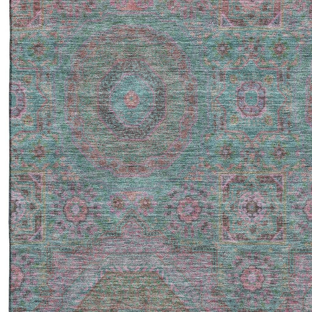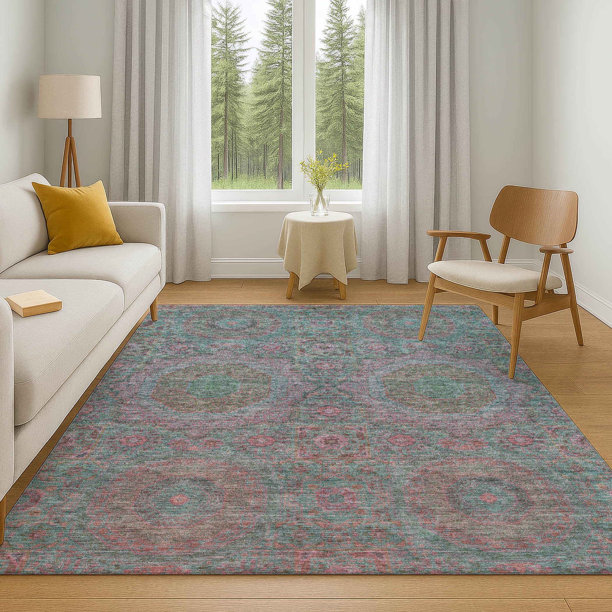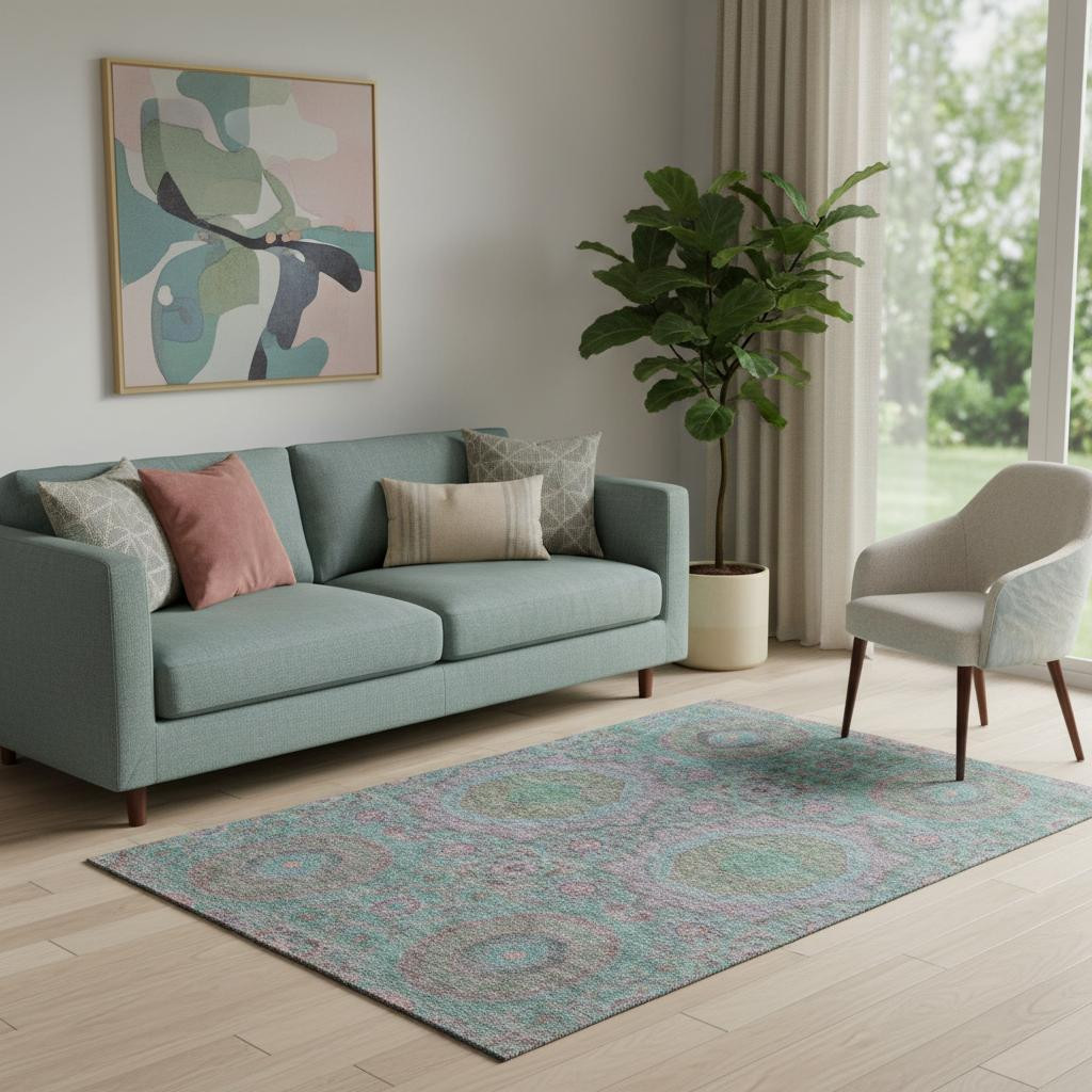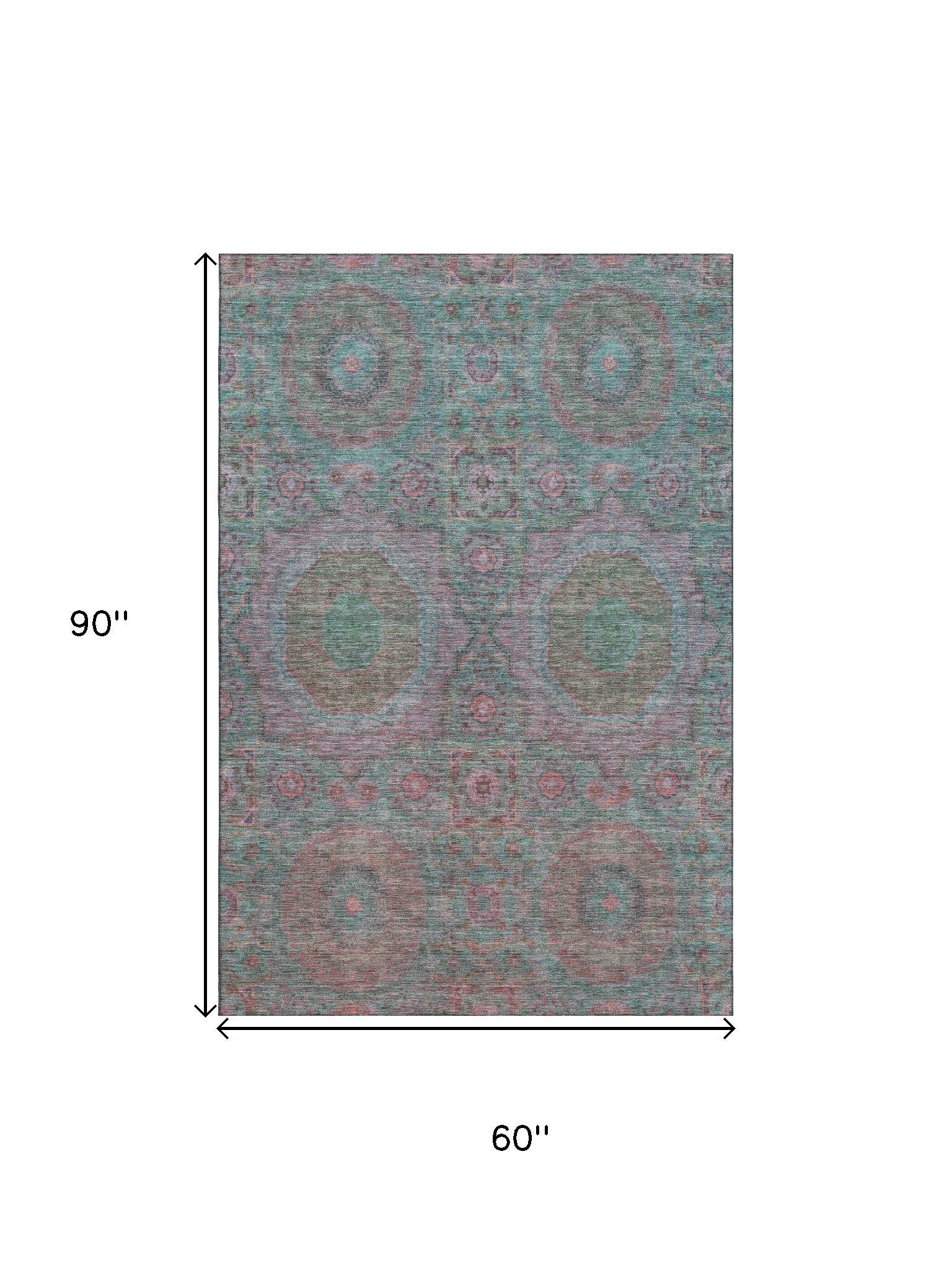 Add some artistry to your room with this 5-foot x 8-foot teal and blush medallion washable area rug with uv protection. Ideal for spaces with kids and pets, this rug is stain resistant to help repel dirt and spilled liquids. Built to last, this rug crafted from polyester fibers is known for its durability and long lasting appeal. Rugs are a great way to showcase your style, hide imperfections, warm your home and reduce noise. This larger sized, transitional styled rug is ready to create a focal point or statement piece in your room. 60.00-inch h x 90.00-inch w x 0.39-inch d.