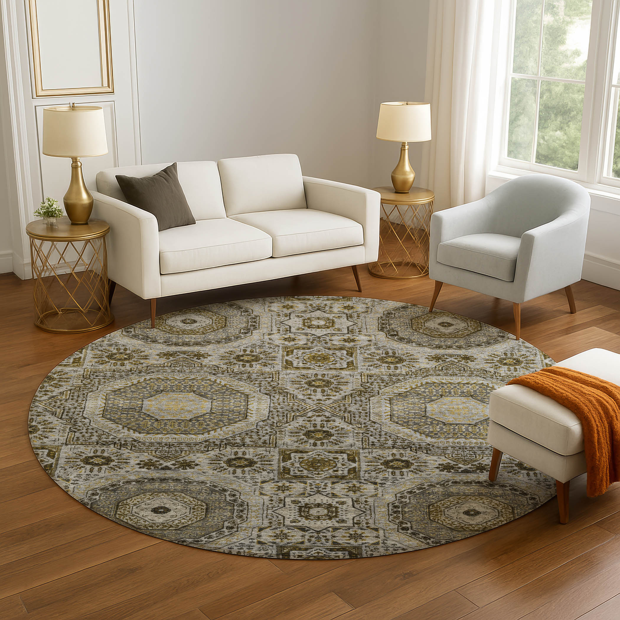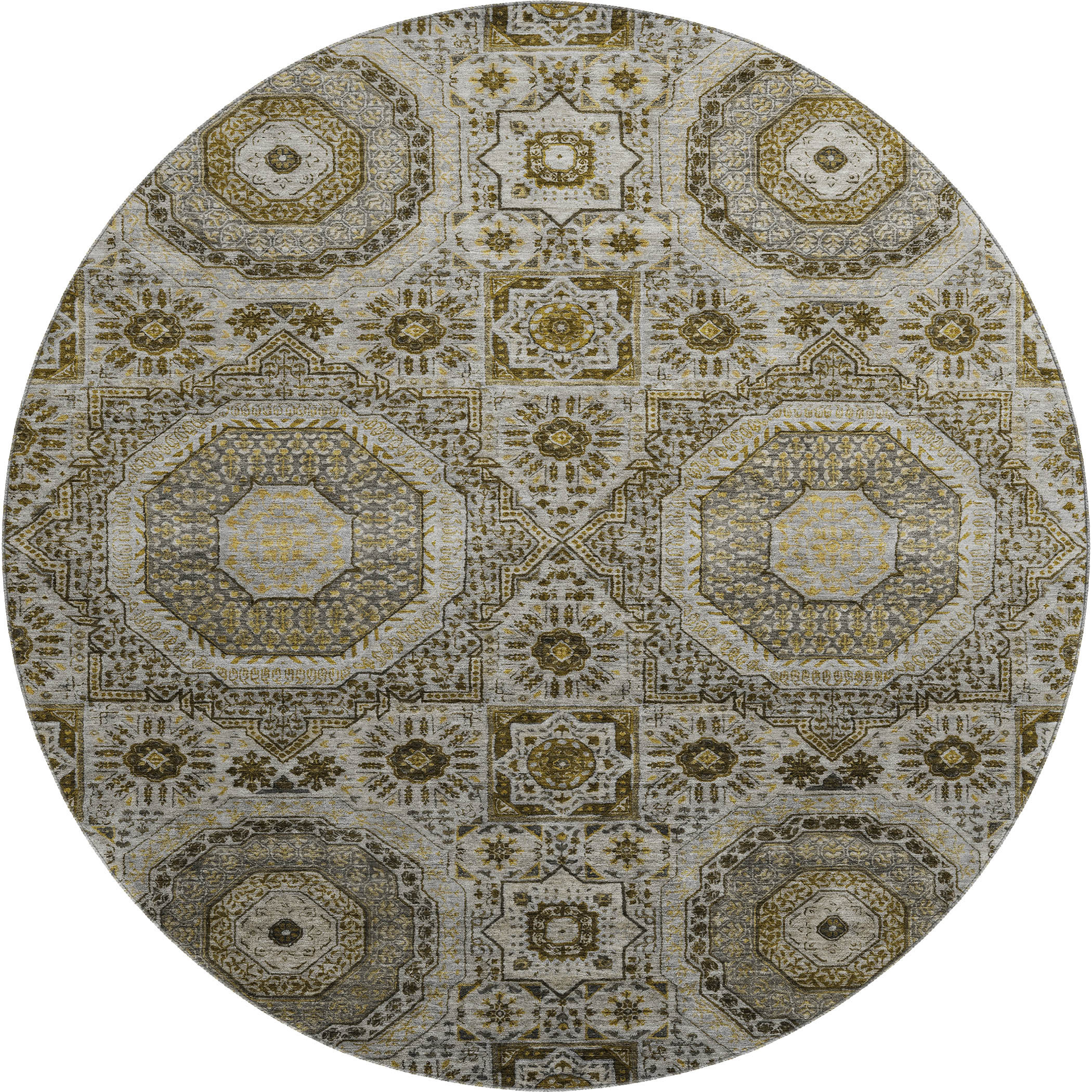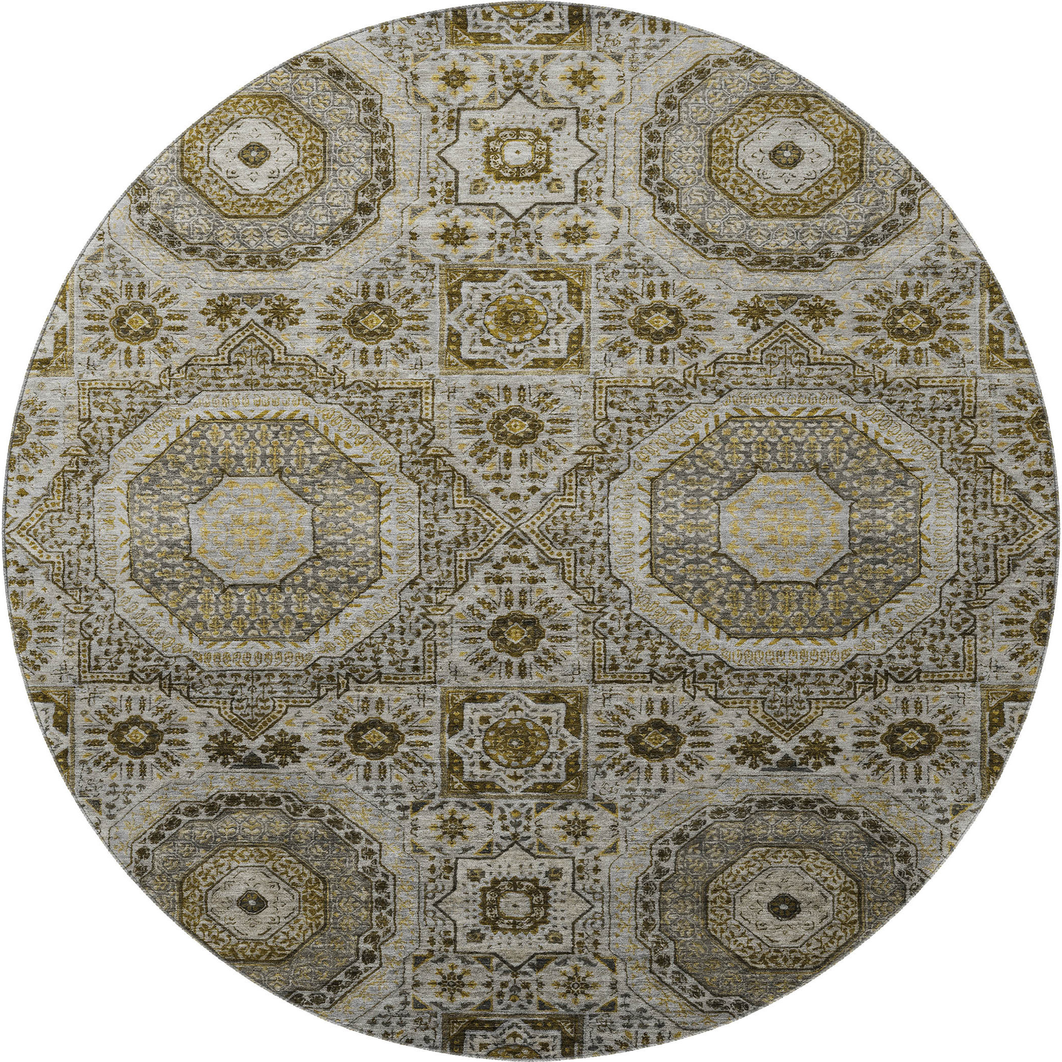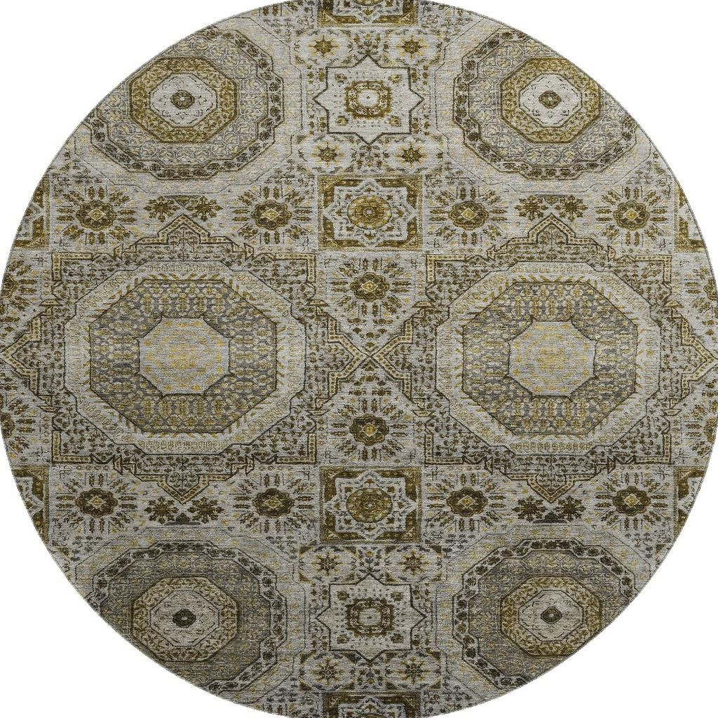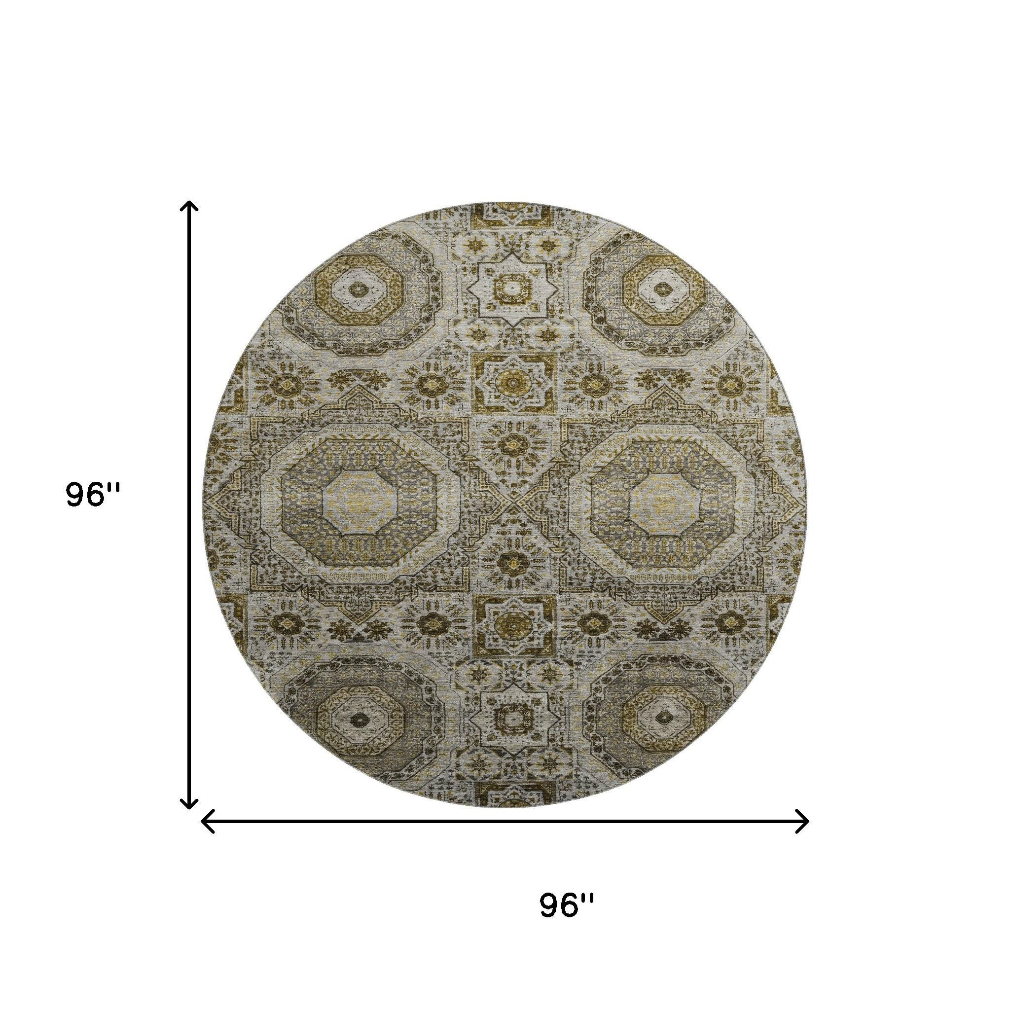 Add some artistry to your room with this 8-foot taupe ivory and gold medallion washable round rug with uv protection. Ideal for spaces with kids and pets, this rug is stain resistant to help repel dirt and spilled liquids. Built to last, this rug crafted from polyester fibers is known for its durability and long lasting appeal. Rugs are a great way to showcase your style, hide imperfections, warm your home and reduce noise. This larger sized, transitional styled rug is ready to create a focal point or statement piece in your room. 96.00-inch h x 96.00-inch w x 0.39-inch d.