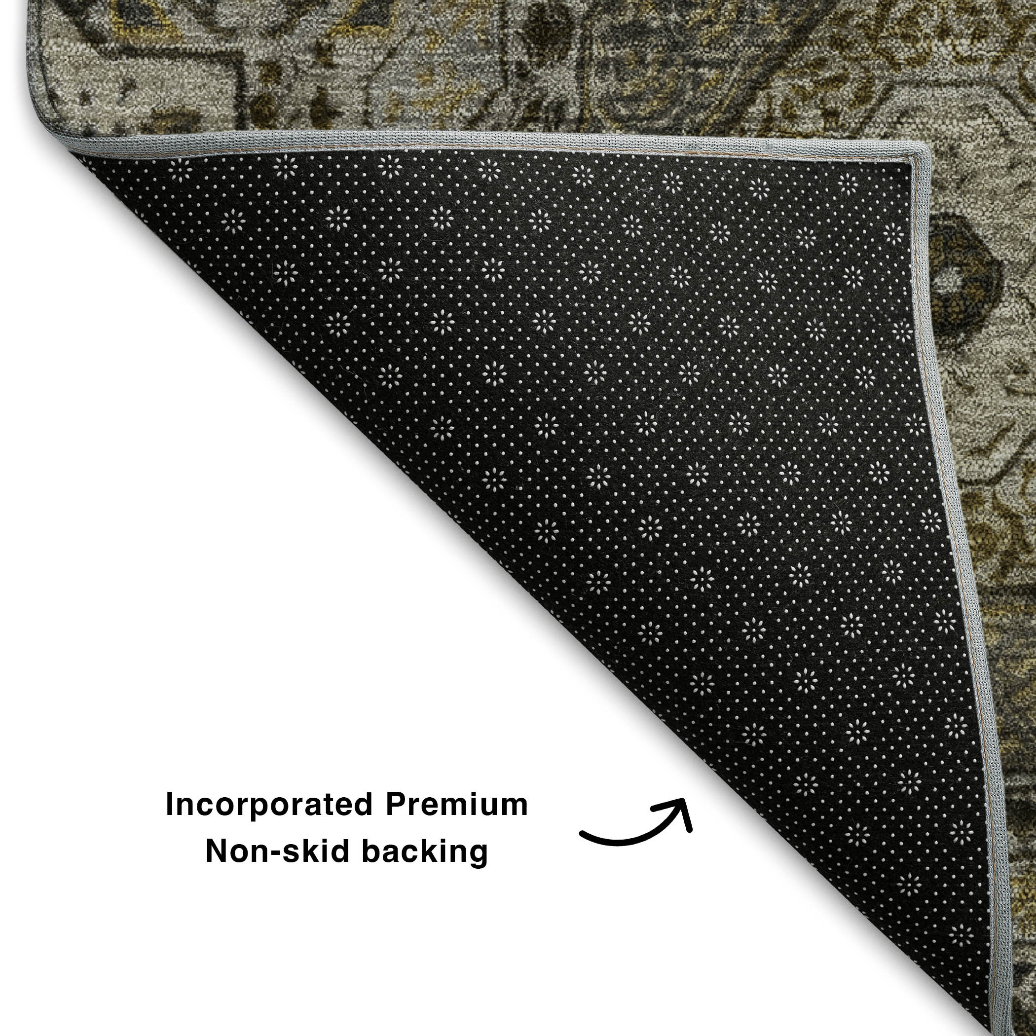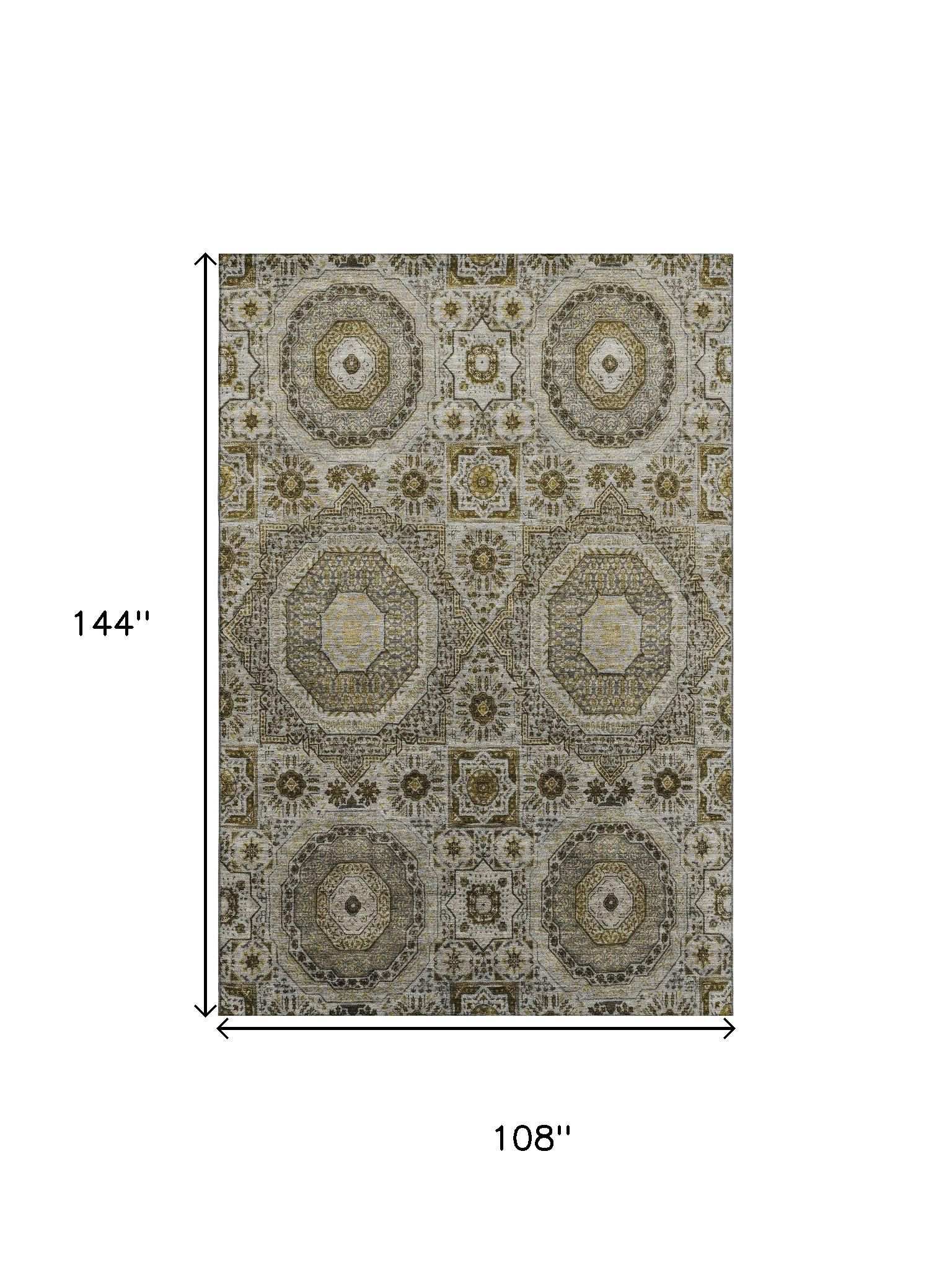 Add great coloration and comfortable texture to your space with this 9-foot x 12-foot taupe ivory and gold medallion washable area rug with uv protection. Ideal for spaces with kids and pets, this rug is stain resistant to help repel dirt and spilled liquids. Built to last, this rug crafted from polyester fibers is known for its durability and long lasting appeal. Rugs are a great way to showcase your style, hide imperfections, warm your home and reduce noise. This larger sized, transitional styled rug is ready to create a focal point or statement piece in your room. 108.00-inch h x 144.00-inch w x 0.39-inch d.