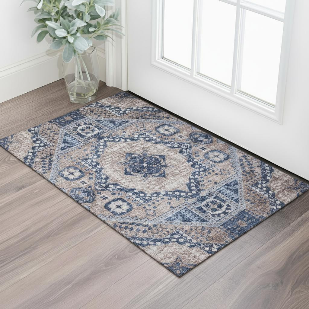 This 3-foot x 5-foot brown blue and beige diamond washable area rug with uv protection, is a great way to add warmth to a room. Ideal for spaces with kids and pets, this rug is stain resistant to help repel dirt and spilled liquids. Built to last, this rug crafted from polyester fibers is known for its durability and long lasting appeal. Rugs are a great way to showcase your style, hide imperfections, warm your home and reduce noise. This smaller sized, transitional styled rug is just what you need for your walkway, bedside, in front of door, cabinet, refrigerator, or chair. 36.00-inch h x 60.00-inch w x 0.39-inch d.