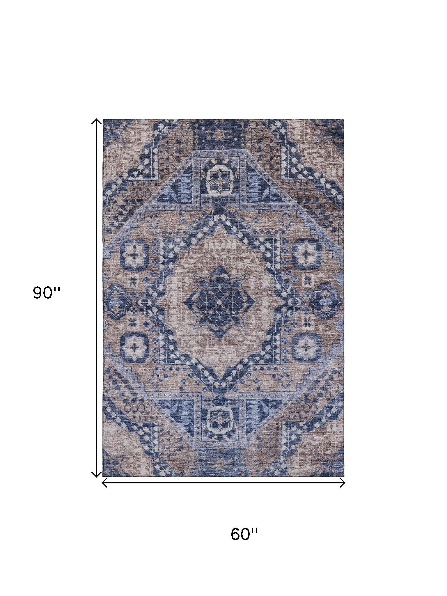 Add great coloration and comfortable texture to your space with this 5-foot x 8-foot brown blue and beige diamond washable area rug with uv protection. Ideal for spaces with kids and pets, this rug is stain resistant to help repel dirt and spilled liquids. Built to last, this rug crafted from polyester fibers is known for its durability and long lasting appeal. Rugs are a great way to showcase your style, hide imperfections, warm your home and reduce noise. This larger sized, transitional styled rug is ready to create a focal point or statement piece in your room. 60.00-inch h x 90.00-inch w x 0.39-inch d.