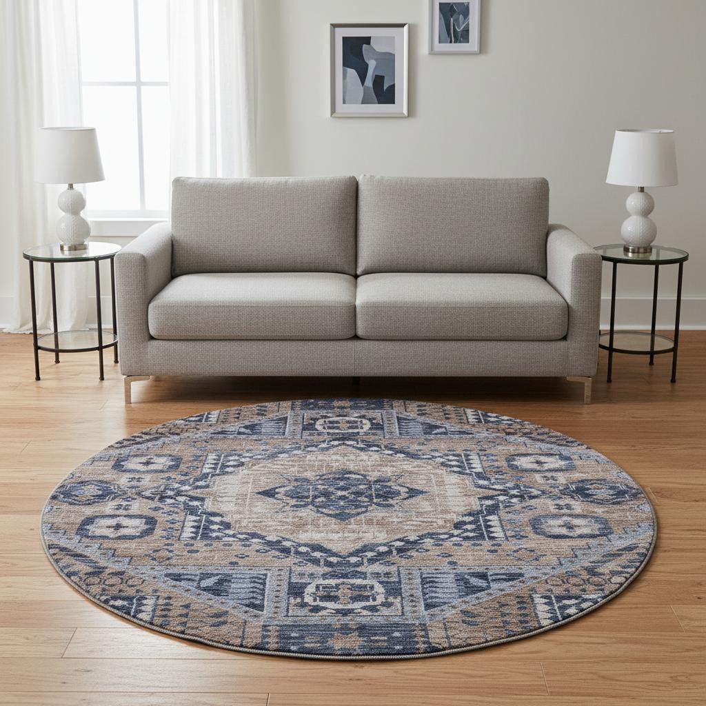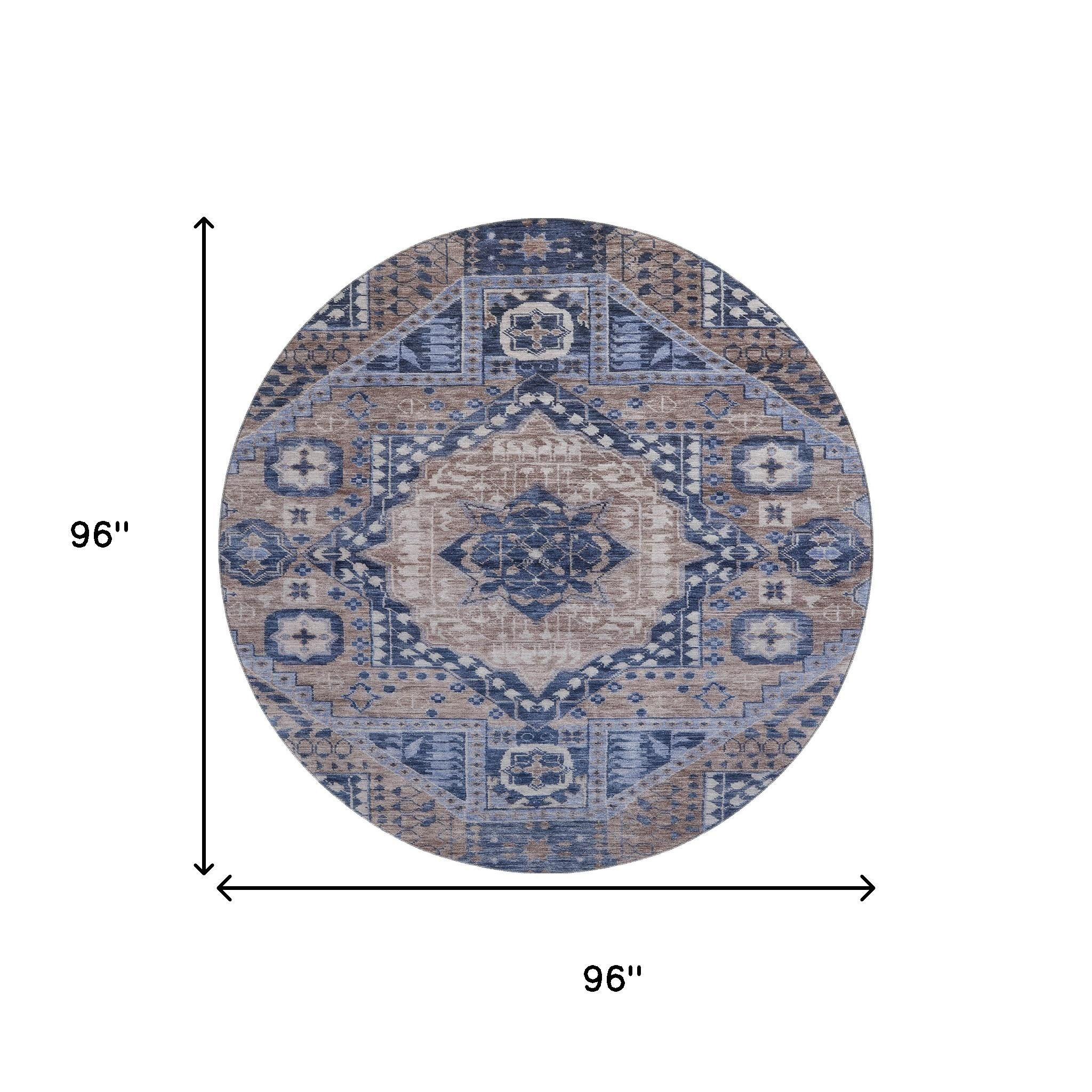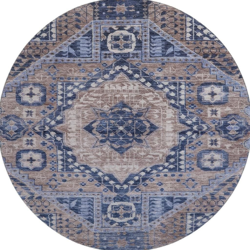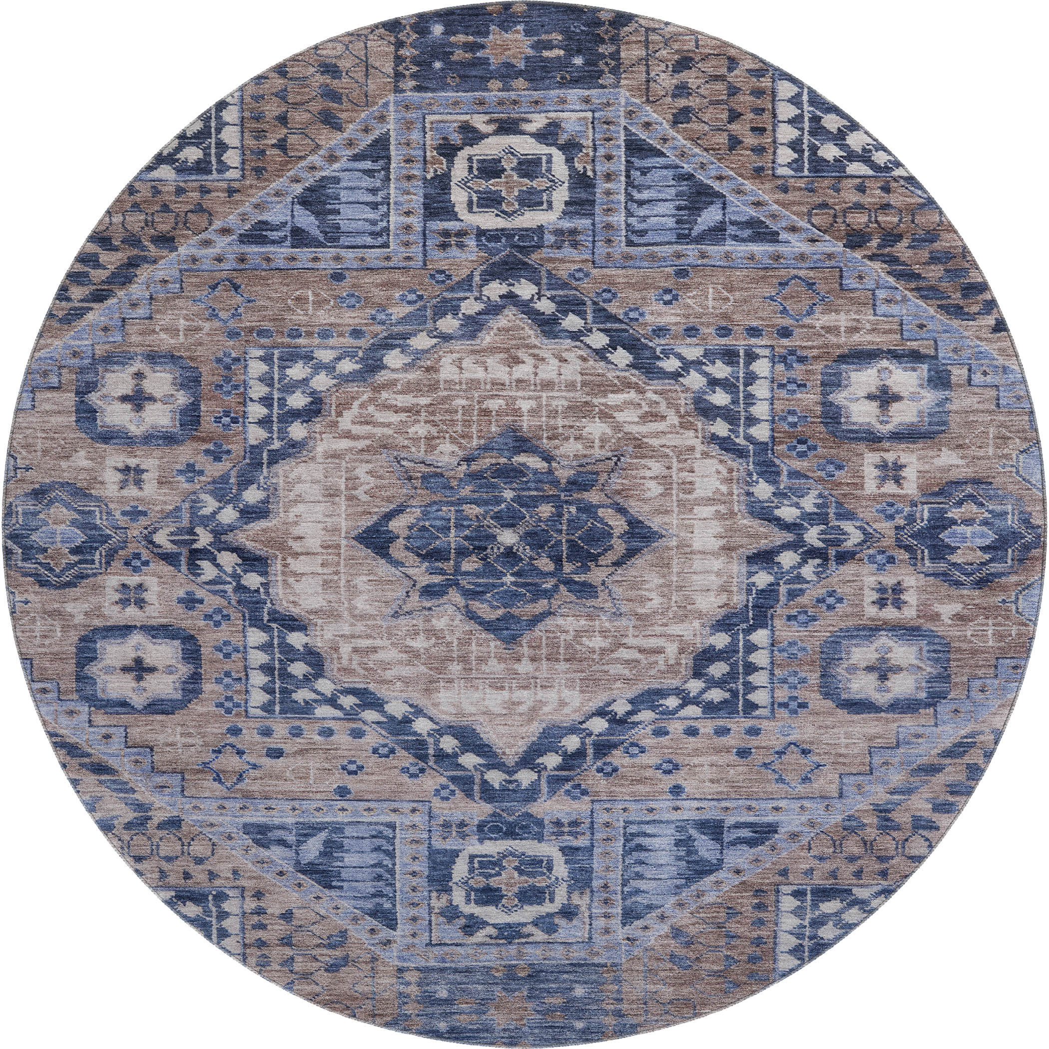 Set an inviting tone in your space with this 8-foot brown blue and beige diamond washable round rug with uv protection. Ideal for spaces with kids and pets, this rug is stain resistant to help repel dirt and spilled liquids. Built to last, this rug crafted from polyester fibers is known for its durability and long lasting appeal. Rugs are a great way to showcase your style, hide imperfections, warm your home and reduce noise. This larger sized, transitional styled rug is ready to create a focal point or statement piece in your room. 96.00-inch h x 96.00-inch w x 0.39-inch d.