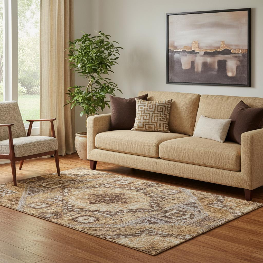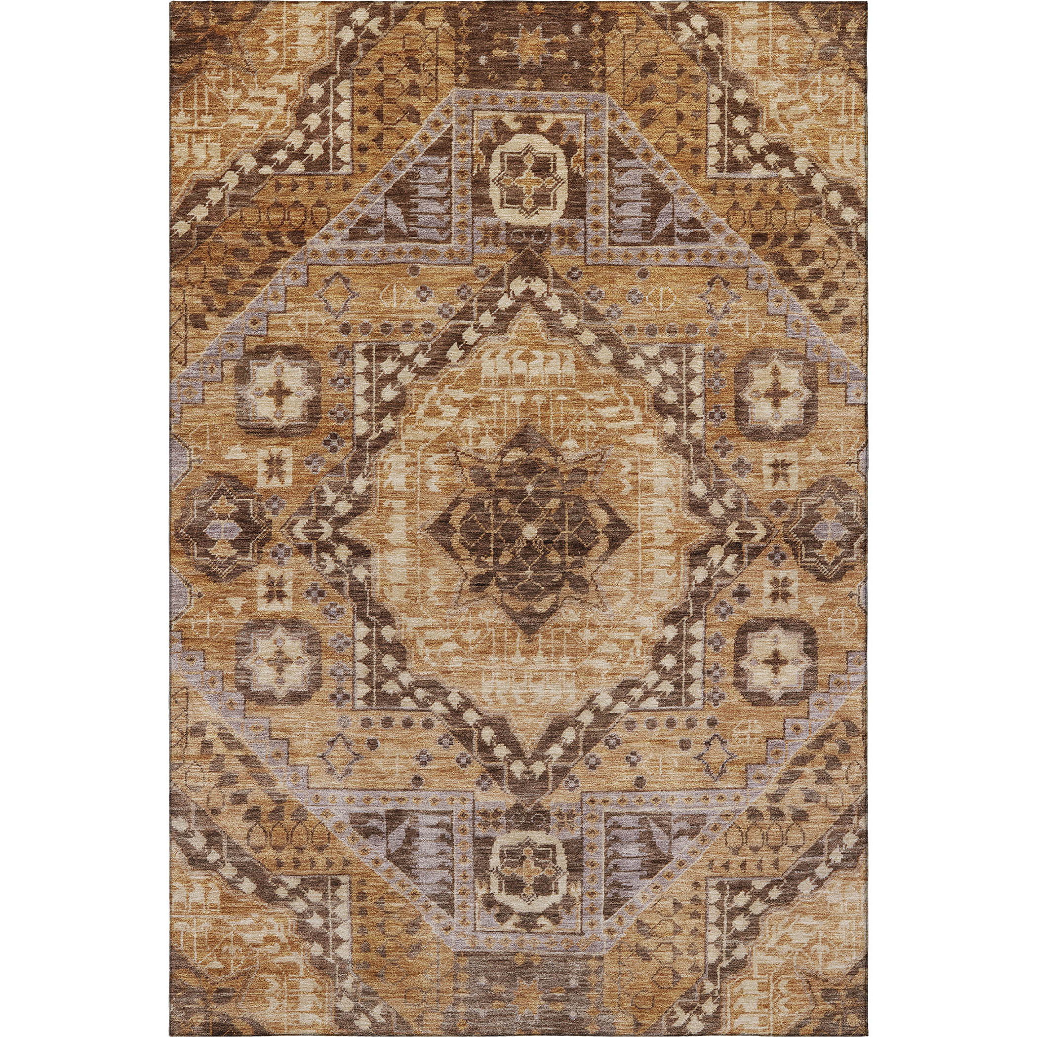 This 5-foot x 8-foot copper beige and gray diamond washable area rug with uv protection, is a great way to add warmth to a room. Ideal for spaces with kids and pets, this rug is stain resistant to help repel dirt and spilled liquids. Built to last, this rug crafted from polyester fibers is known for its durability and long lasting appeal. Rugs are a great way to showcase your style, hide imperfections, warm your home and reduce noise. This larger sized, transitional styled rug is ready to create a focal point or statement piece in your room. 60.00-inch h x 90.00-inch w x 0.39-inch d.