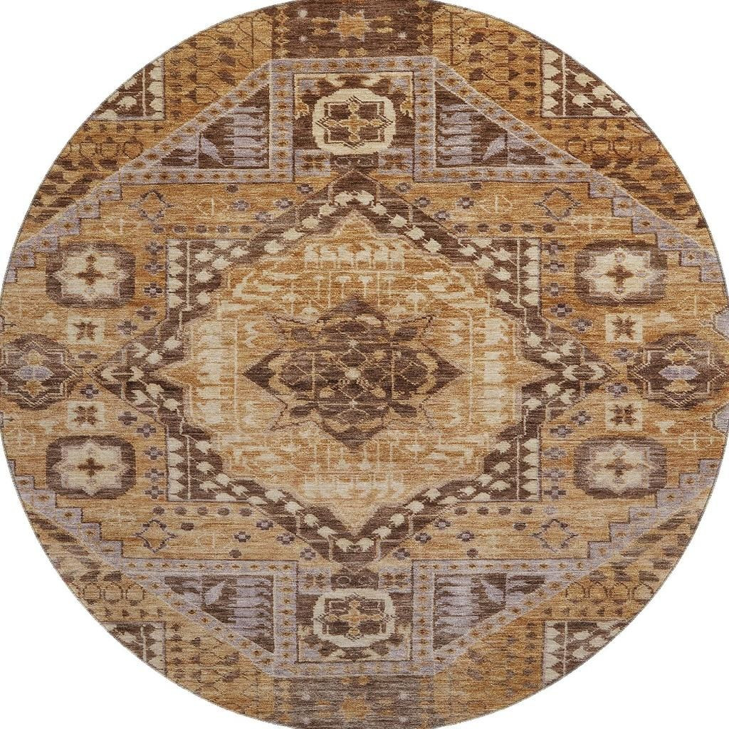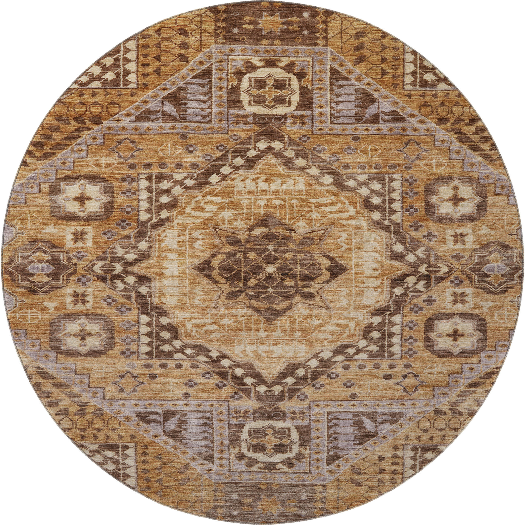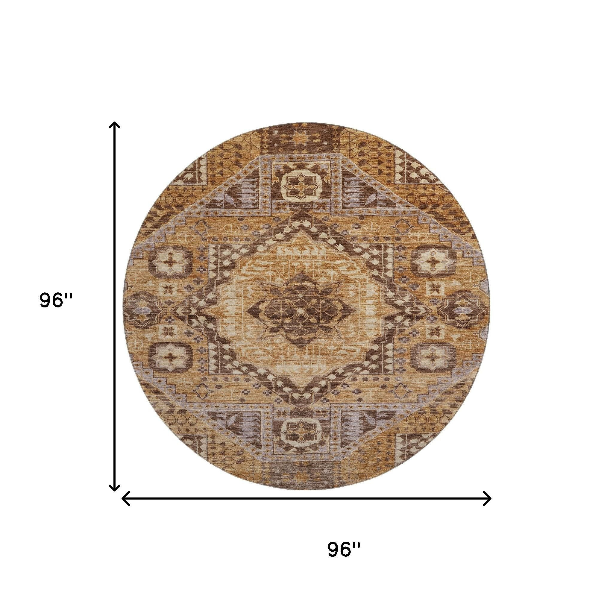 Add some artistry to your room with this 8-foot copper beige and gray diamond washable round rug with uv protection. Ideal for spaces with kids and pets, this rug is stain resistant to help repel dirt and spilled liquids. Built to last, this rug crafted from polyester fibers is known for its durability and long lasting appeal. Rugs are a great way to showcase your style, hide imperfections, warm your home and reduce noise. This larger sized, transitional styled rug is ready to create a focal point or statement piece in your room. 96.00-inch h x 96.00-inch w x 0.39-inch d.