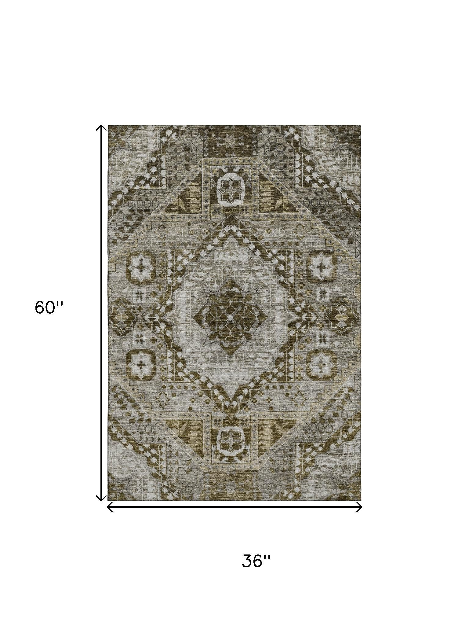 Add great coloration and comfortable texture to your space with this 3-foot x 5-foot khaki ivory and brown diamond washable area rug with uv protection. Ideal for spaces with kids and pets, this rug is stain resistant to help repel dirt and spilled liquids. Built to last, this rug crafted from polyester fibers is known for its durability and long lasting appeal. Rugs are a great way to showcase your style, hide imperfections, warm your home and reduce noise. This smaller sized, transitional styled rug is just what you need for your walkway, bedside, in front of door, cabinet, refrigerator, or chair. 36.00-inch h x 60.00-inch w x 0.39-inch d.